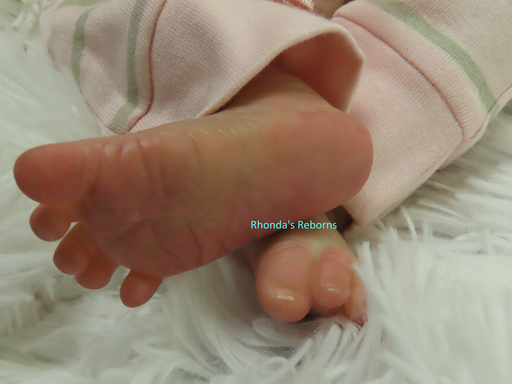 She has full vinyl arms and legs and a flesh colored doe suede cloth body, making her pose-able. Her eyelashes are rooted and sealed inside. Her nails are manicured and sealed. She is hand-painted using many translucent layers of Ultimate Fusion Paint, including subtle veining and mottling, to give her her lifelike appearance and making her one of a kind. She is weighted with fine glass beads and ultra soft fiberfill giving her that cuddly feel of a real baby.