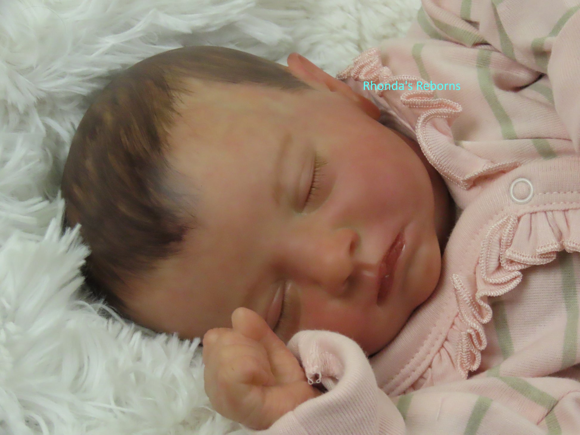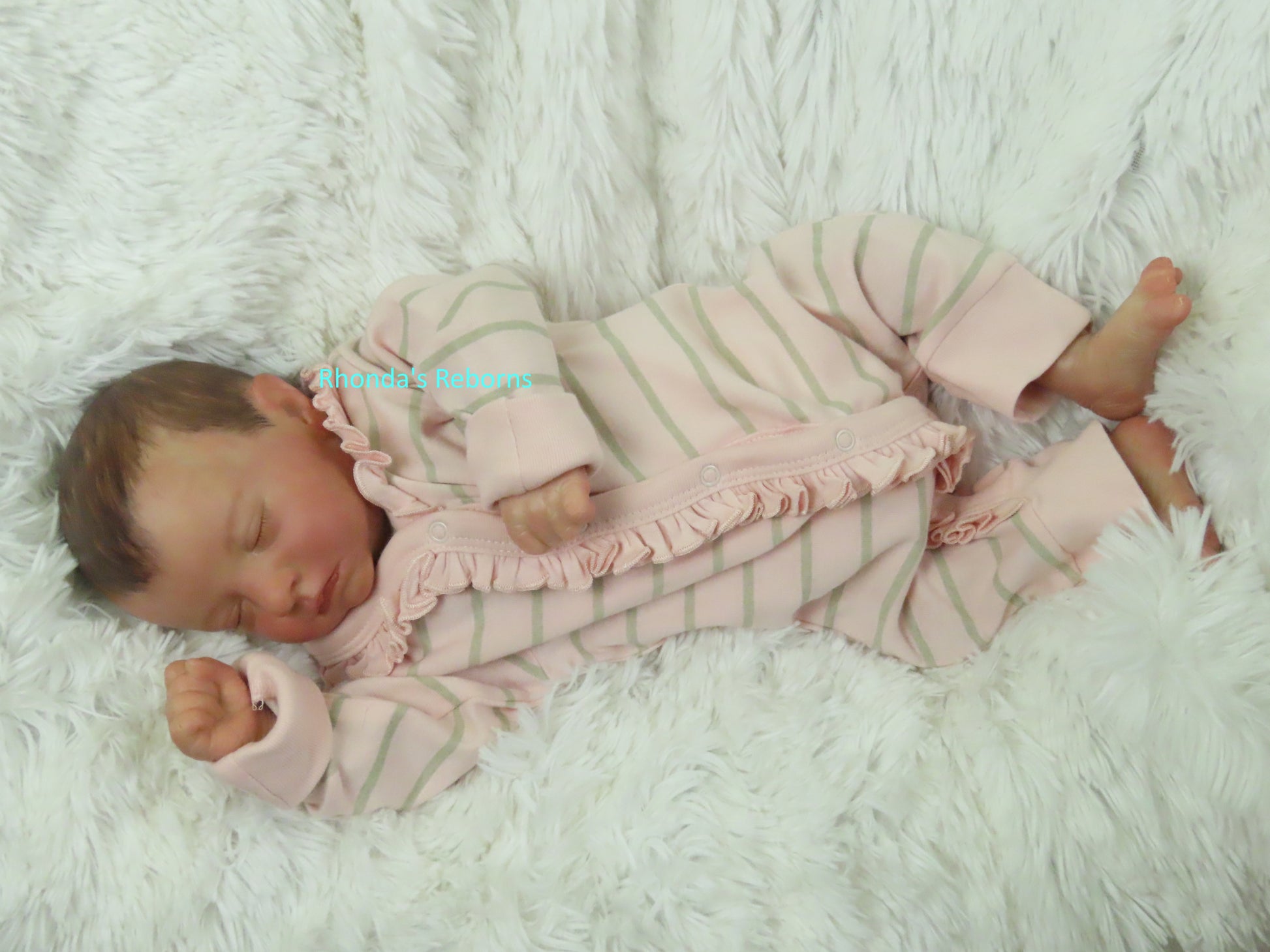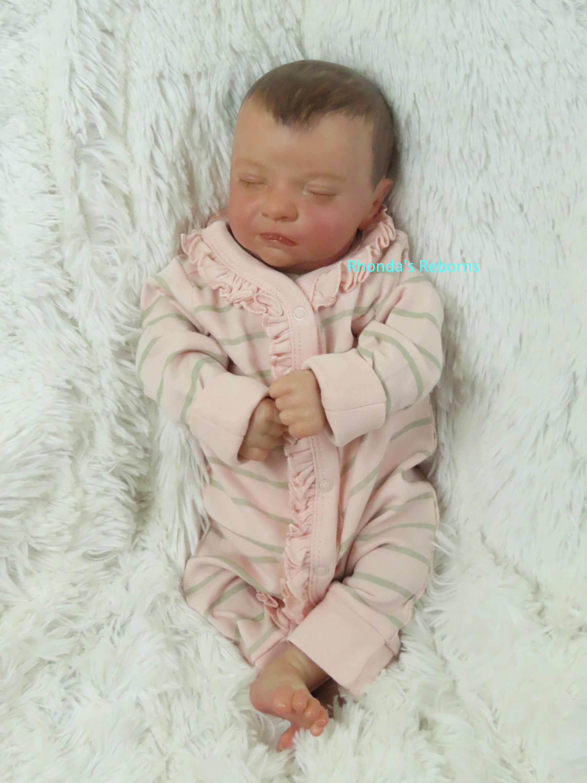 This sweet baby girl was born from the Alyssa Asleep kit, weighs 4 lbs 15 oz, and is 18 inches long. She has painted brown hair and rooted eyelashes. She can wear newborn size clothing.