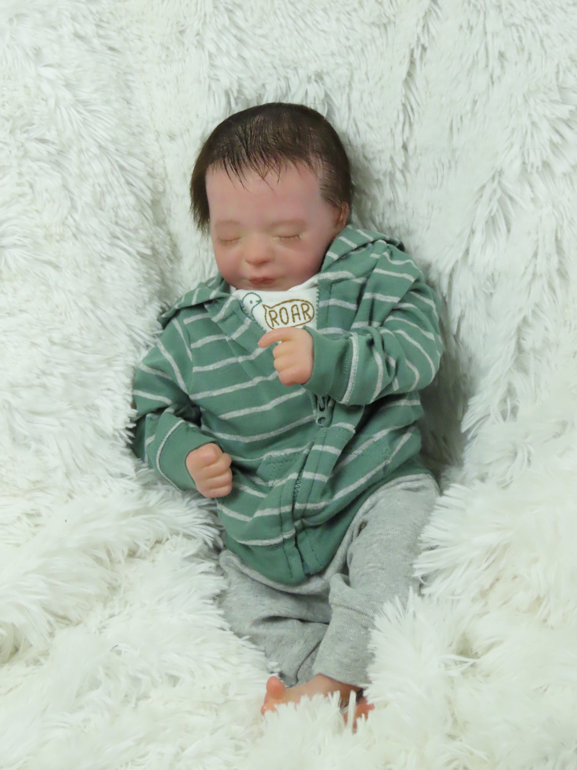 Baby will be reborned by me. He/She will have a Caucasian/White skintone similar to to photos above. He/She will have full vinyl arms and legs, and a flesh colored cloth body, making him/her pose-able. His/her eyelashes will be rooted and sealed inside. His/her nails will be manicured and sealed inside. He/she will be hand-painted with many translucent layers of Ultimate Fusion Paint, including subtle veining and soft mottling, to give him/her his/her lifelike features and making him/her one of a kind. He/she will also be weighted with fine glass beads and ultra soft fiberfill giving him/her that cuddly feel of a real baby