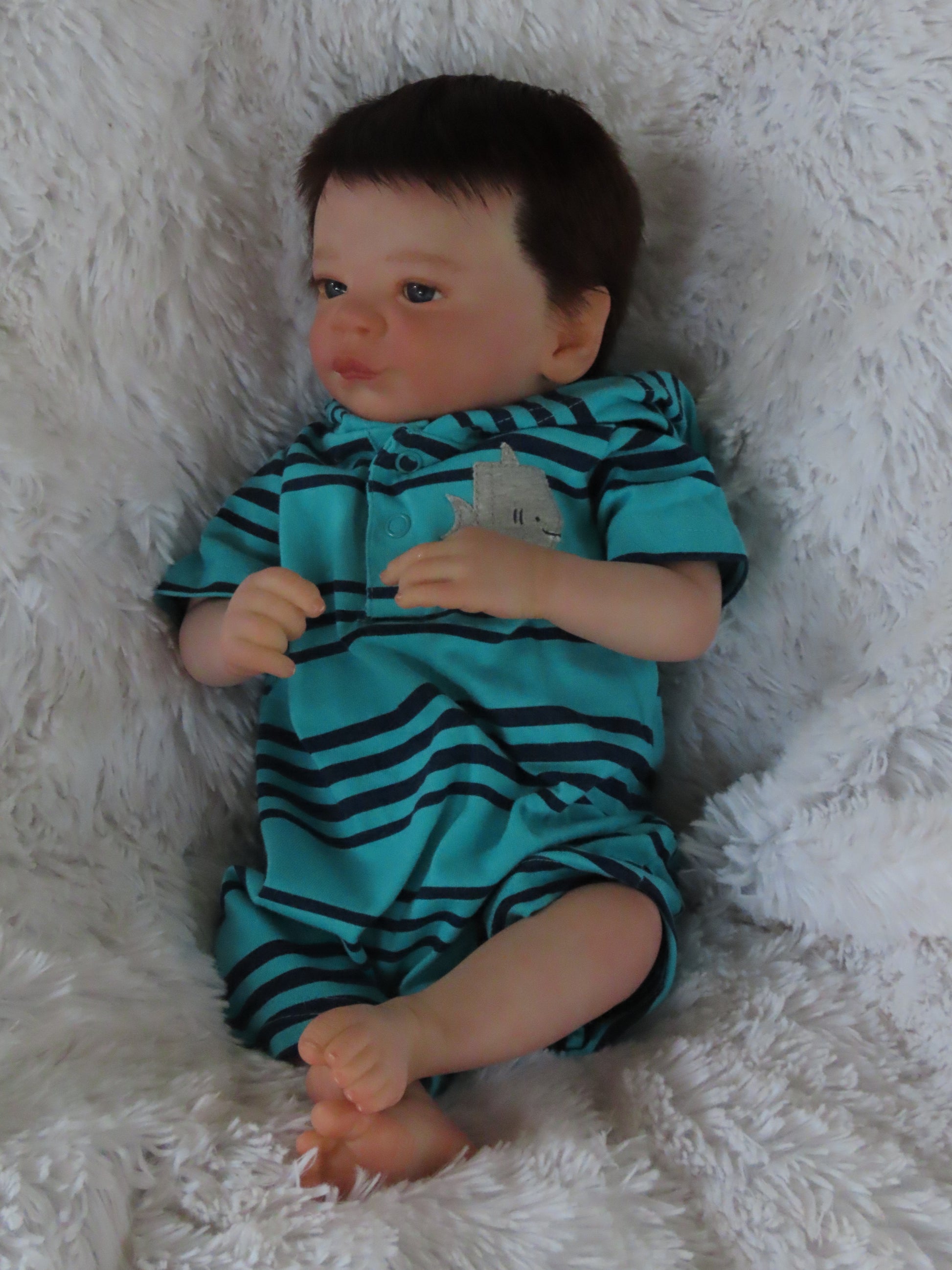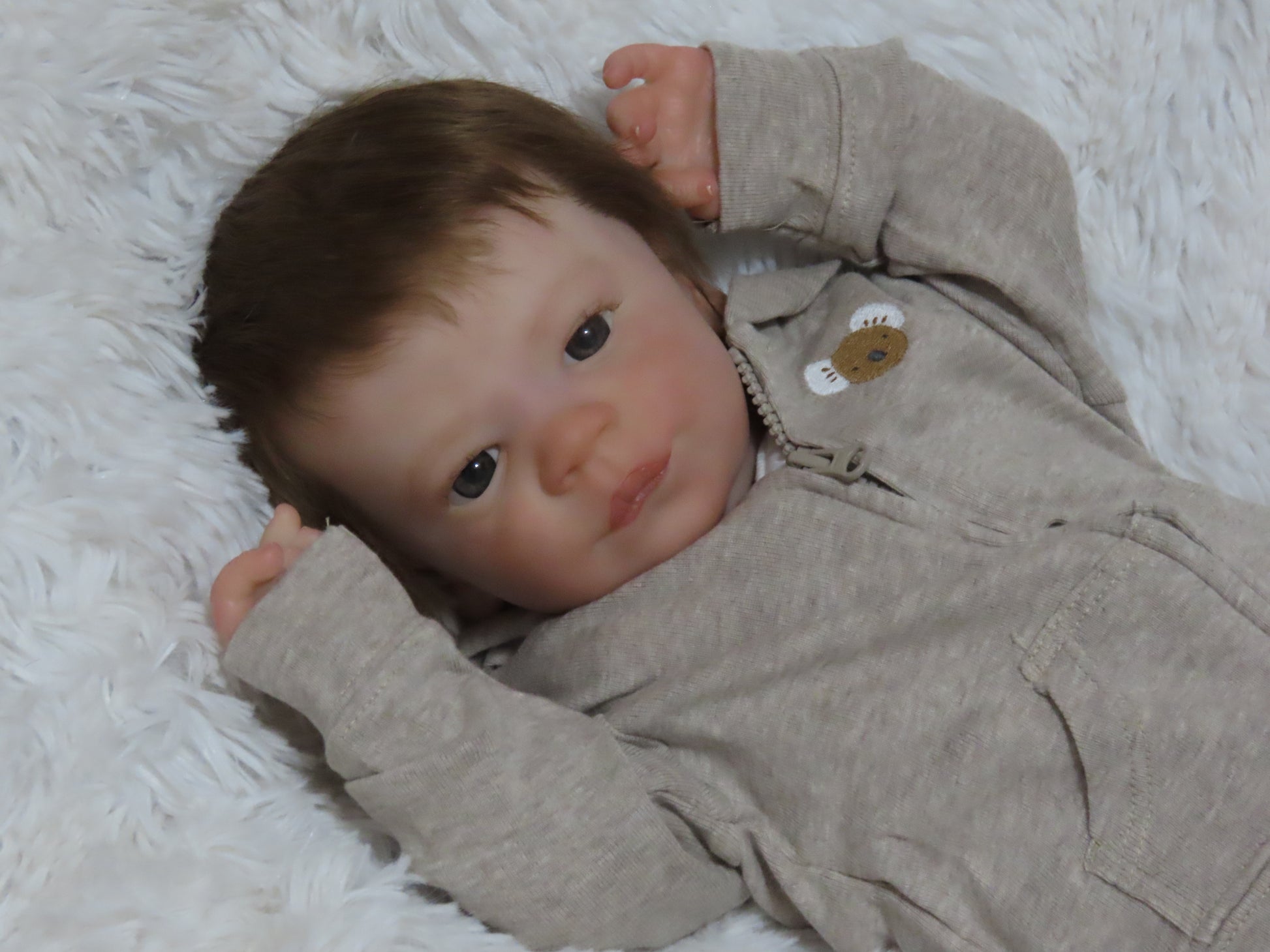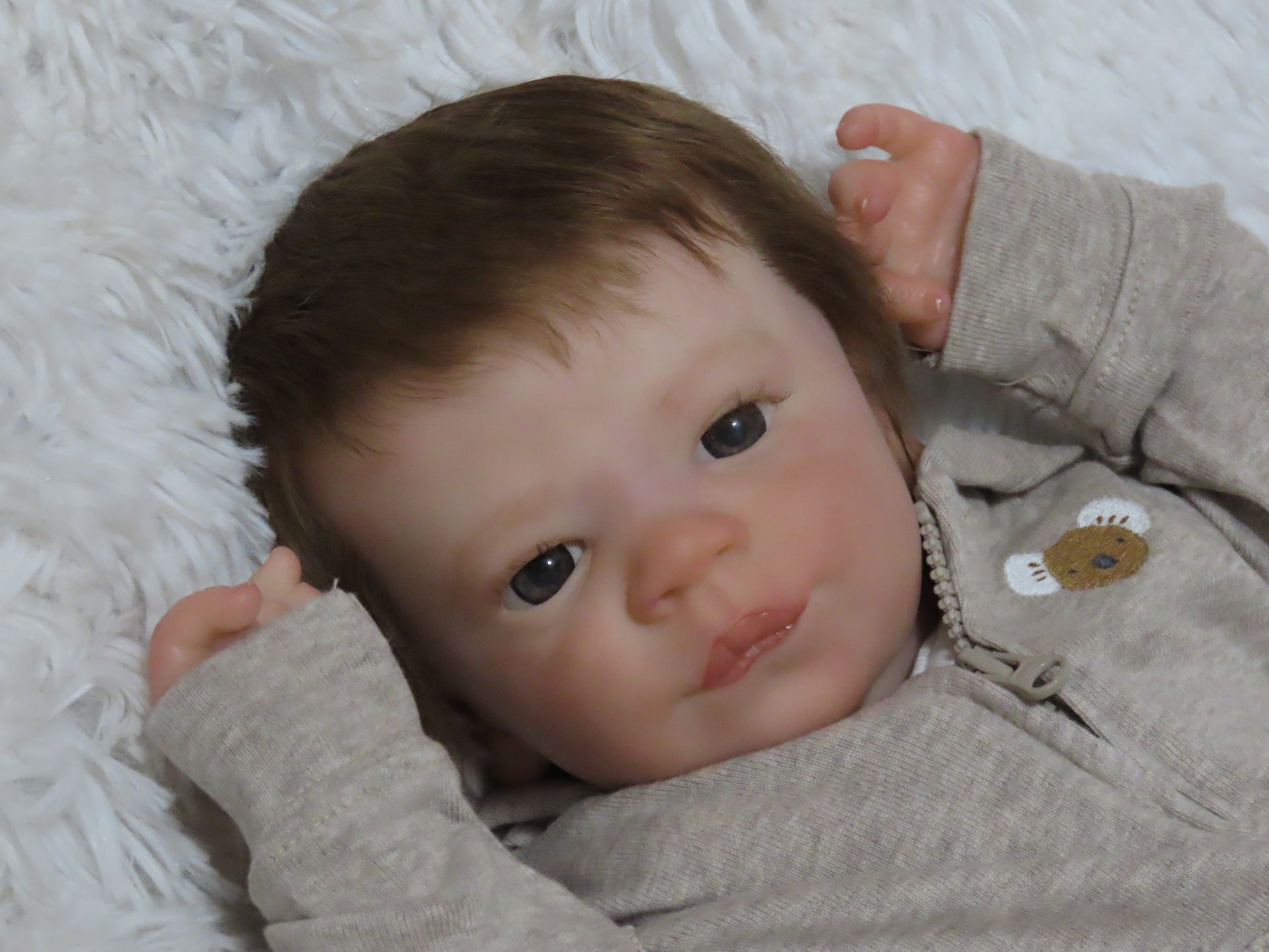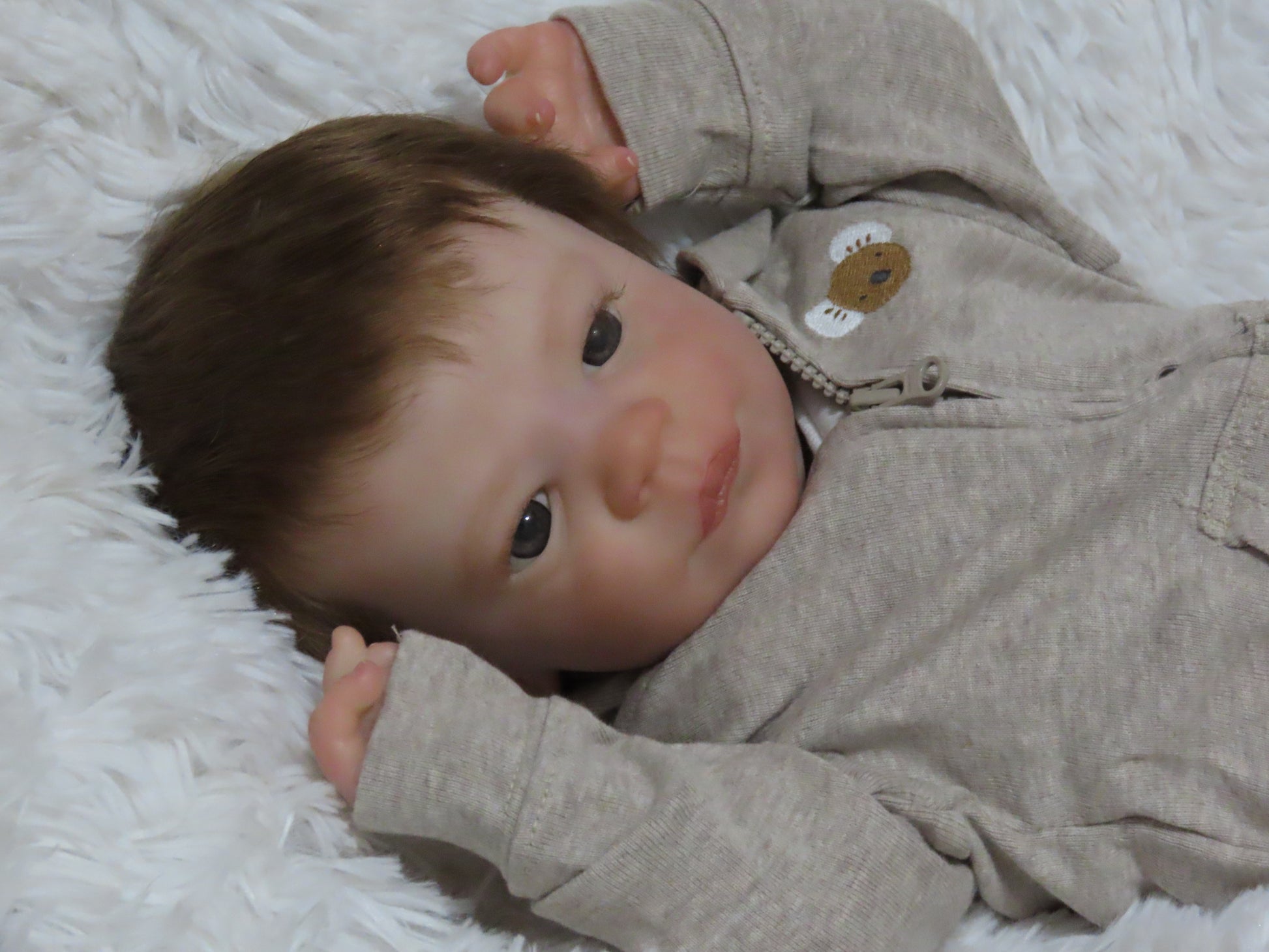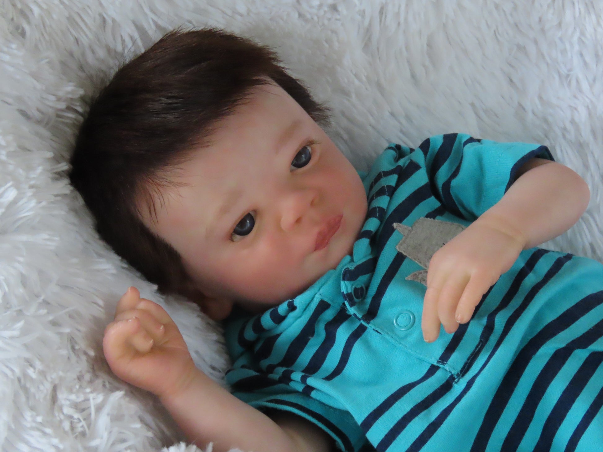 Baby will be reborned by me. He/She will have a Caucasian/White skintone similar to to photos above. He/She will have full vinyl arms and legs, and a flesh colored cloth body, making him/her pose-able. His/her eyelashes will be rooted and sealed inside. His/her nails will be manicured and sealed inside. He/she will be hand-painted with many translucent layers of Ultimate Fusion Paint, including subtle veining and soft mottling, to give him/her his/her lifelike features and making him/her one of a kind. He/she will also be weighted with fine glass beads and ultra soft fiberfill giving him/her that cuddly feel of a real baby