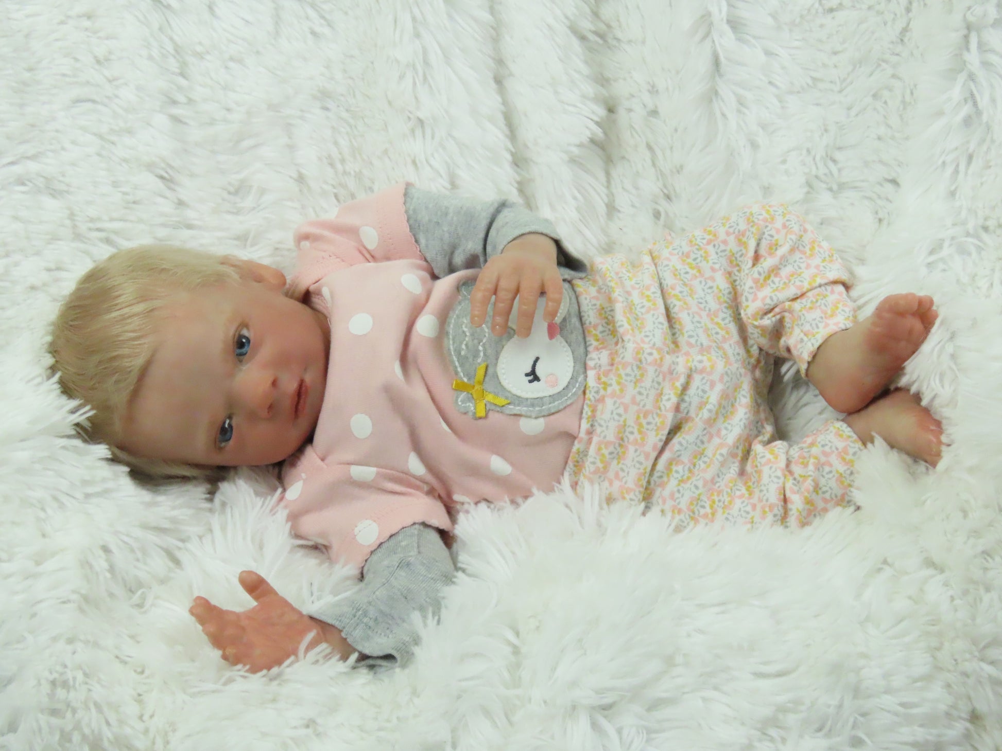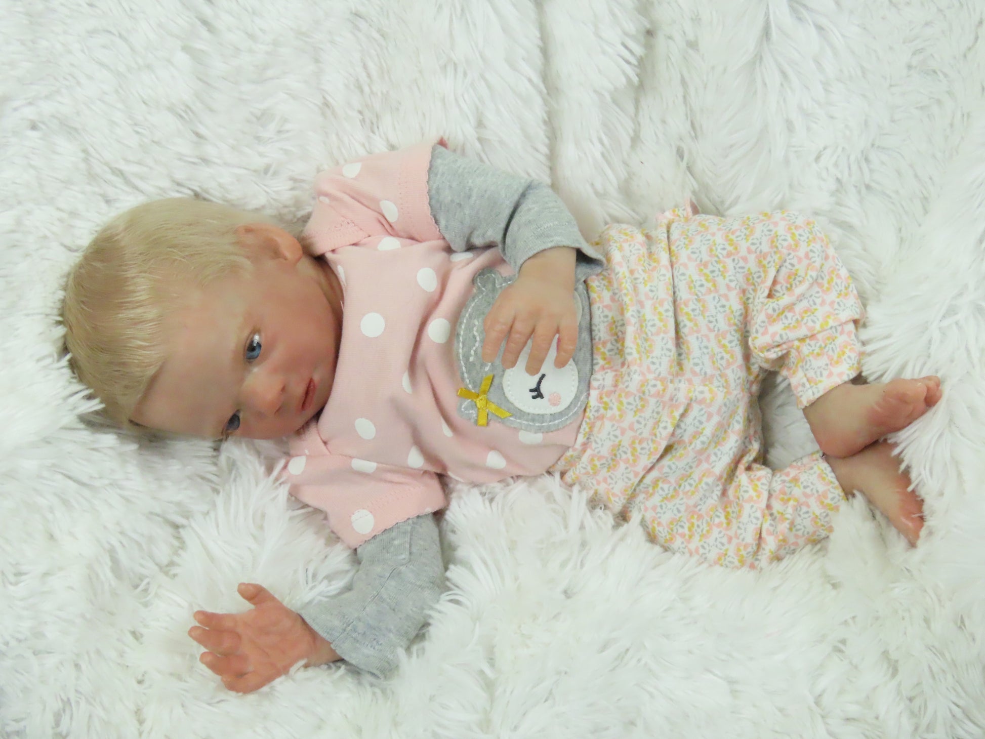 Baby will be reborned by me. He/She will have a Caucasian/White skintone similar to to photos above. He/She will have full vinyl arms and legs, and a flesh colored cloth body, making him/her pose-able. His/her eyelashes will be rooted and sealed inside. His/her nails will be manicured and sealed inside. He/she will be hand-painted with many translucent layers of Ultimate Fusion Paint, including subtle veining and soft mottling, to give him/her his/her lifelike features and making him/her one of a kind. He/she will also be weighted with fine glass beads and ultra soft fiberfill giving him/her that cuddly feel of a real baby