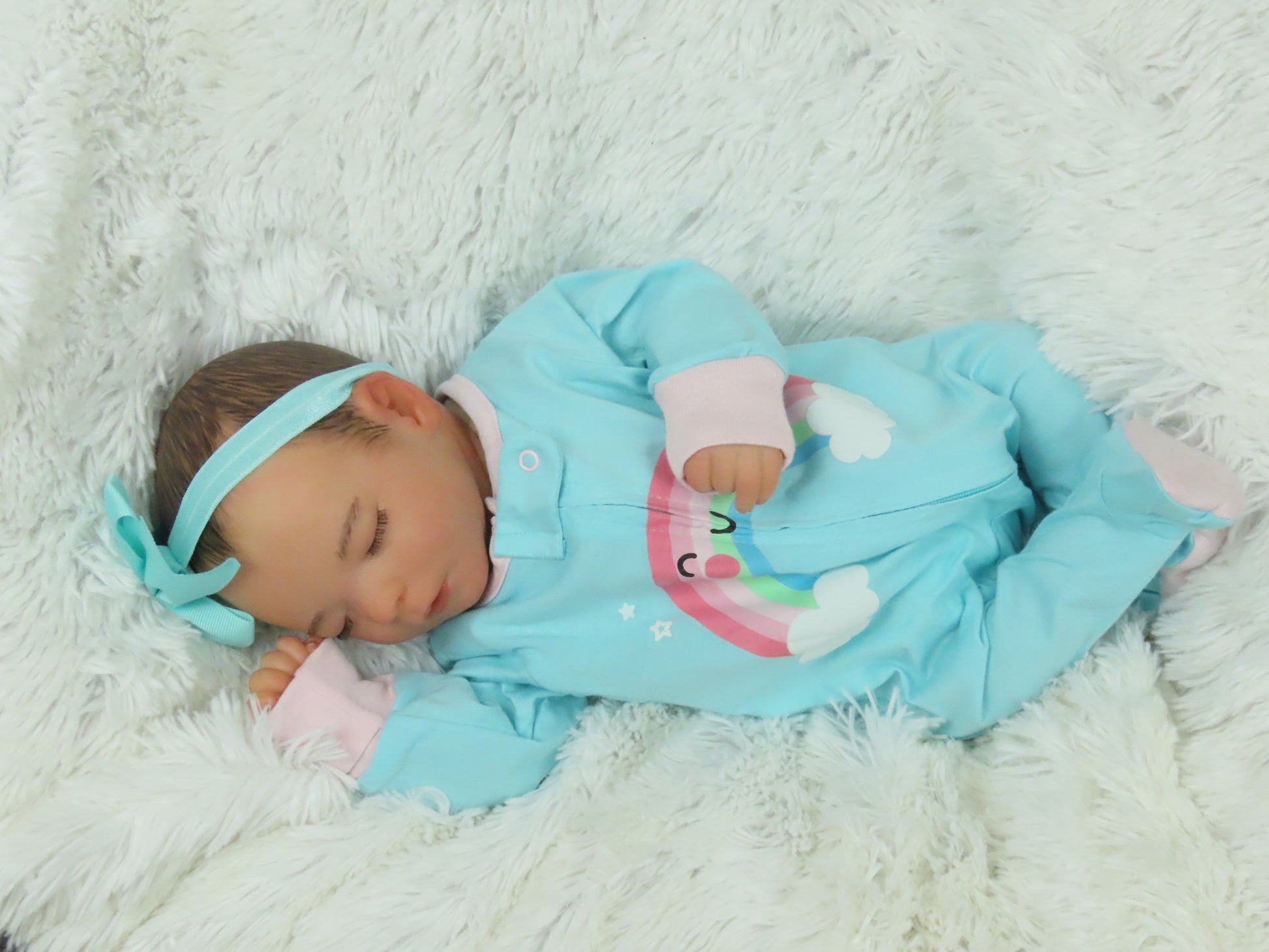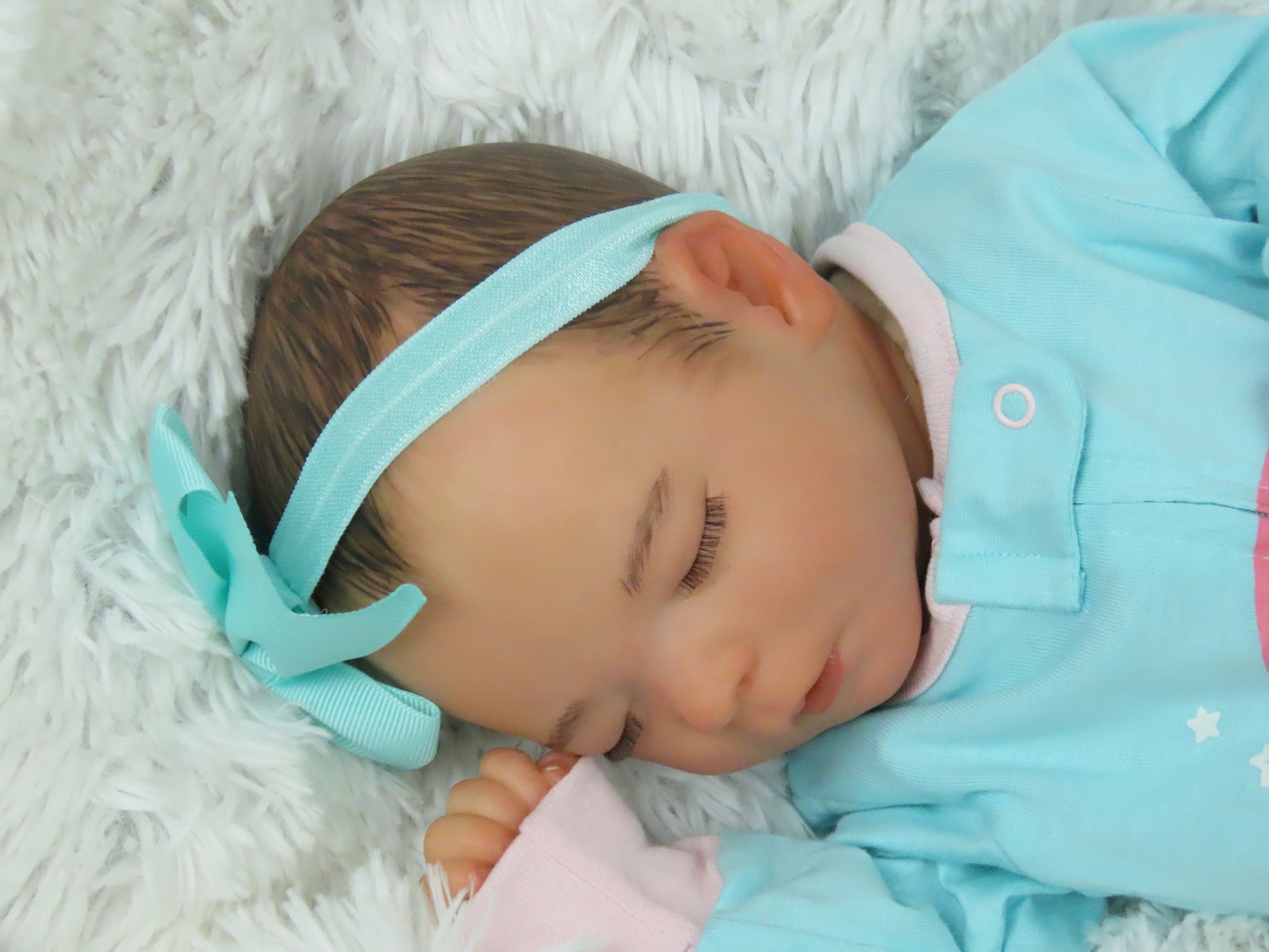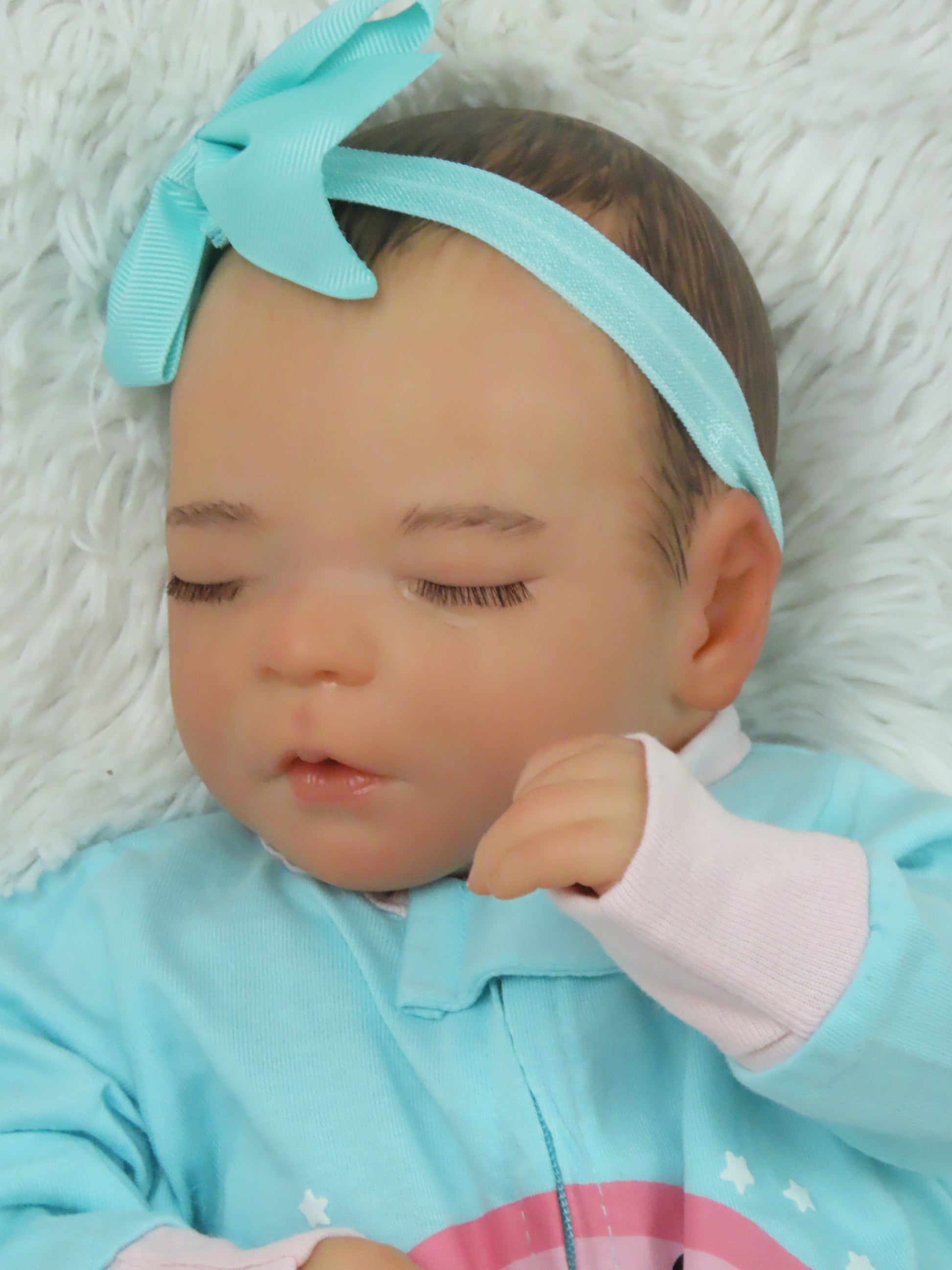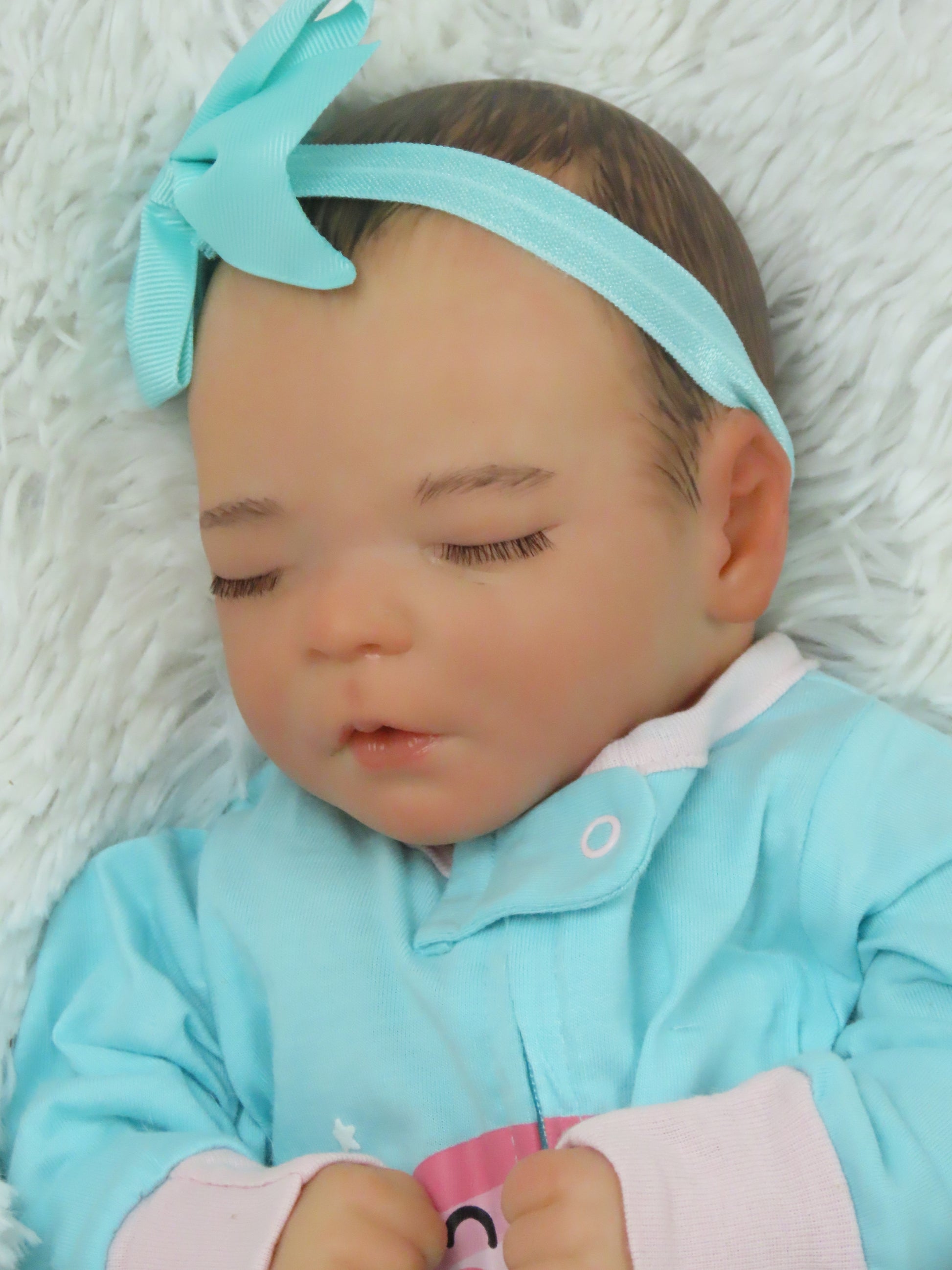This sweet baby girl was born from the Darren Asleep kit, weighs 4 lbs 10 oz, and is 17.5 inches long. She has painted brown hair and rooted eyelashes. She can wear newborn and some preemie size clothing.