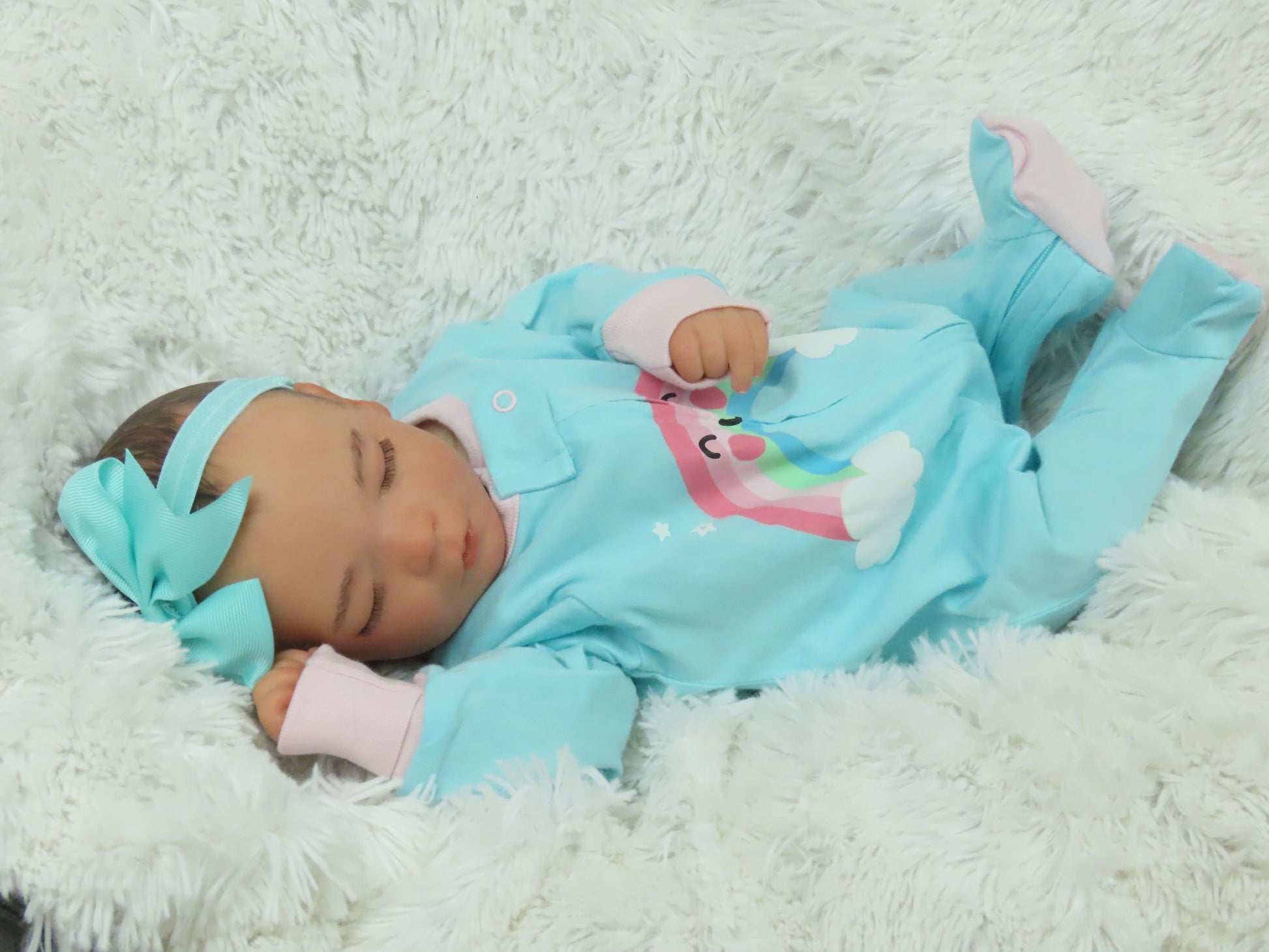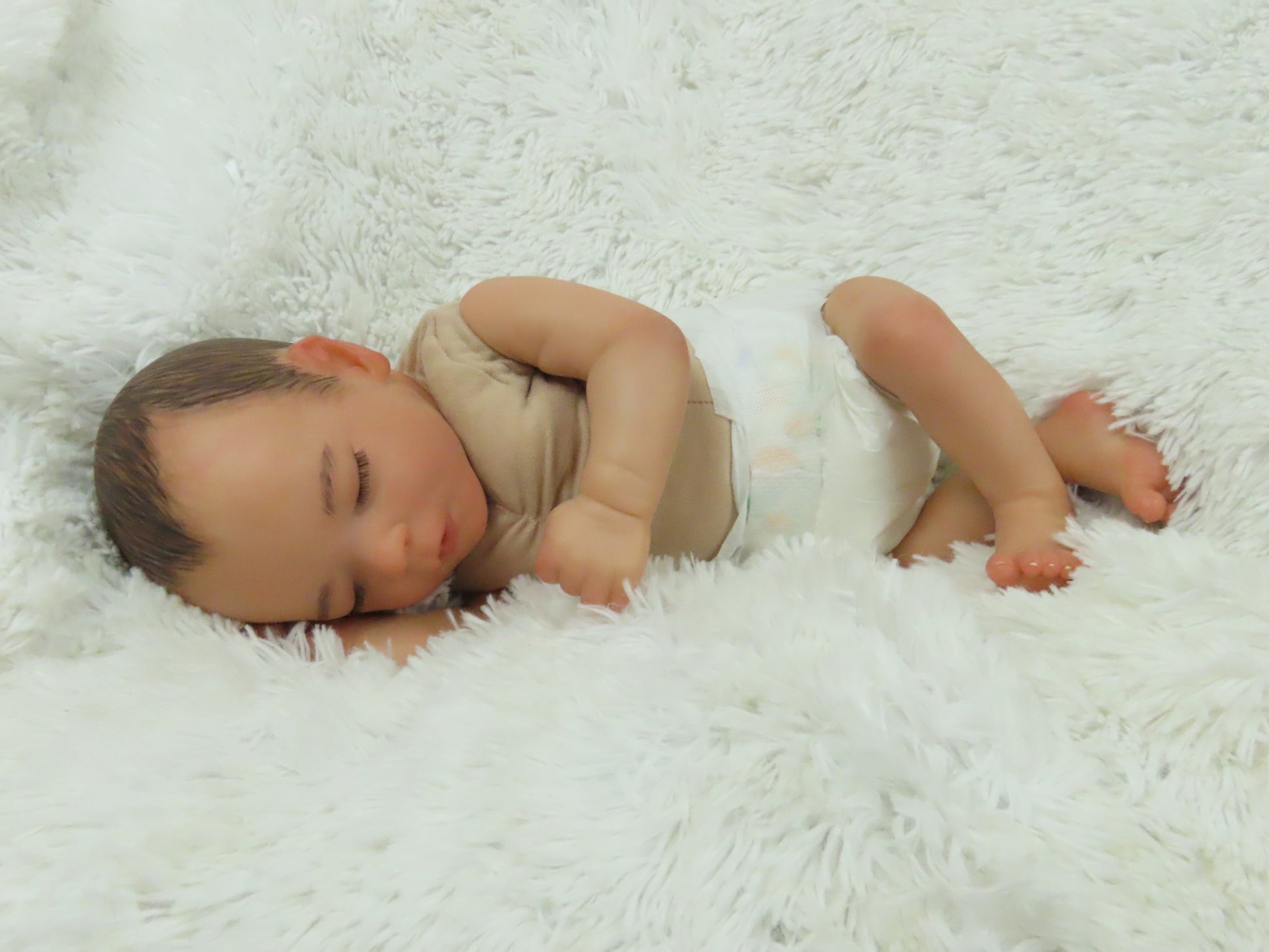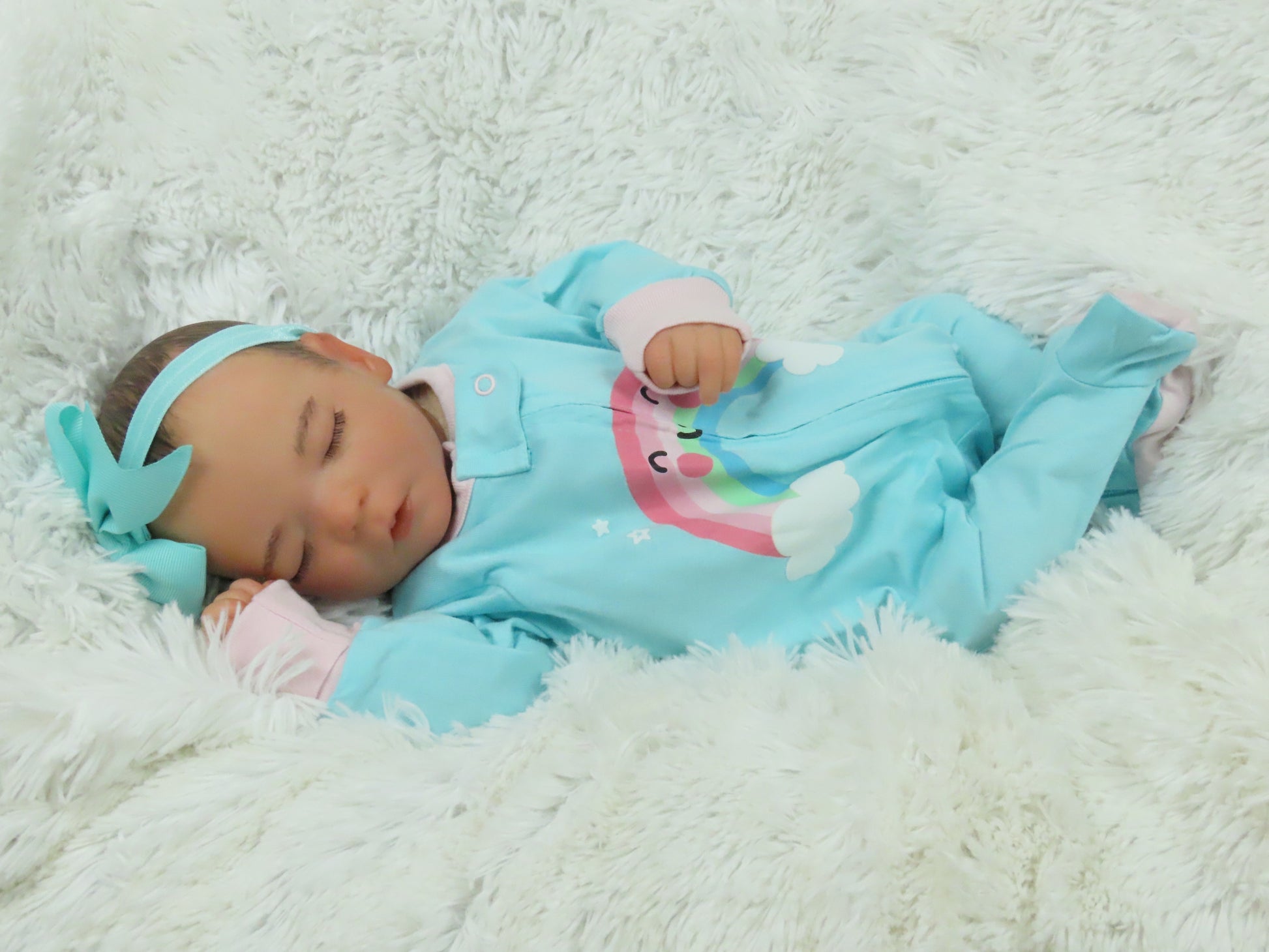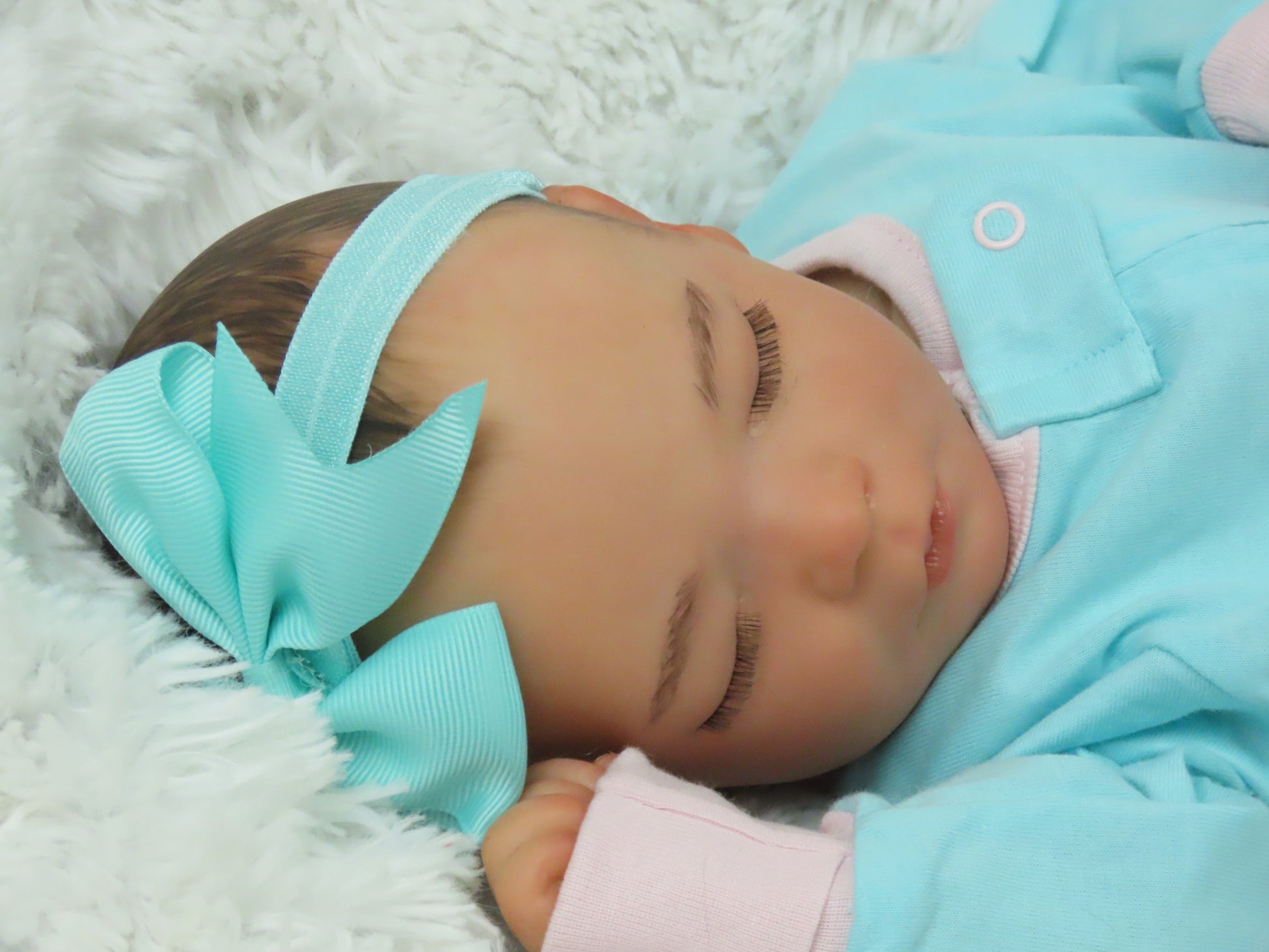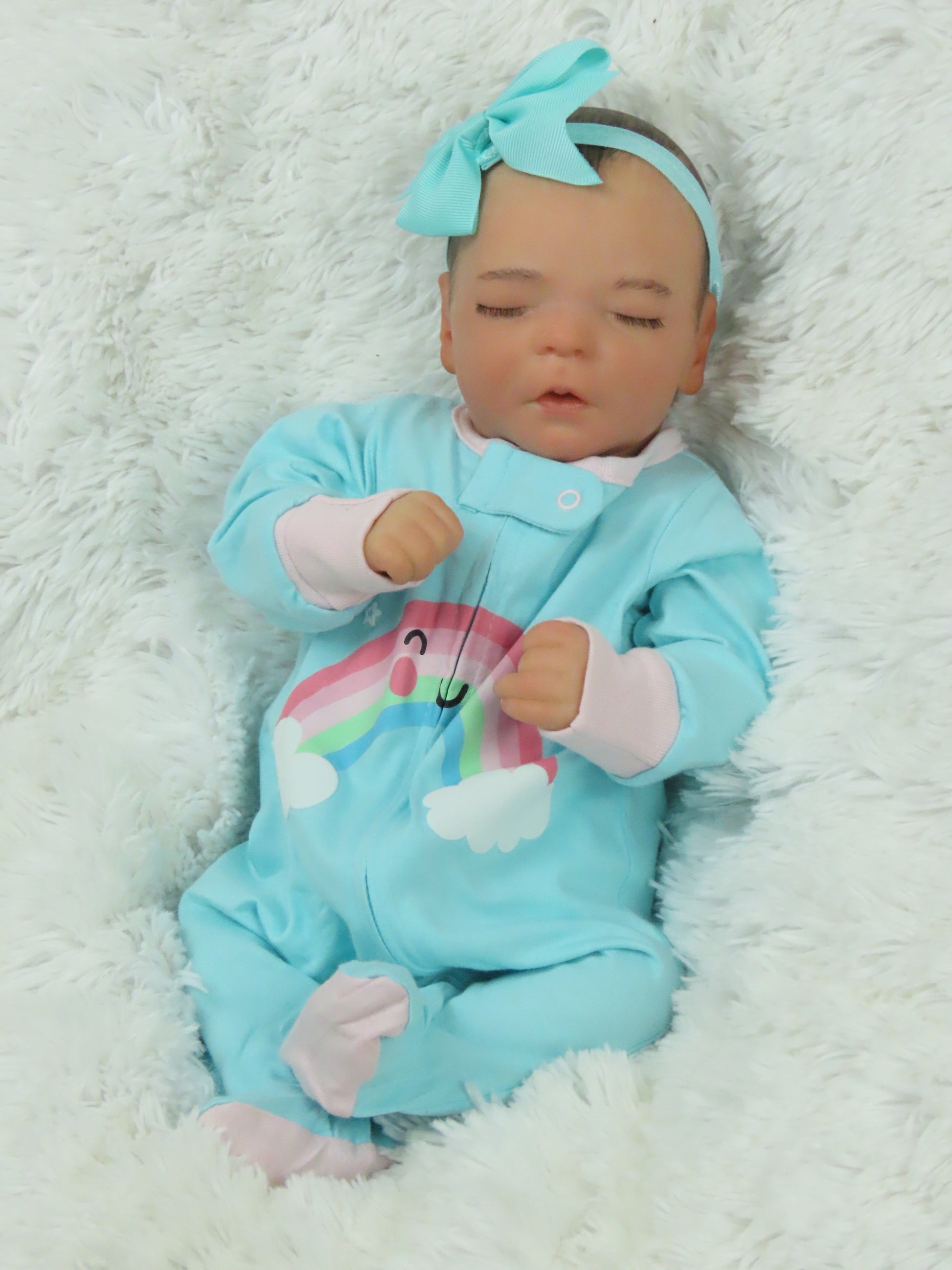This sweet baby girl was born from the Darren Asleep kit, weighs 4 lbs 10 oz, and is 17.5 inches long. She has painted brown hair and rooted eyelashes. She can wear newborn and some preemie size clothing.