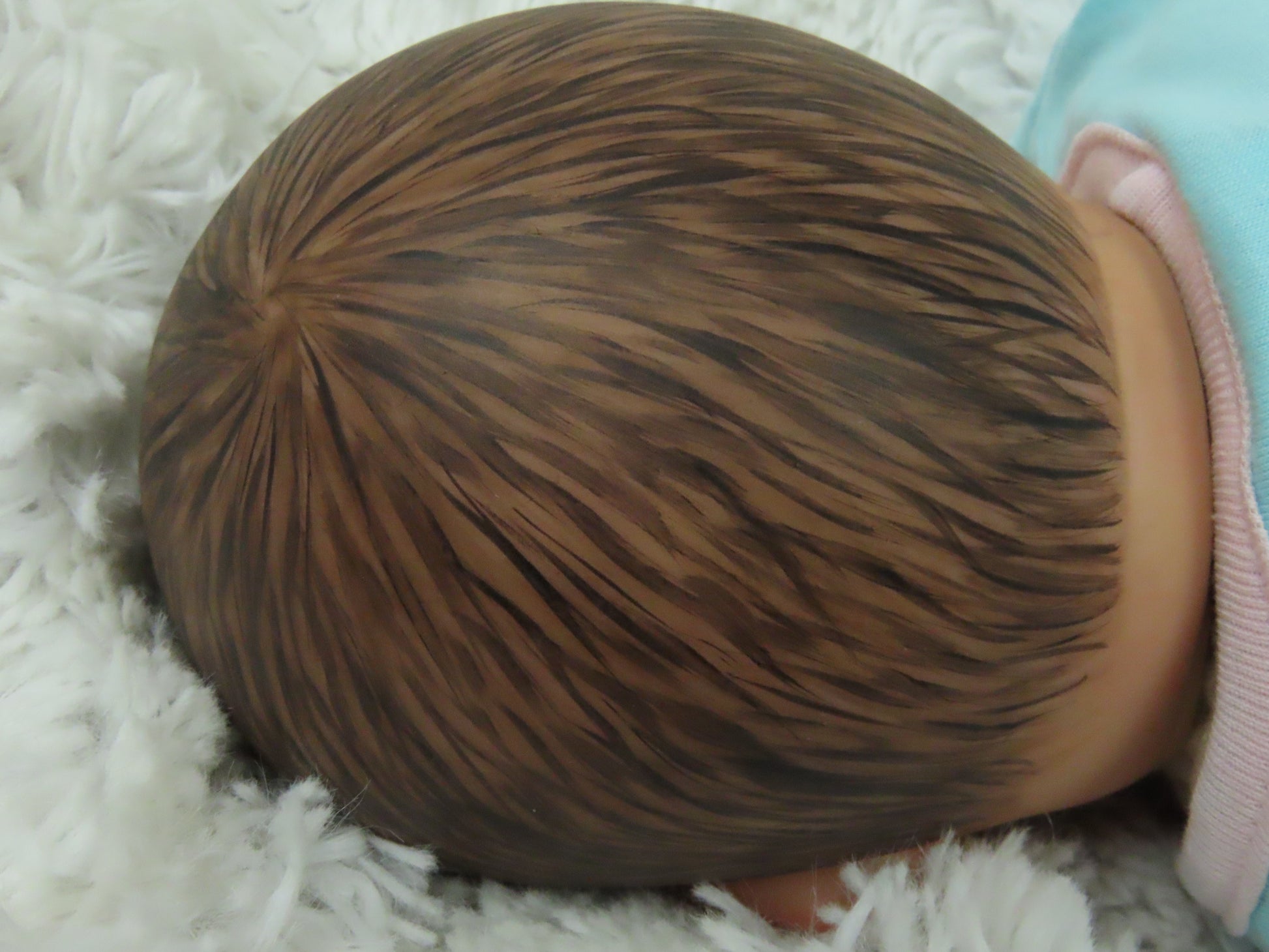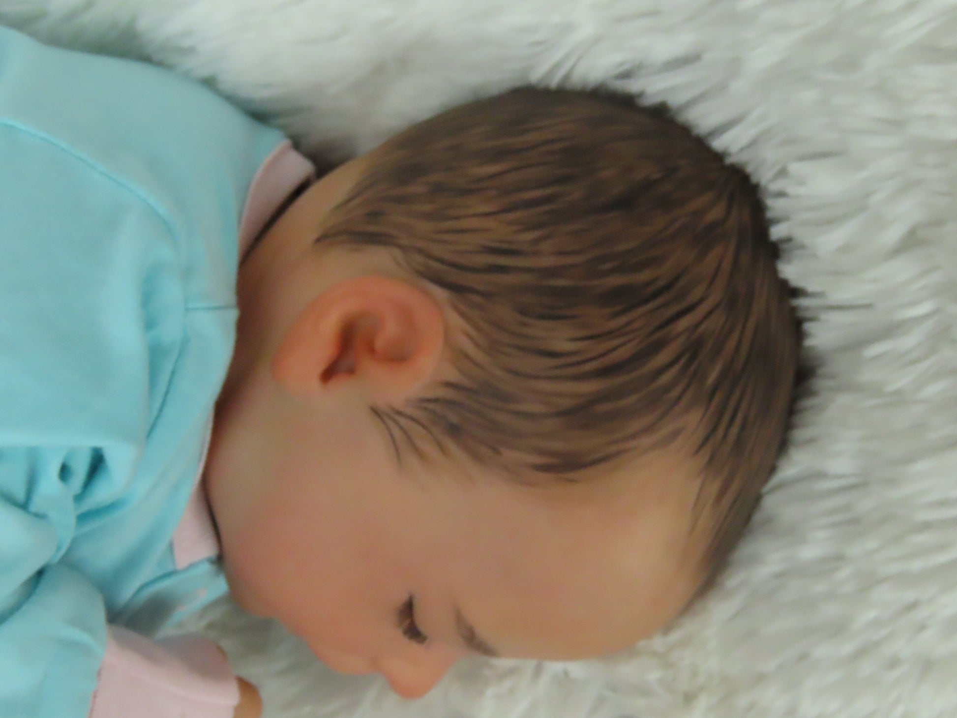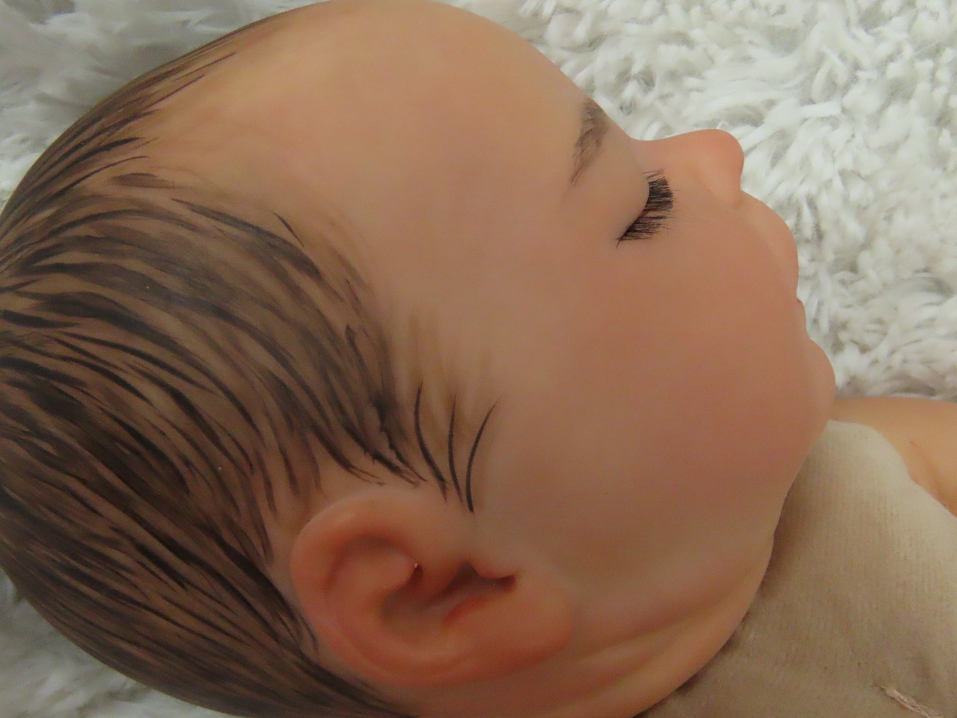 She has full vinyl arms and legs and a flesh colored doe suede cloth body, making her pose-able. Her eyelashes are rooted and sealed inside. Her nails are manicured and sealed. She is hand-painted using many translucent layers of Ultimate Fusion Paint, including subtle veining and mottling, to give her her lifelike appearance and making her one of a kind. She is weighted with fine glass beads and ultra soft fiberfill giving her that cuddly feel of a real baby.