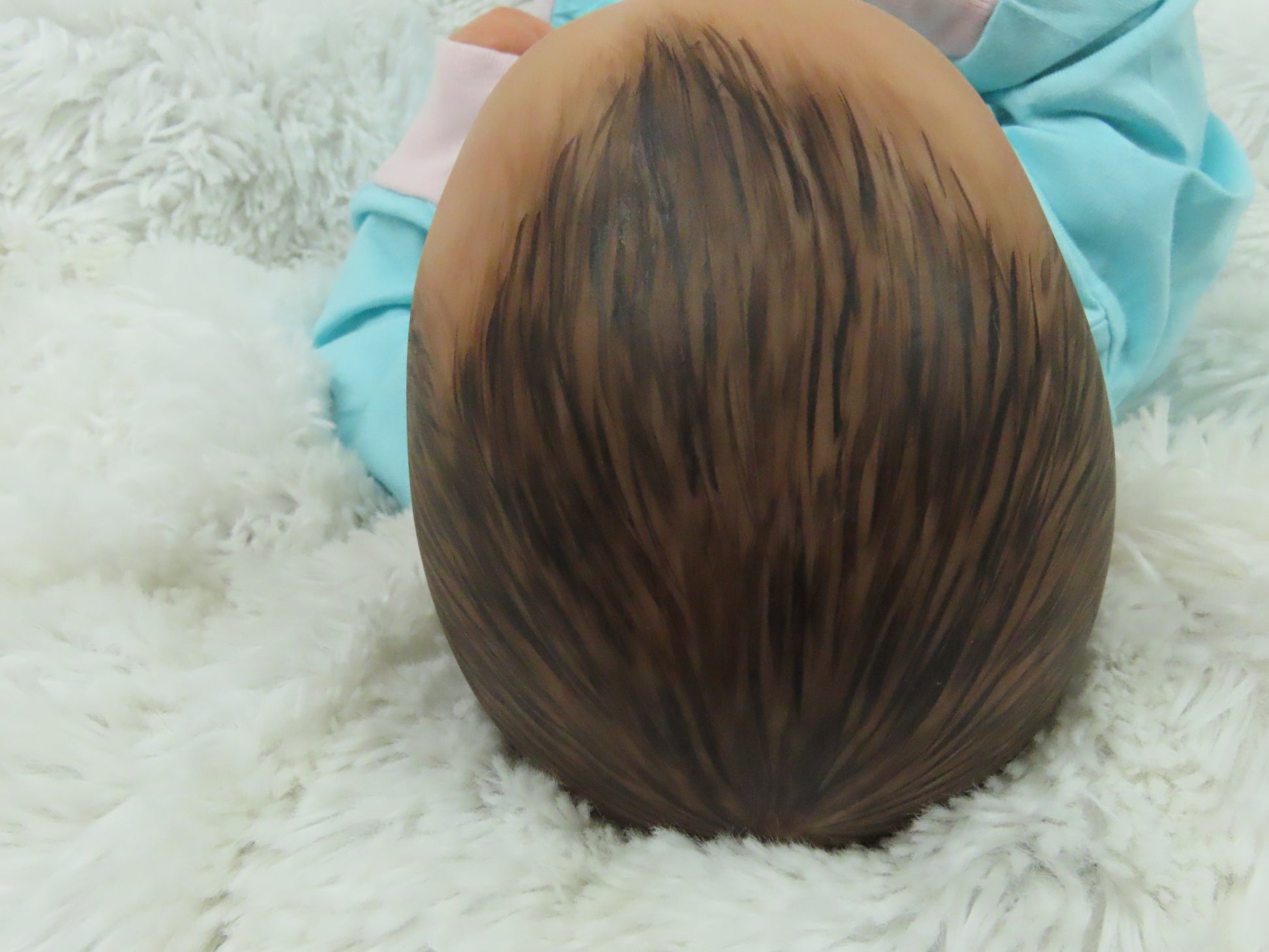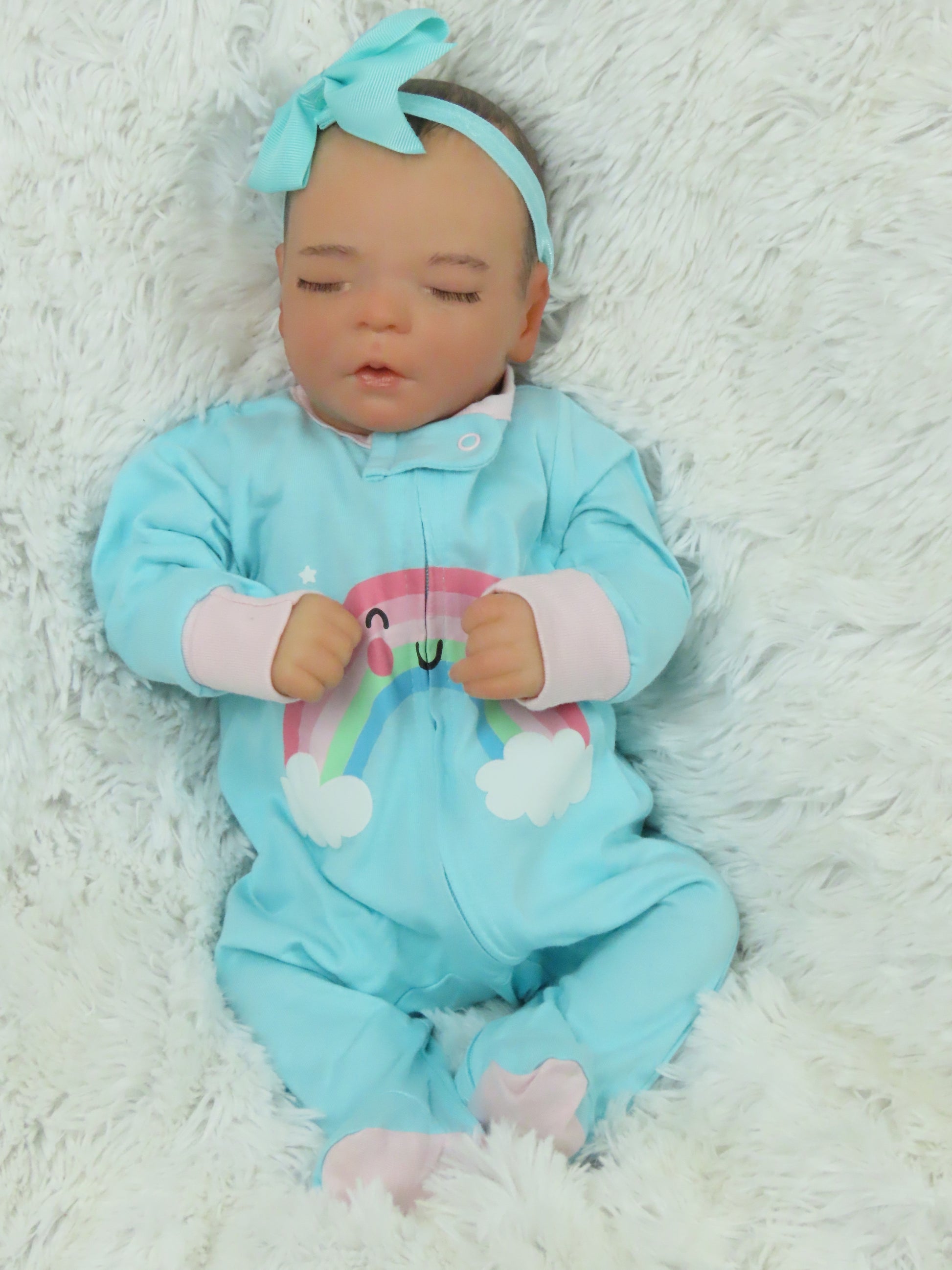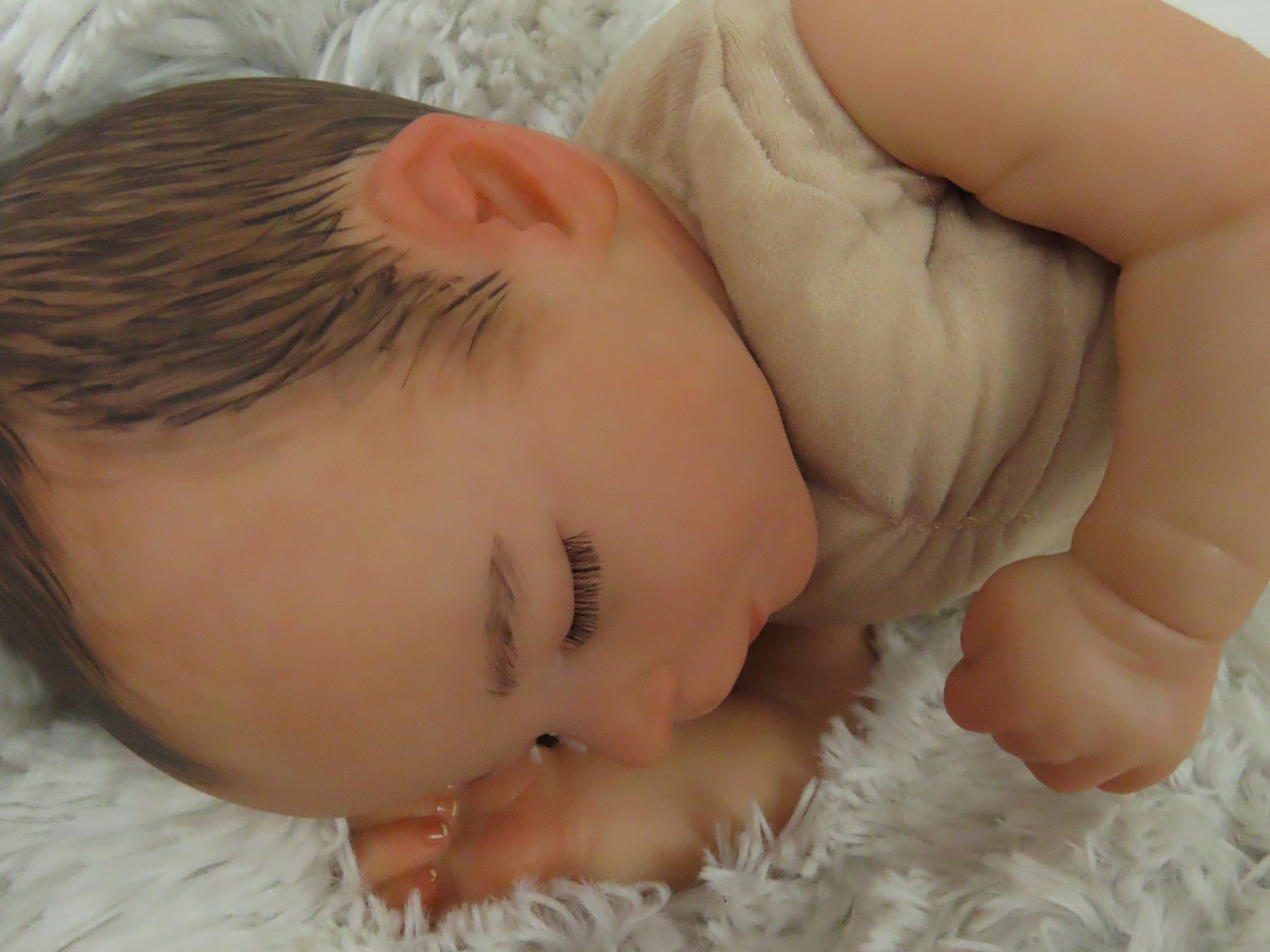 She has full vinyl arms and legs and a flesh colored doe suede cloth body, making her pose-able. Her eyelashes are rooted and sealed inside. Her nails are manicured and sealed. She is hand-painted using many translucent layers of Ultimate Fusion Paint, including subtle veining and mottling, to give her her lifelike appearance and making her one of a kind. She is weighted with fine glass beads and ultra soft fiberfill giving her that cuddly feel of a real baby.