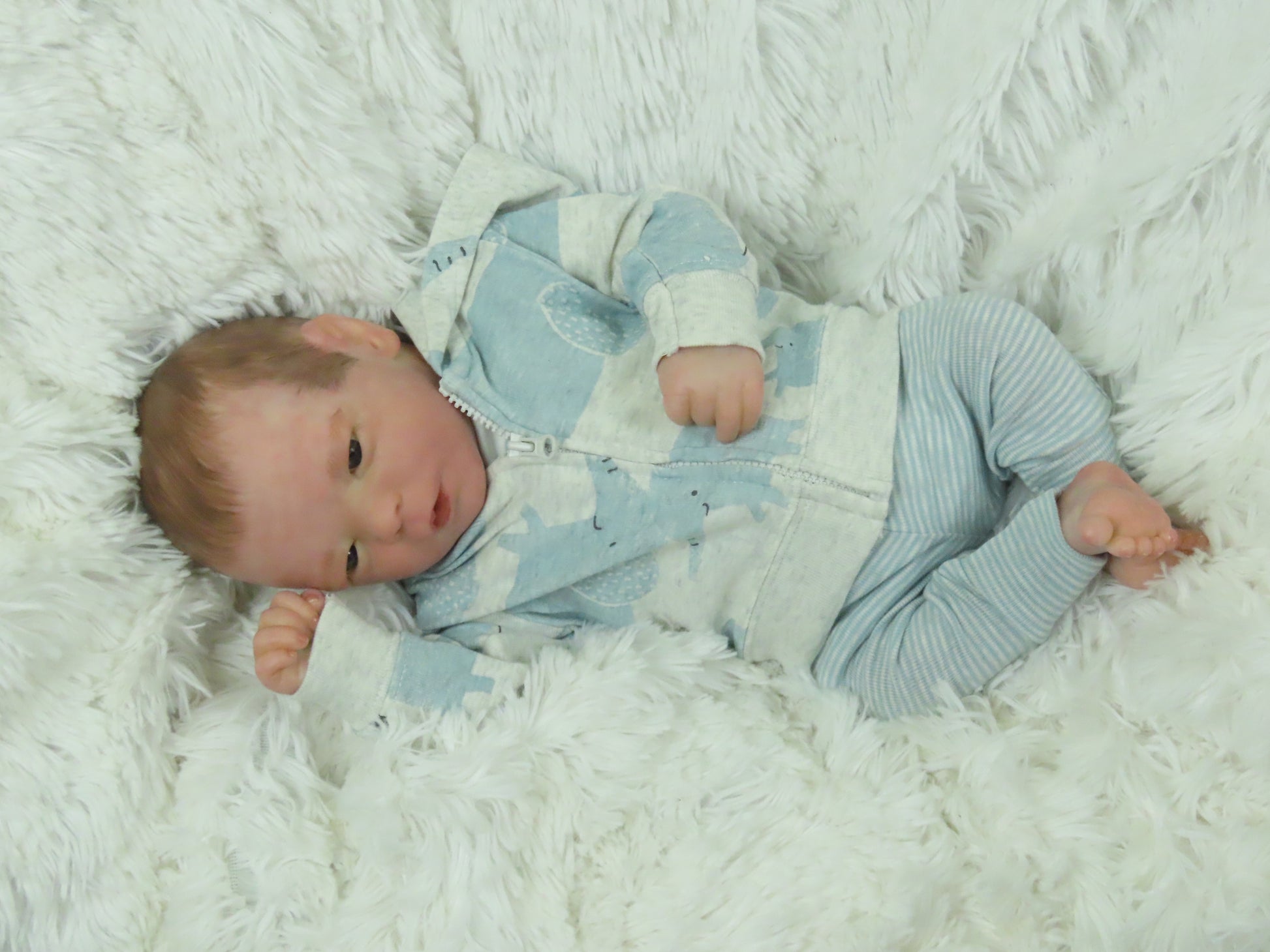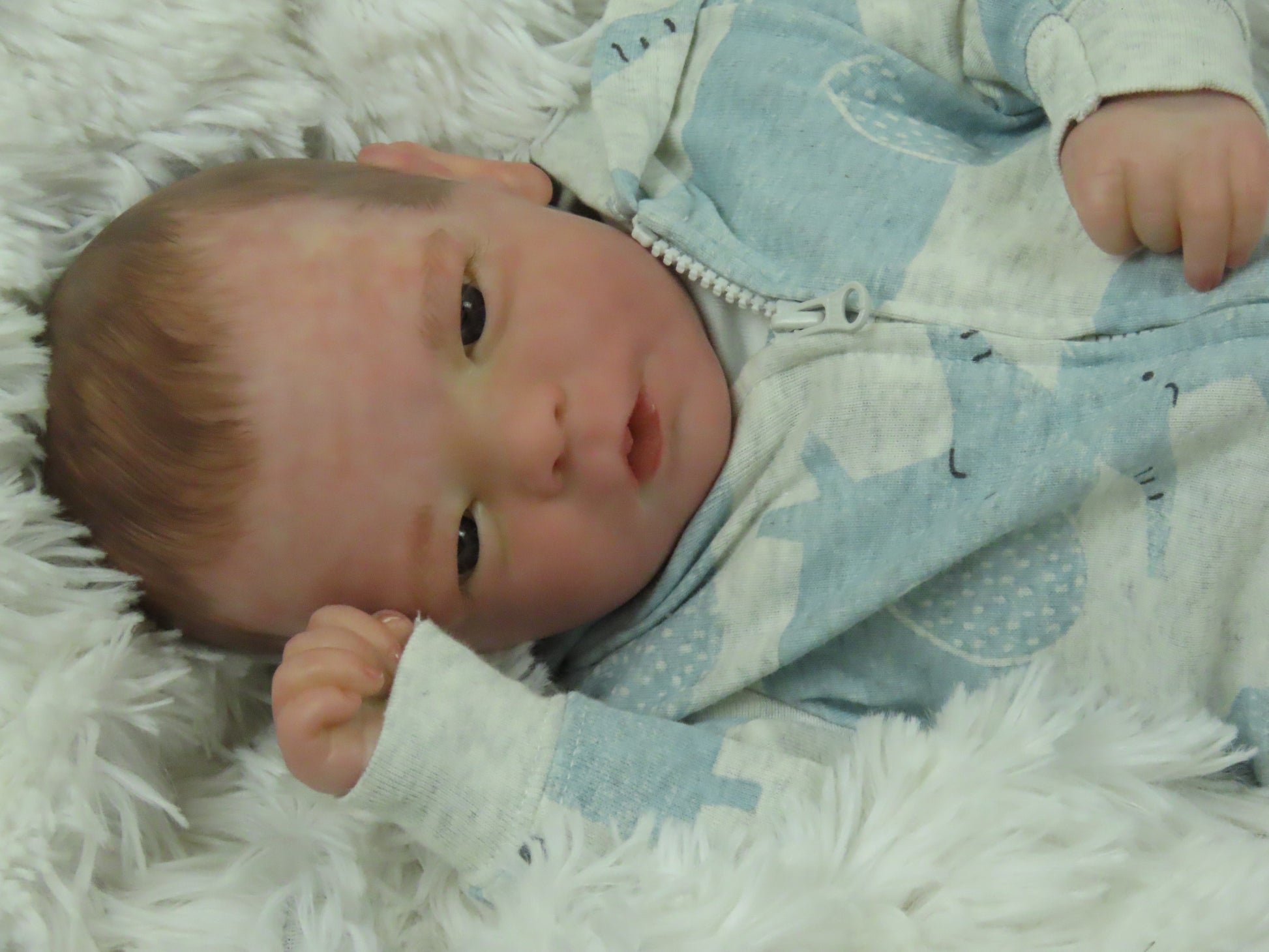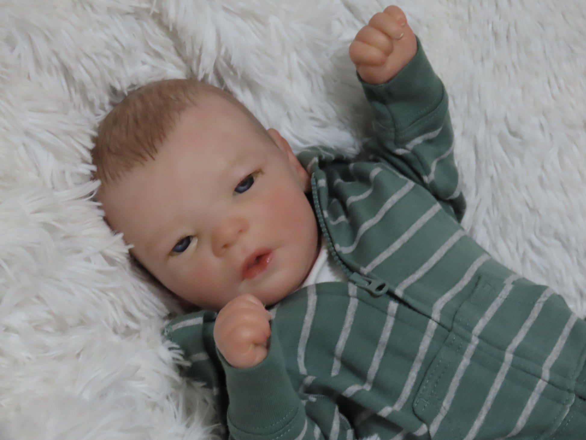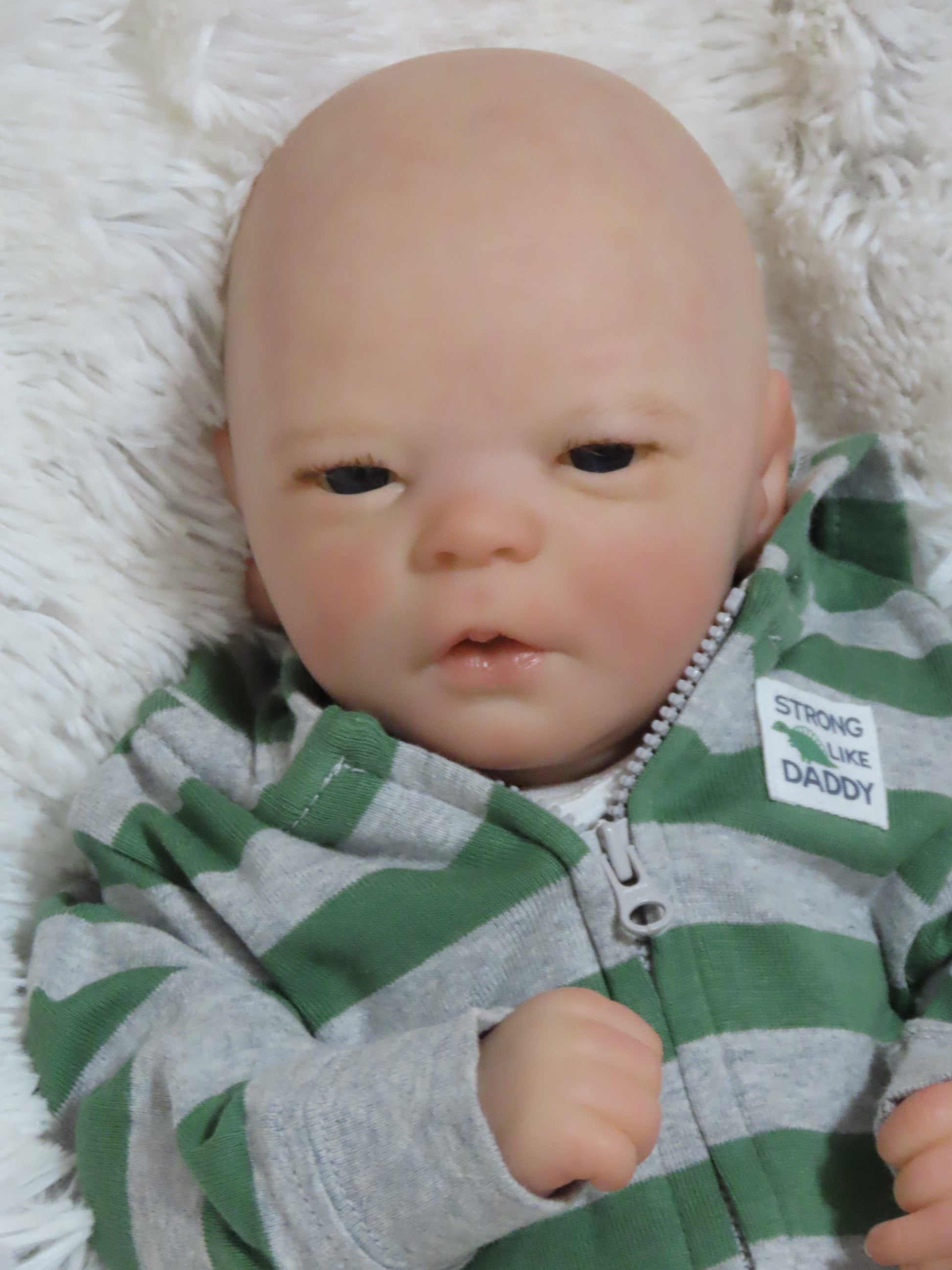 Baby will be reborned by me. He/She will have a Caucasian/White skintone similar to to photos above. He/She will have full vinyl arms and legs, and a flesh colored cloth body, making him/her pose-able. His/her eyelashes will be rooted and sealed inside. His/her nails will be manicured and sealed inside. He/she will be hand-painted with many translucent layers of Ultimate Fusion Paint, including subtle veining and soft mottling, to give him/her his/her lifelike features and making him/her one of a kind. He/she will also be weighted with fine glass beads and ultra soft fiberfill giving him/her that cuddly feel of a real baby
