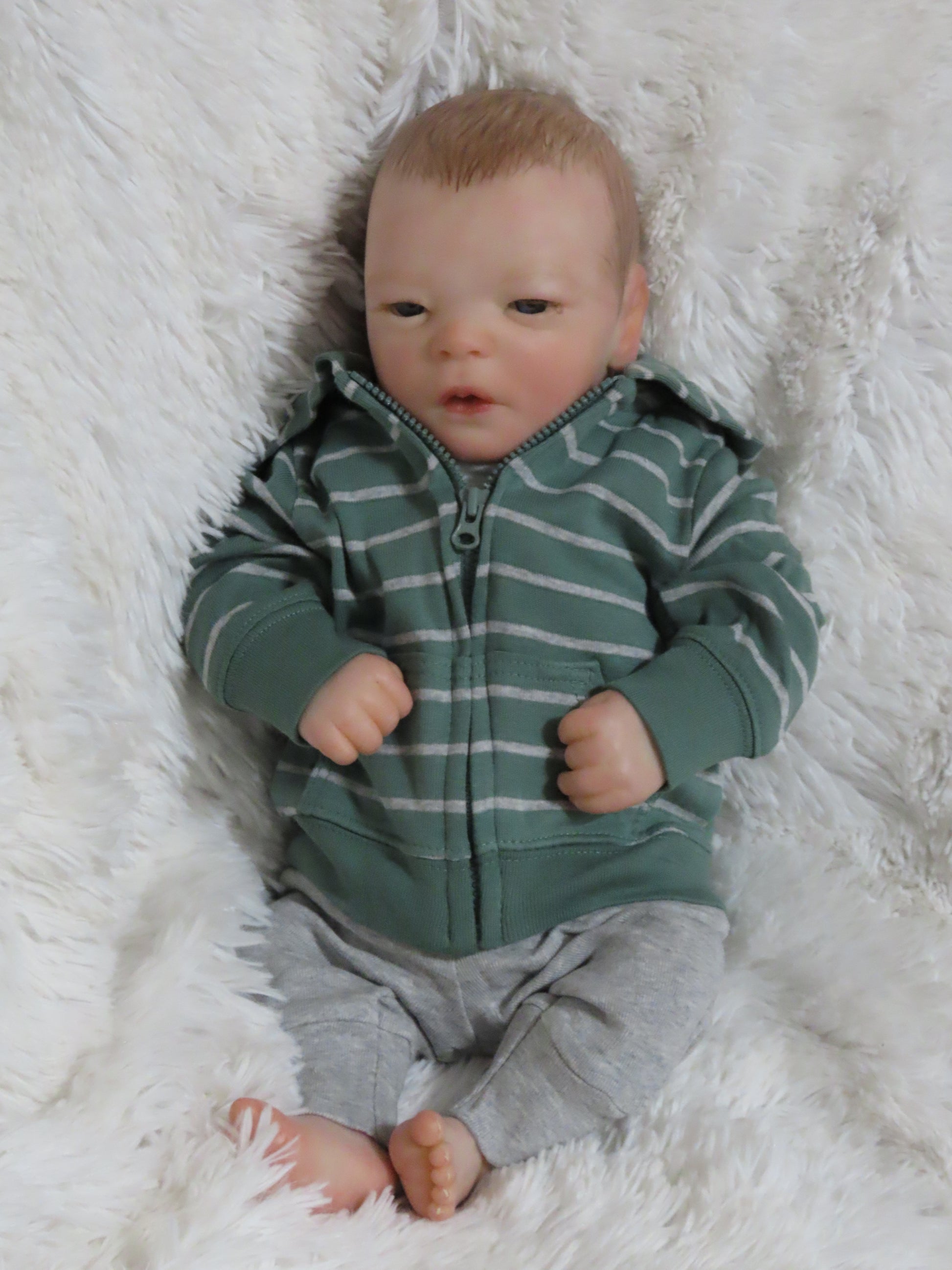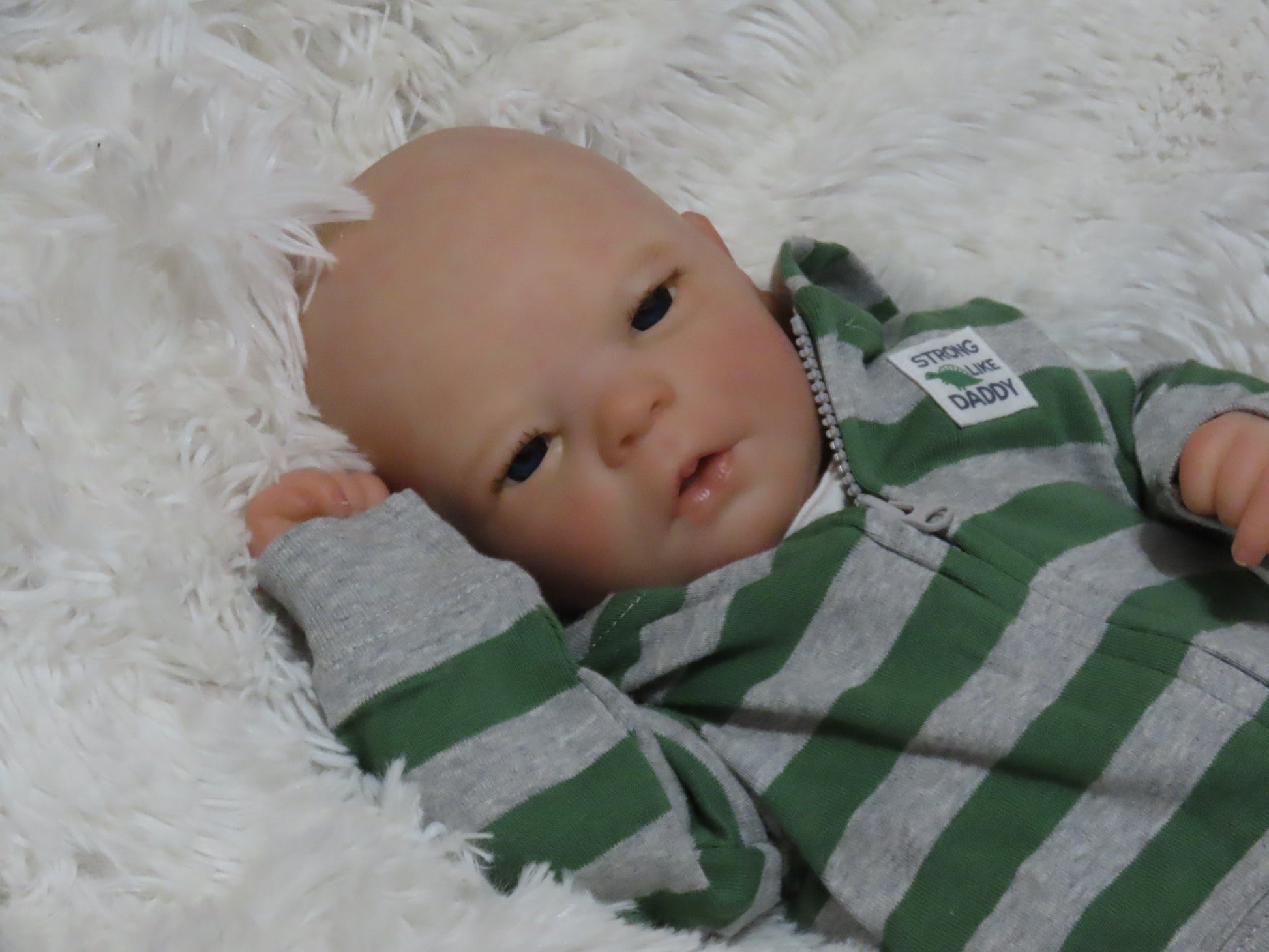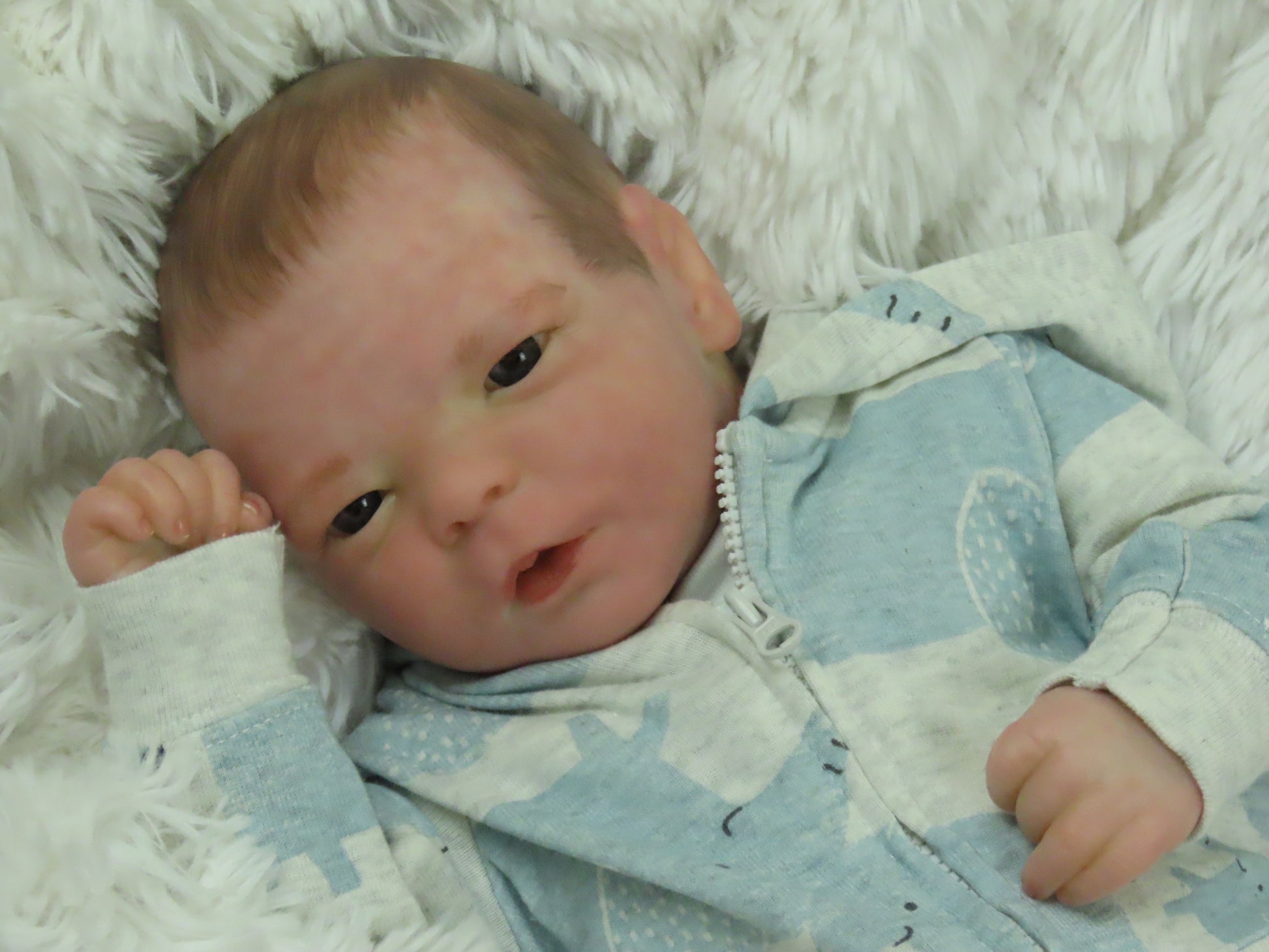 Baby will be reborned by me. He/She will have a Caucasian/White skintone similar to to photos above. He/She will have full vinyl arms and legs, and a flesh colored cloth body, making him/her pose-able. His/her eyelashes will be rooted and sealed inside. His/her nails will be manicured and sealed inside. He/she will be hand-painted with many translucent layers of Ultimate Fusion Paint, including subtle veining and soft mottling, to give him/her his/her lifelike features and making him/her one of a kind. He/she will also be weighted with fine glass beads and ultra soft fiberfill giving him/her that cuddly feel of a real baby