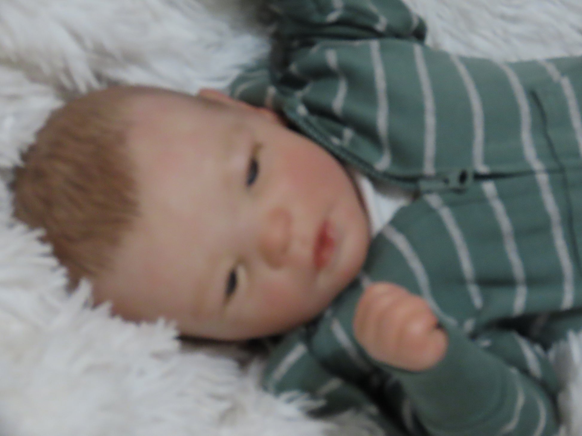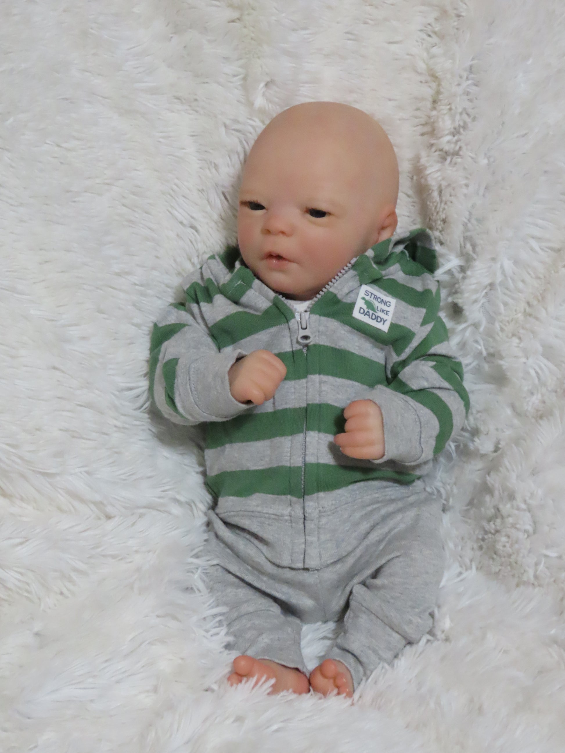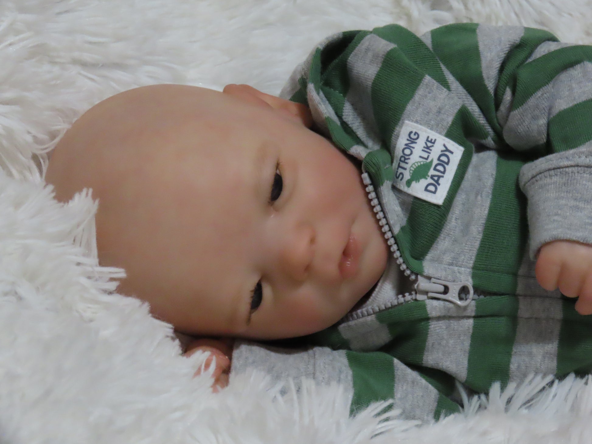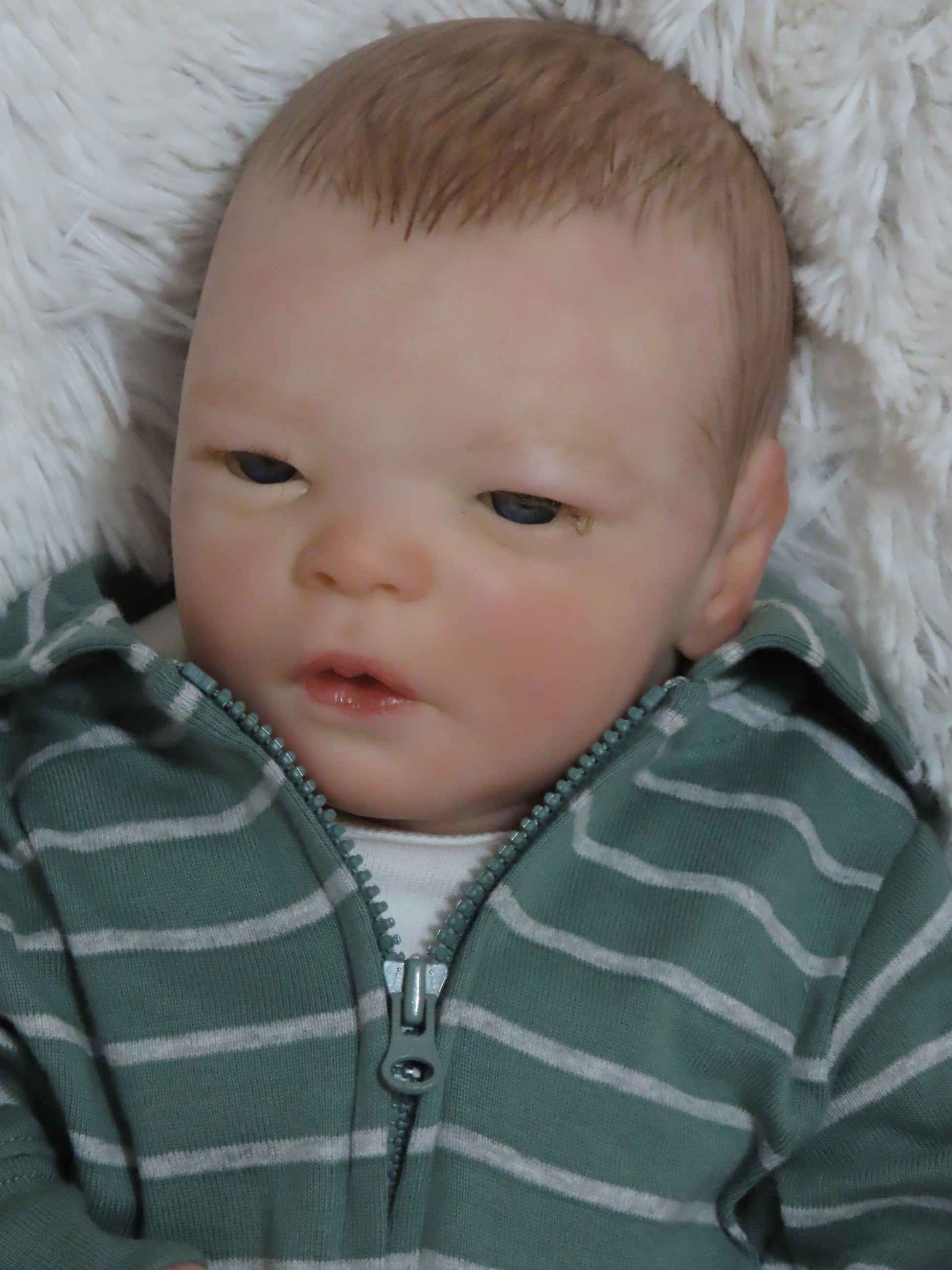 Baby will be reborned by me. He/She will have a Caucasian/White skintone similar to to photos above. He/She will have full vinyl arms and legs, and a flesh colored cloth body, making him/her pose-able. His/her eyelashes will be rooted and sealed inside. His/her nails will be manicured and sealed inside. He/she will be hand-painted with many translucent layers of Ultimate Fusion Paint, including subtle veining and soft mottling, to give him/her his/her lifelike features and making him/her one of a kind. He/she will also be weighted with fine glass beads and ultra soft fiberfill giving him/her that cuddly feel of a real baby