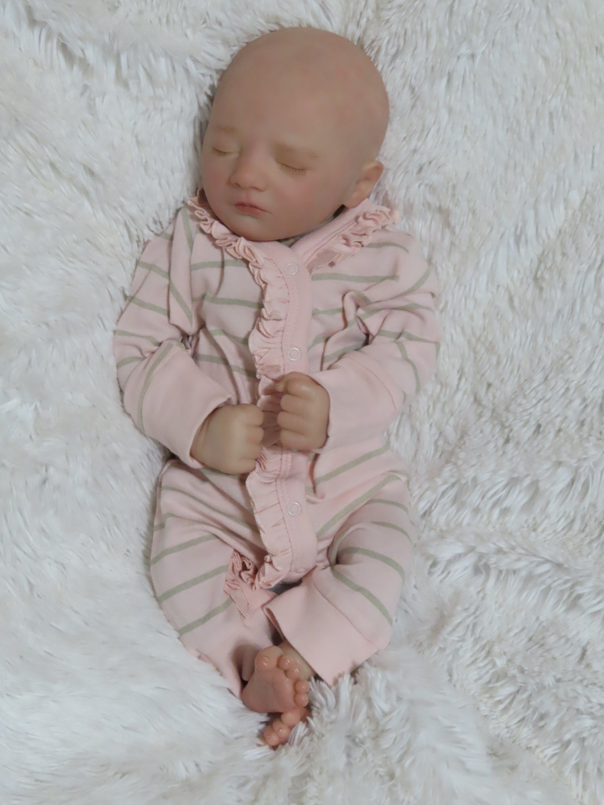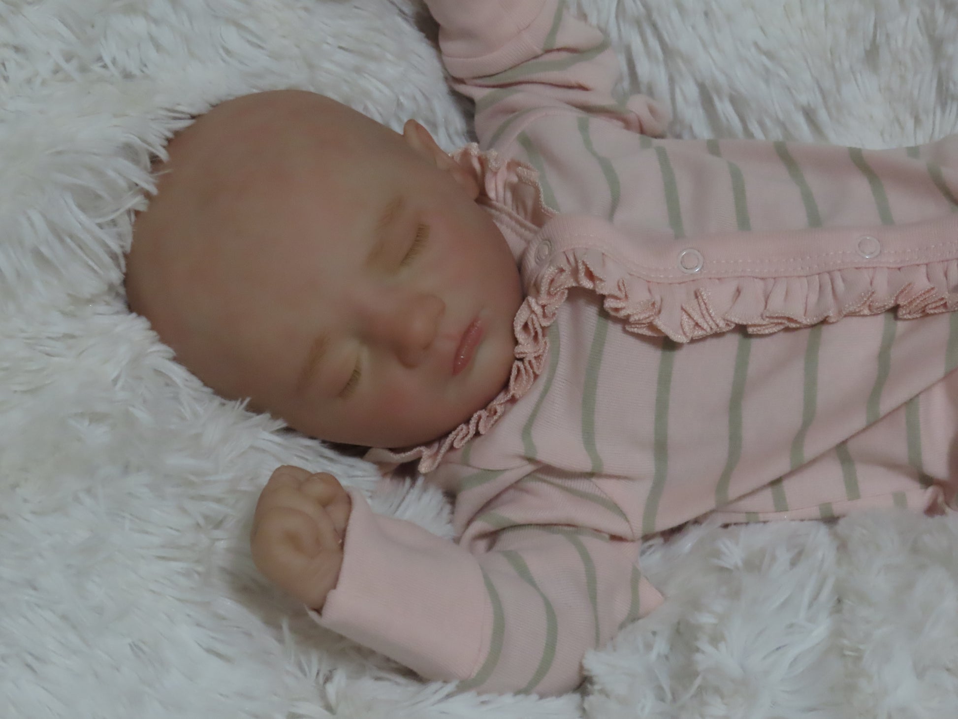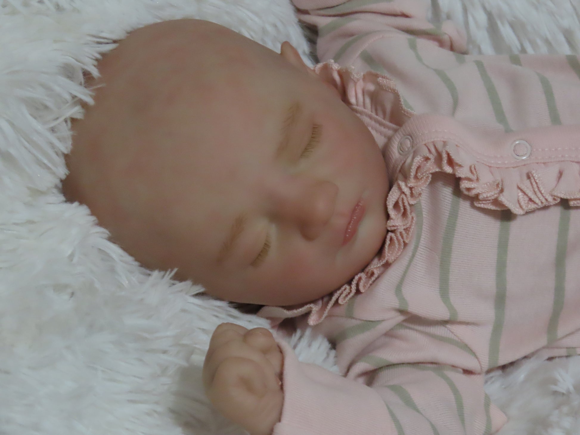 Baby will be reborned by me. He/She will have a Caucasian/White skintone similar to to photos above. He/She will have full vinyl arms and legs, and a flesh colored cloth body, making him/her pose-able. His/her eyelashes will be rooted and sealed inside. His/her nails will be manicured and sealed inside. He/she will be hand-painted with many translucent layers of Ultimate Fusion Paint, including subtle veining and soft mottling, to give him/her his/her lifelike features and making him/her one of a kind. He/she will also be weighted with fine glass beads and ultra soft fiberfill giving him/her that cuddly feel of a real baby