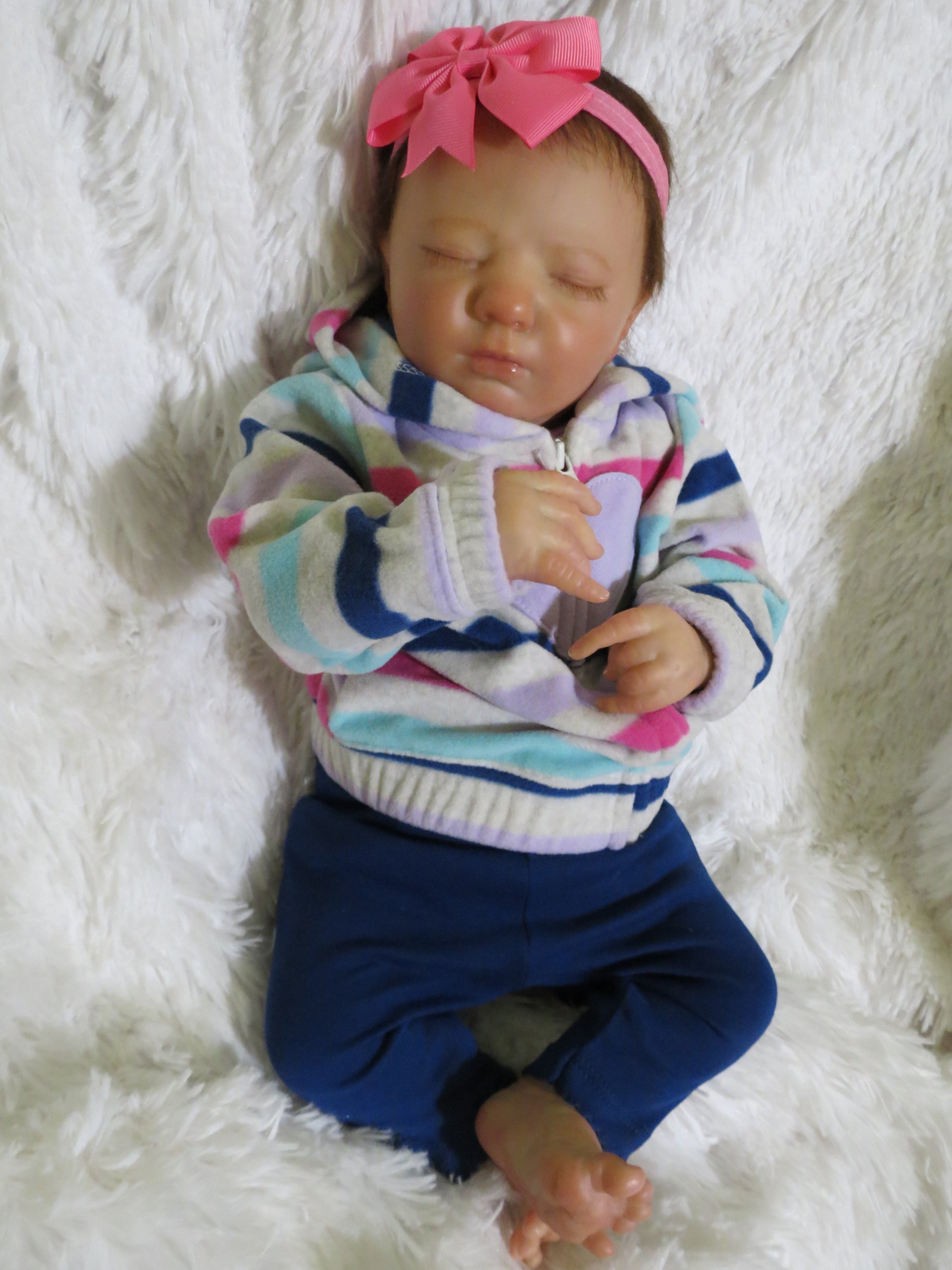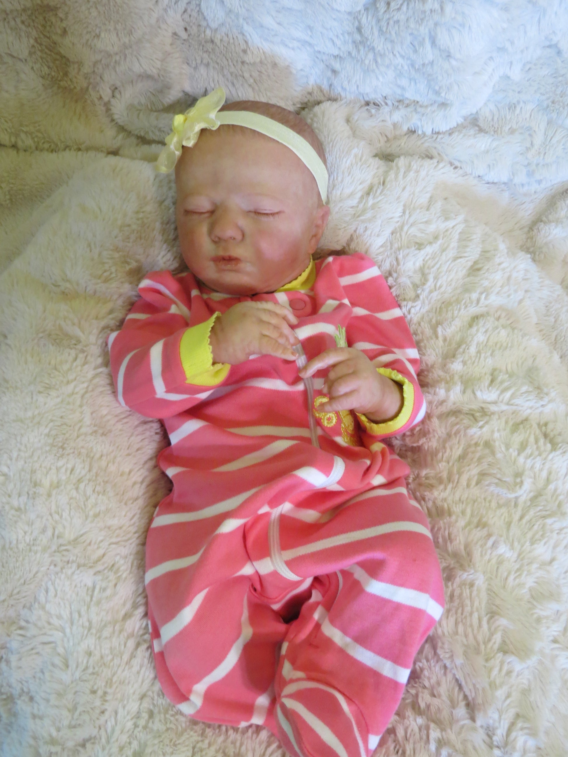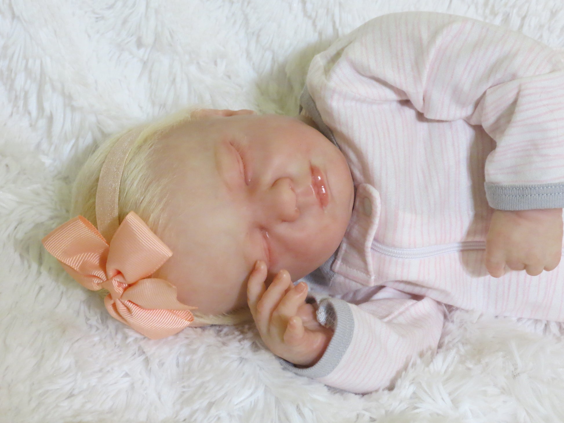 Baby will be reborned by me. He/She will have a Caucasian/White skintone similar to to photos above. He/She will have full vinyl arms and legs, and a flesh colored cloth body, making him/her pose-able. His/her eyelashes will be rooted and sealed inside. His/her nails will be manicured and sealed inside. He/she will be hand-painted with many translucent layers of Ultimate Fusion Paint, including subtle veining and soft mottling, to give him/her his/her lifelike features and making him/her one of a kind. He/she will also be weighted with fine glass beads and ultra soft fiberfill giving him/her that cuddly feel of a real baby