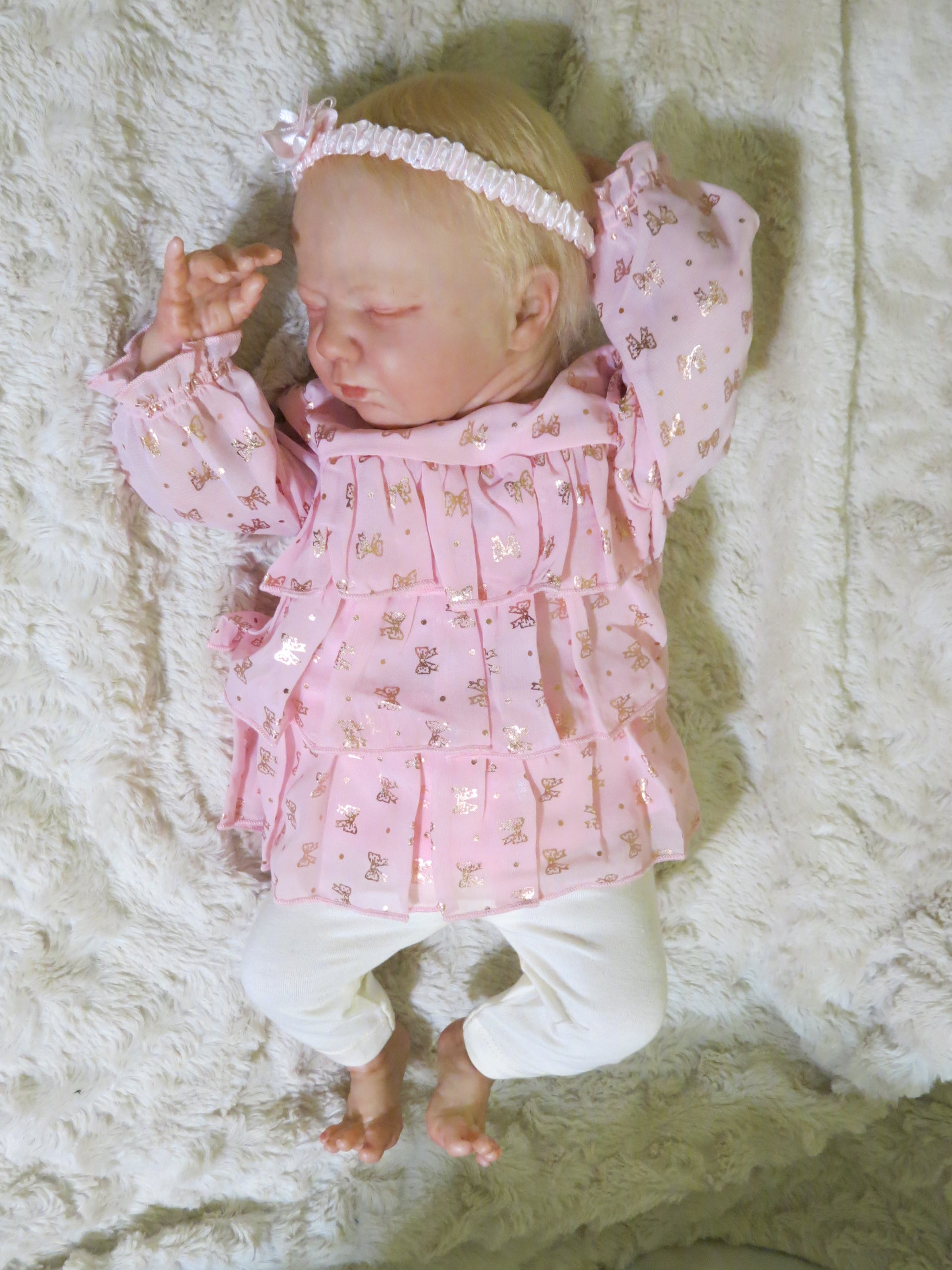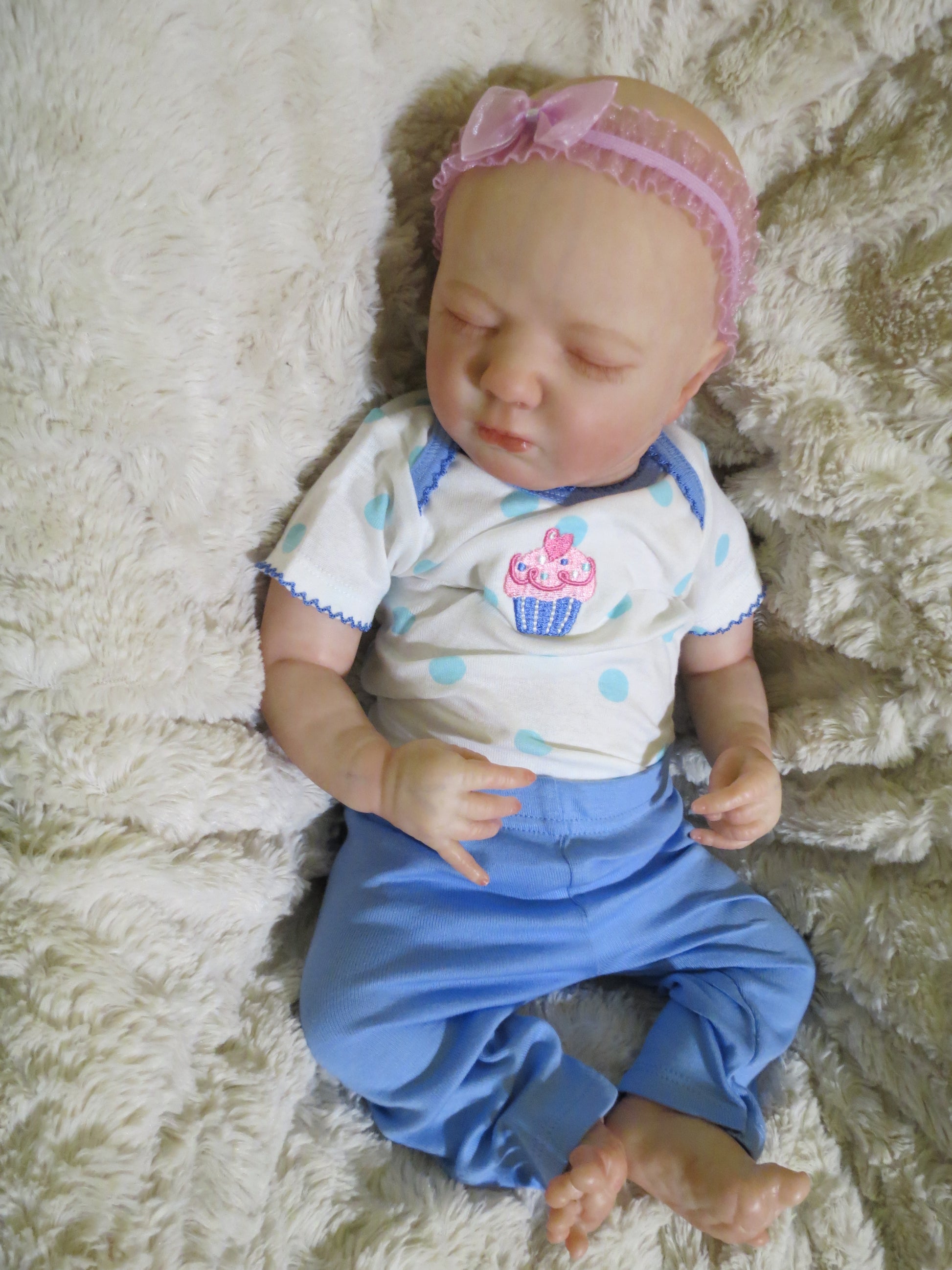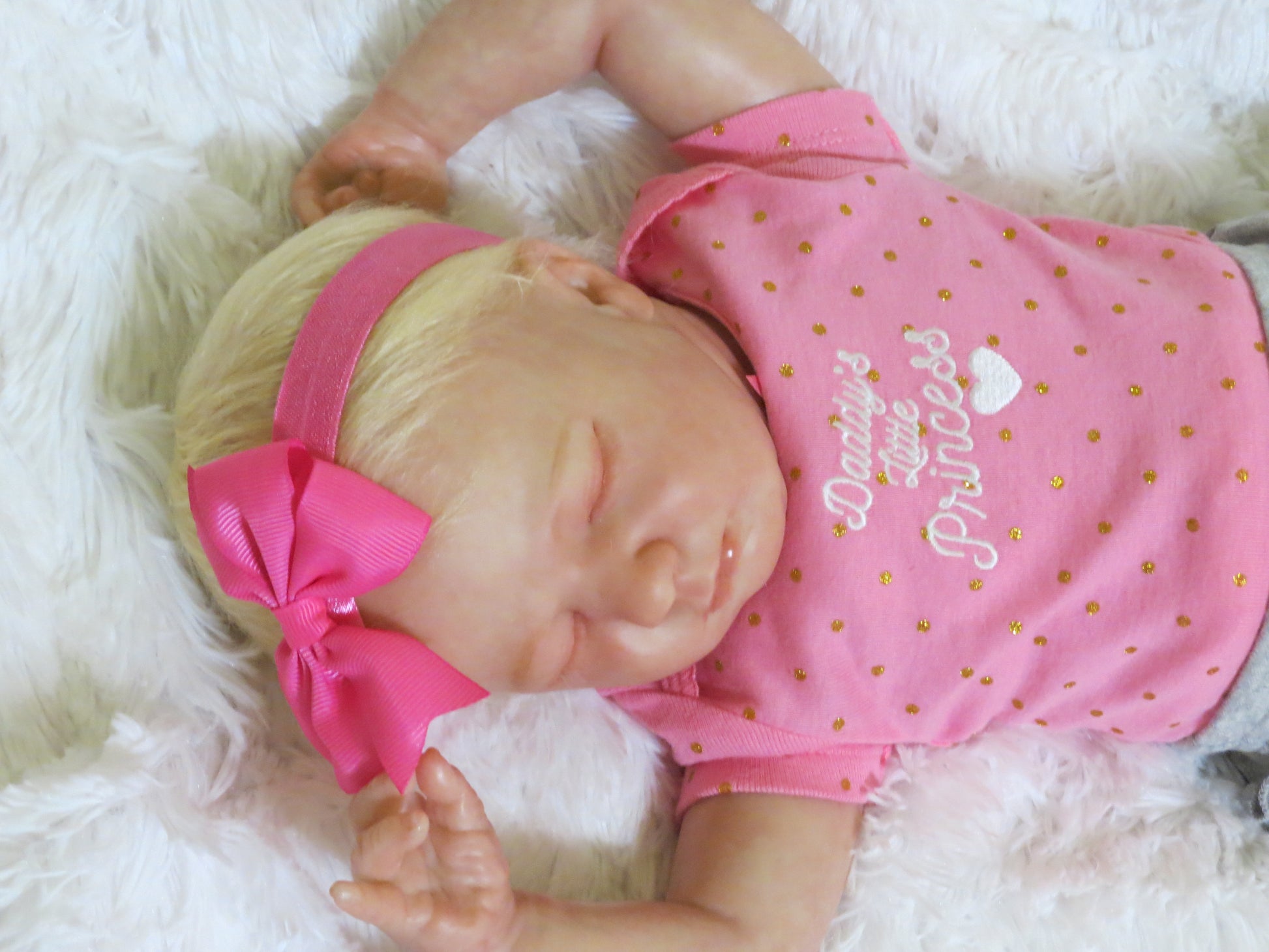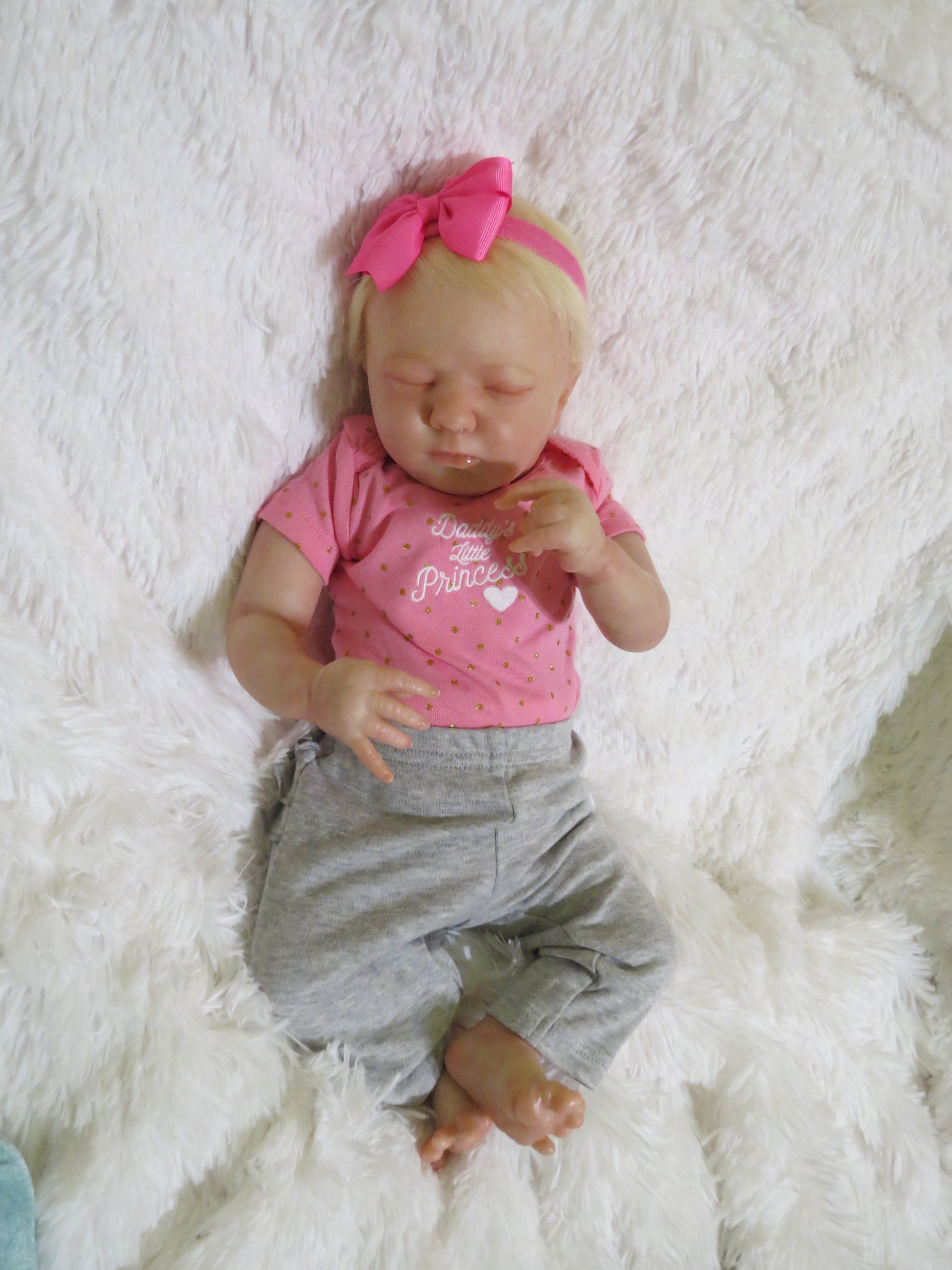 Baby will be reborned by me. He/She will have a Caucasian/White skintone similar to to photos above. He/She will have full vinyl arms and legs, and a flesh colored cloth body, making him/her pose-able. His/her eyelashes will be rooted and sealed inside. His/her nails will be manicured and sealed inside. He/she will be hand-painted with many translucent layers of Ultimate Fusion Paint, including subtle veining and soft mottling, to give him/her his/her lifelike features and making him/her one of a kind. He/she will also be weighted with fine glass beads and ultra soft fiberfill giving him/her that cuddly feel of a real baby