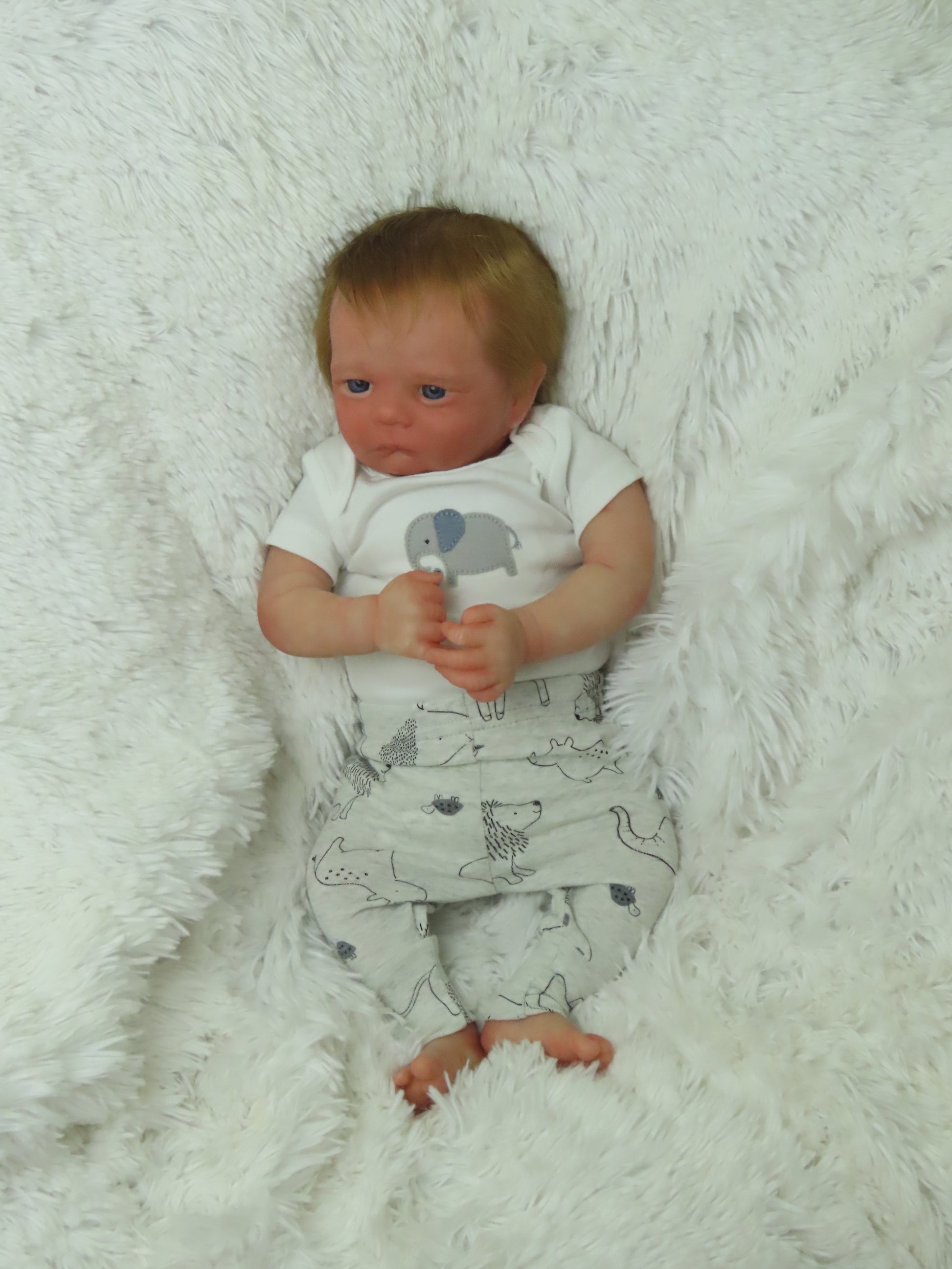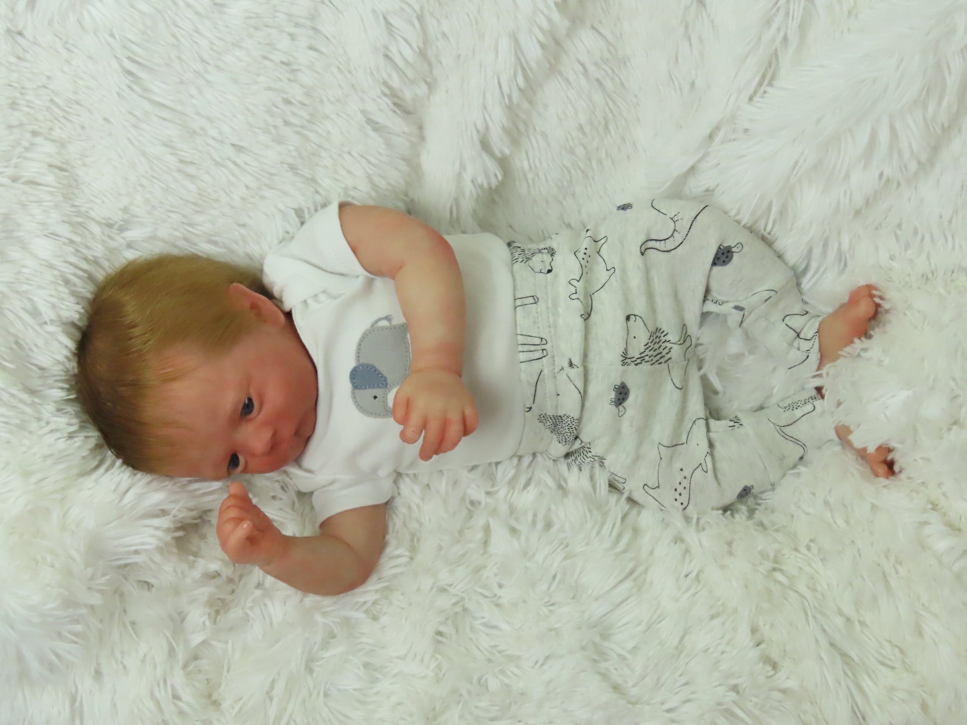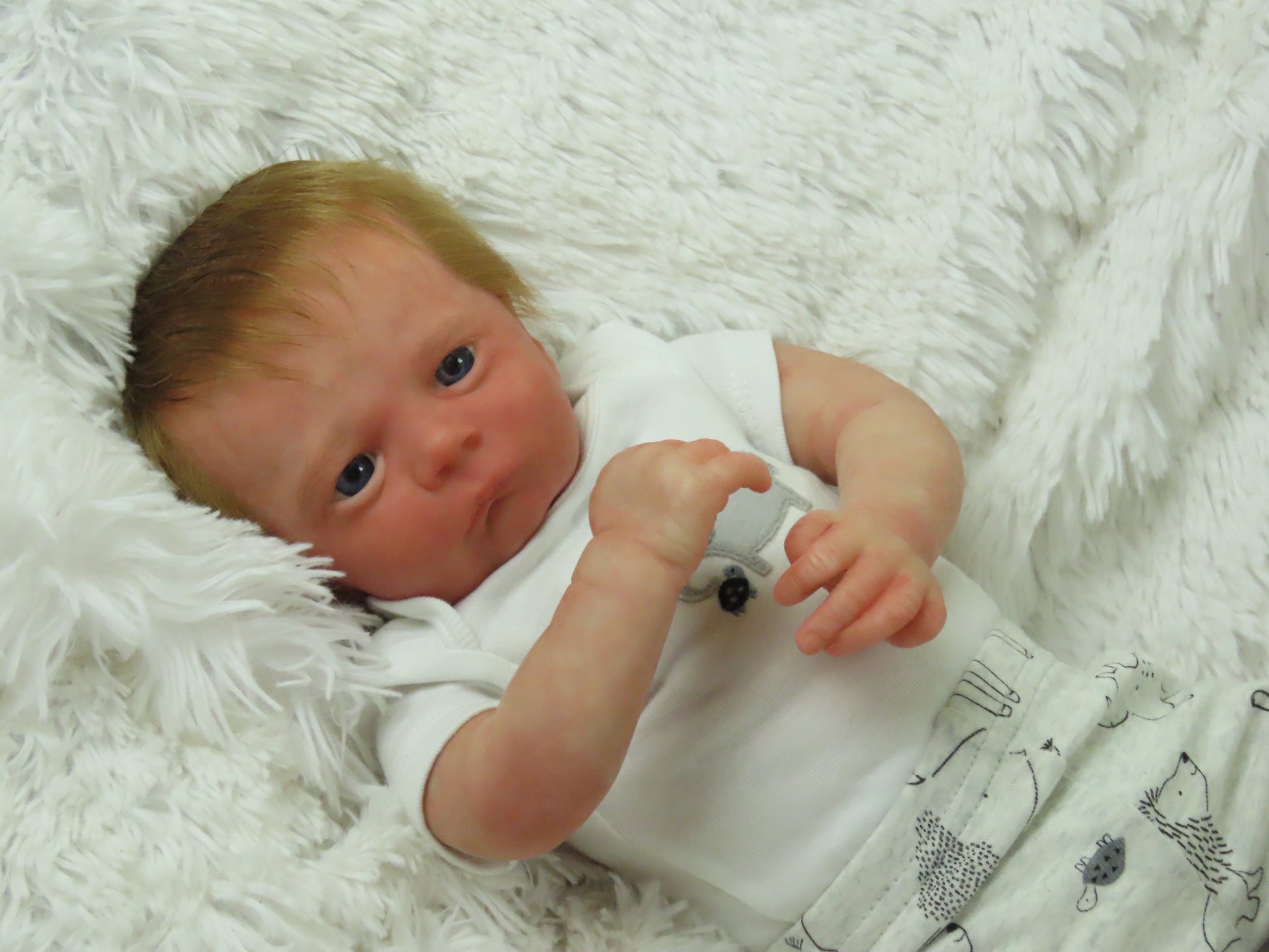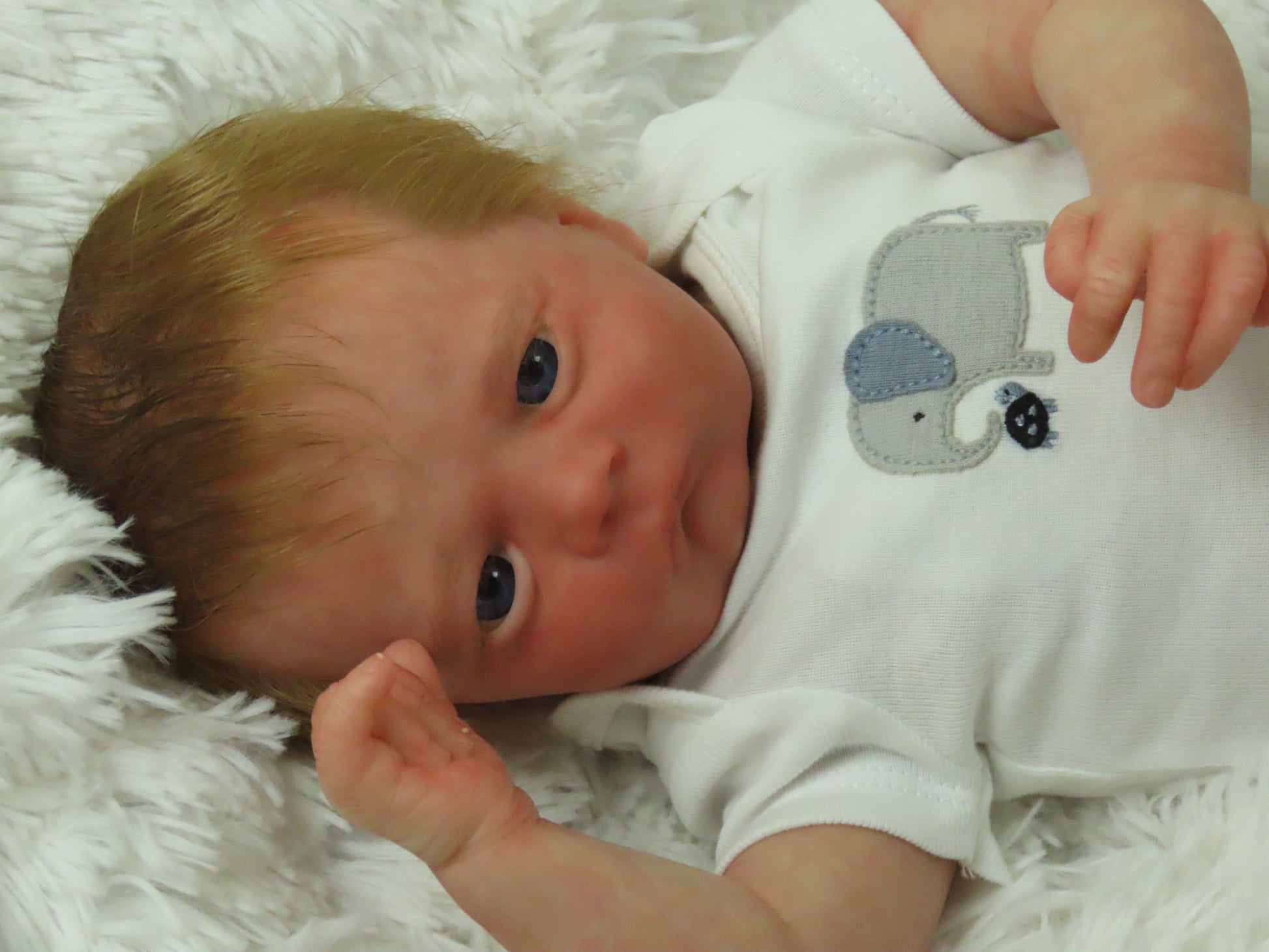 Baby will be reborned by me. He/She will have a Caucasian/White skintone similar to to photos above. He/She will have full vinyl arms and legs, and a flesh colored cloth body, making him/her pose-able. His/her eyelashes will be rooted and sealed inside. His/her nails will be manicured and sealed inside. He/she will be hand-painted with many translucent layers of Ultimate Fusion Paint, including subtle veining and soft mottling, to give him/her his/her lifelike features and making him/her one of a kind. He/she will also be weighted with fine glass beads and ultra soft fiberfill giving him/her that cuddly feel of a real baby