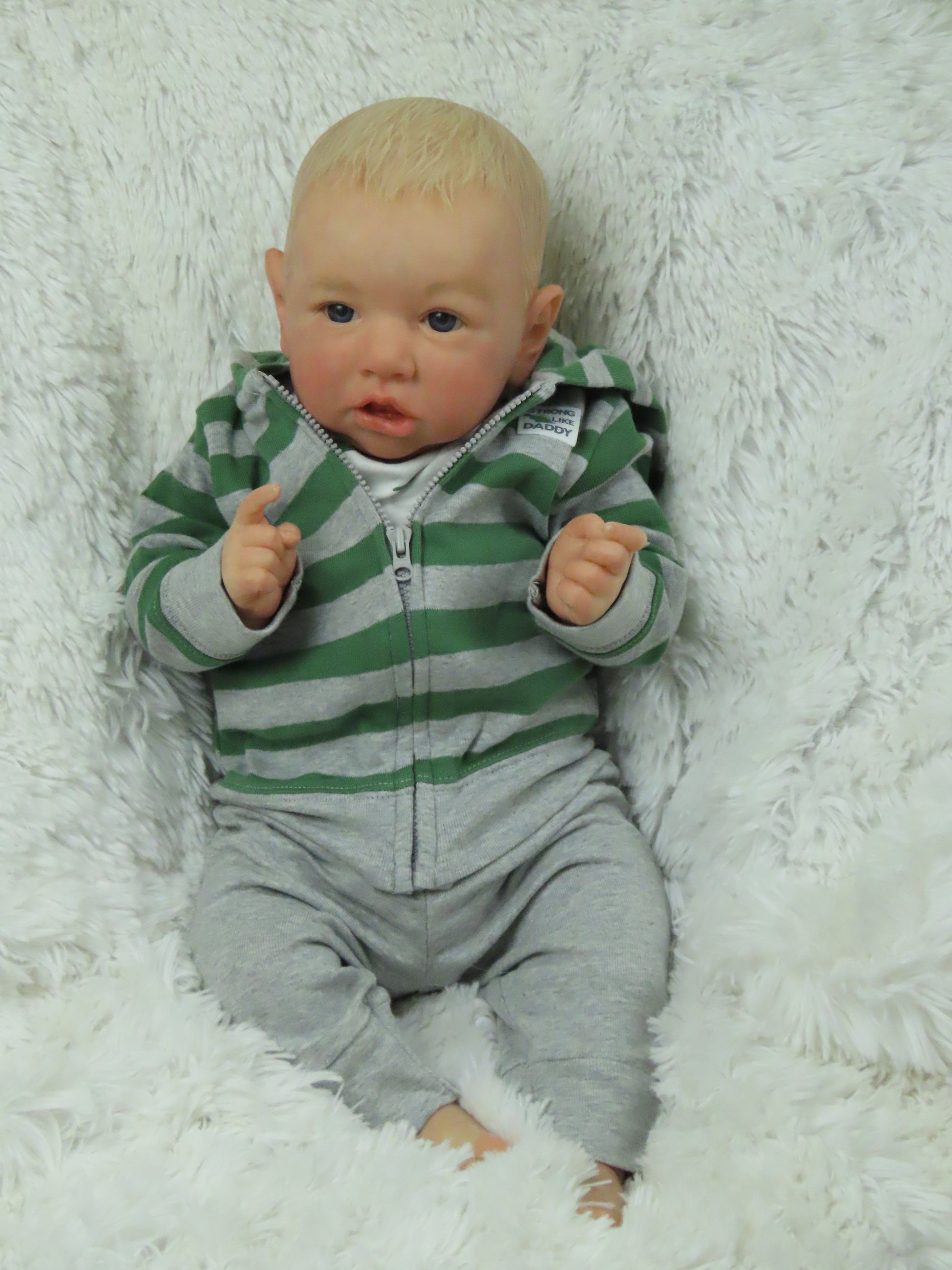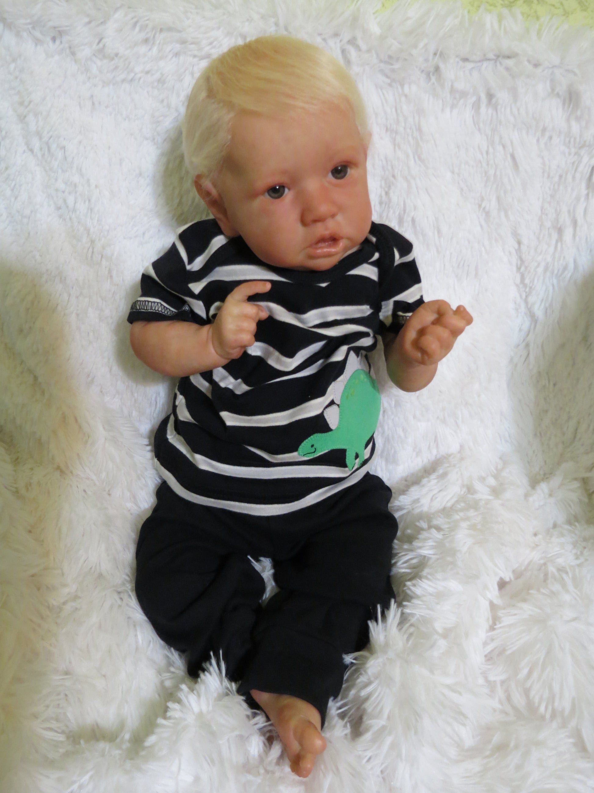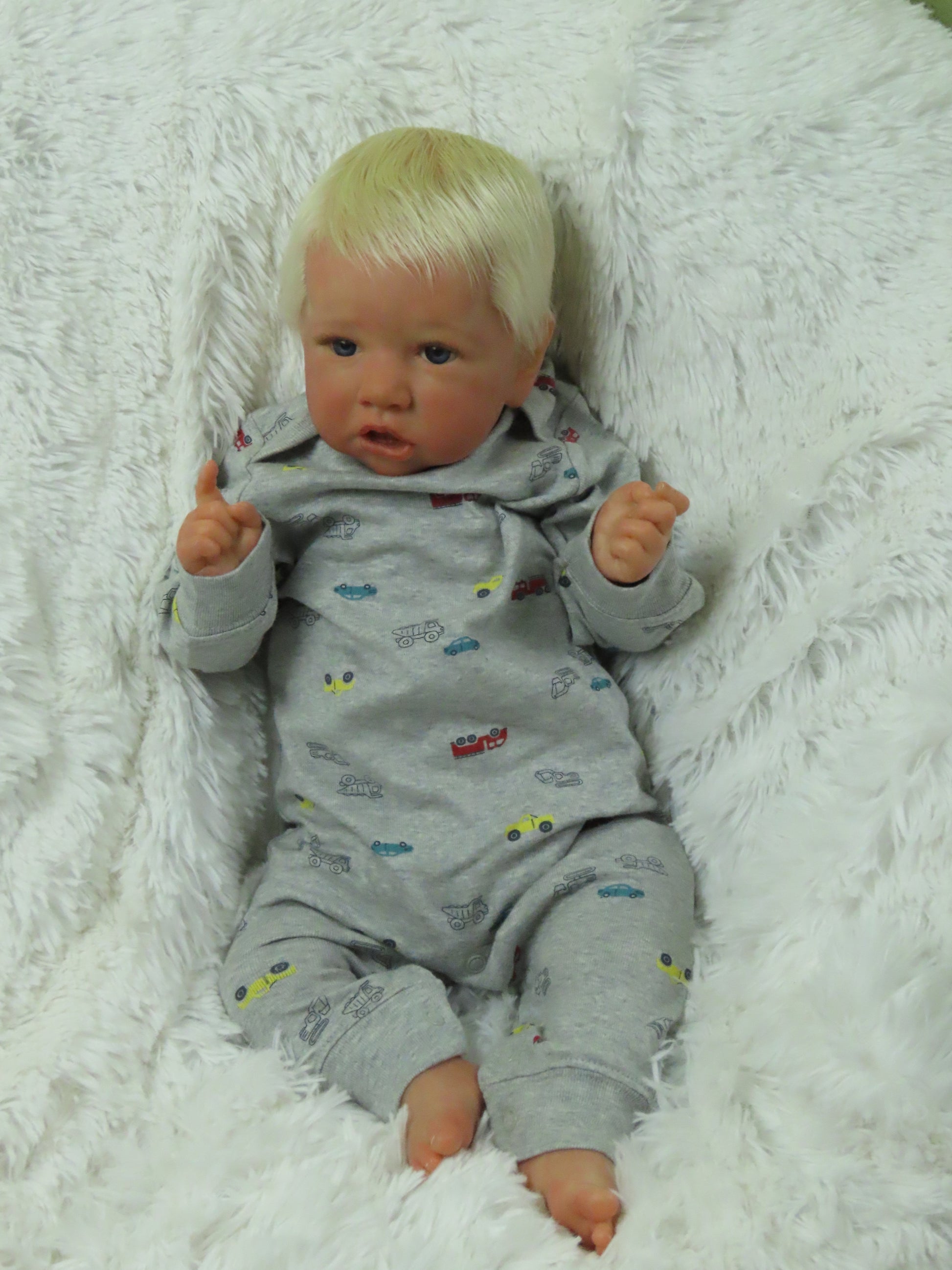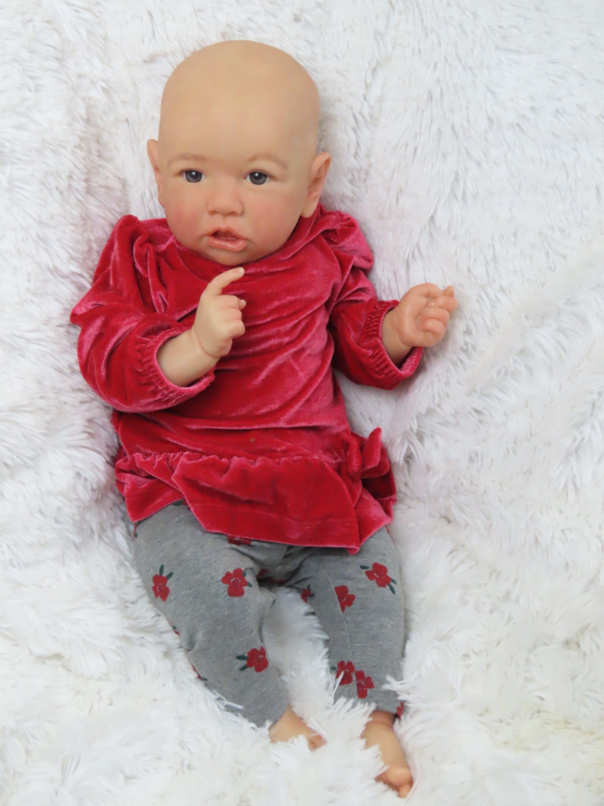 Baby will be reborned by me. He/She will have a Caucasian/White skintone similar to to photos above. He/She will have full vinyl arms and legs, and a flesh colored cloth body, making him/her pose-able. His/her eyelashes will be rooted and sealed inside. His/her nails will be manicured and sealed inside. He/she will be hand-painted with many translucent layers of Ultimate Fusion Paint, including subtle veining and soft mottling, to give him/her his/her lifelike features and making him/her one of a kind. He/she will also be weighted with fine glass beads and ultra soft fiberfill giving him/her that cuddly feel of a real baby