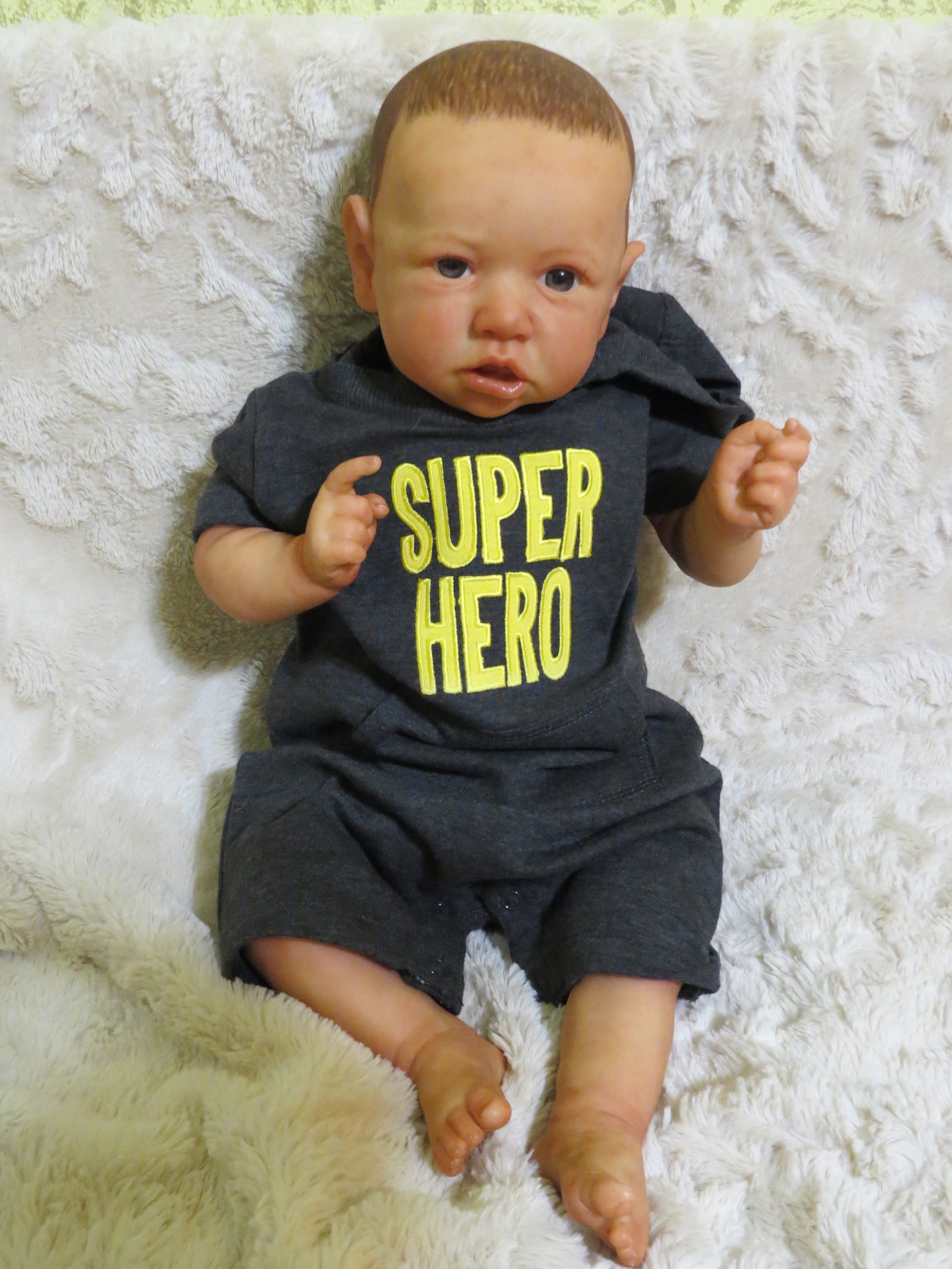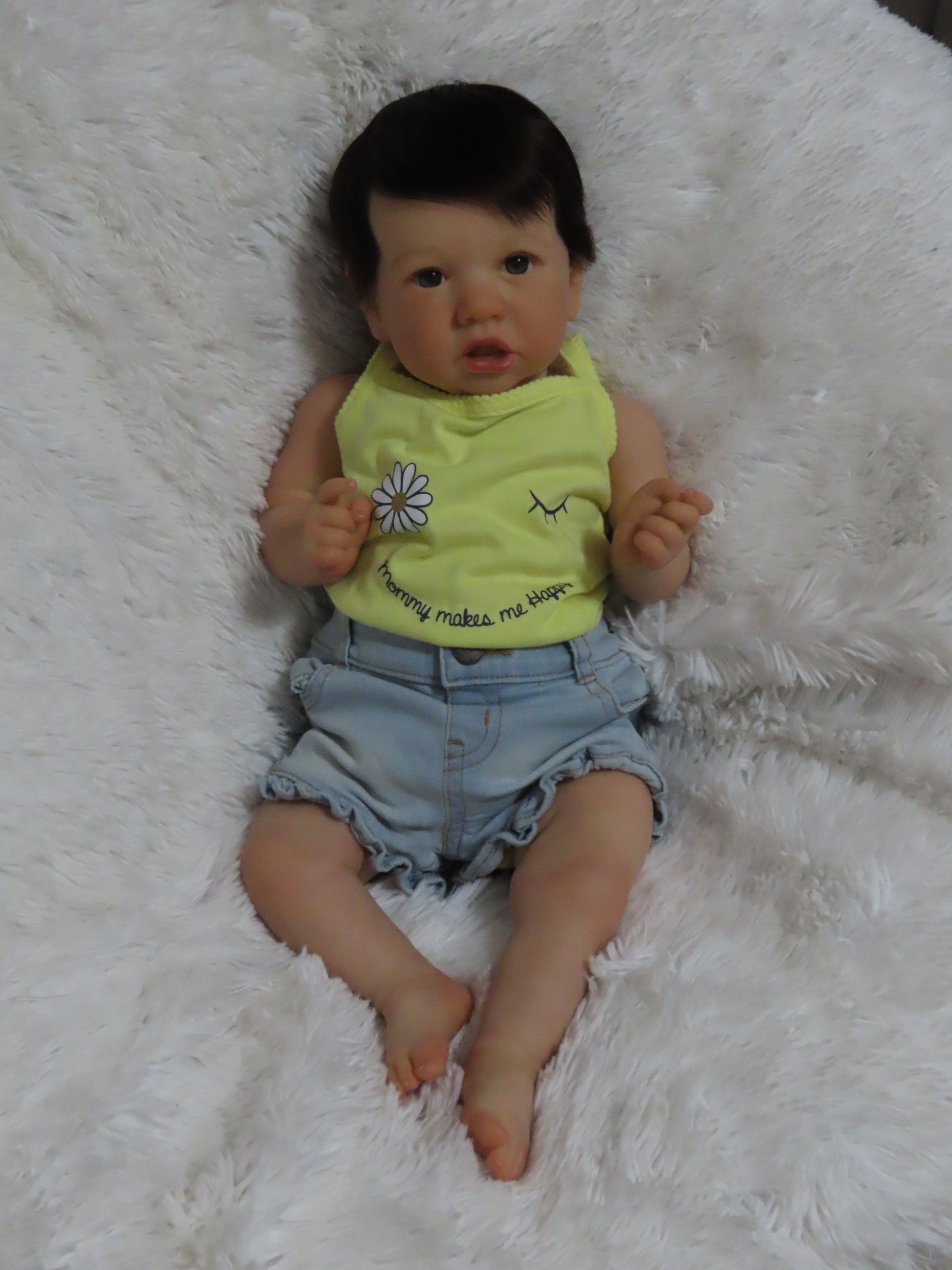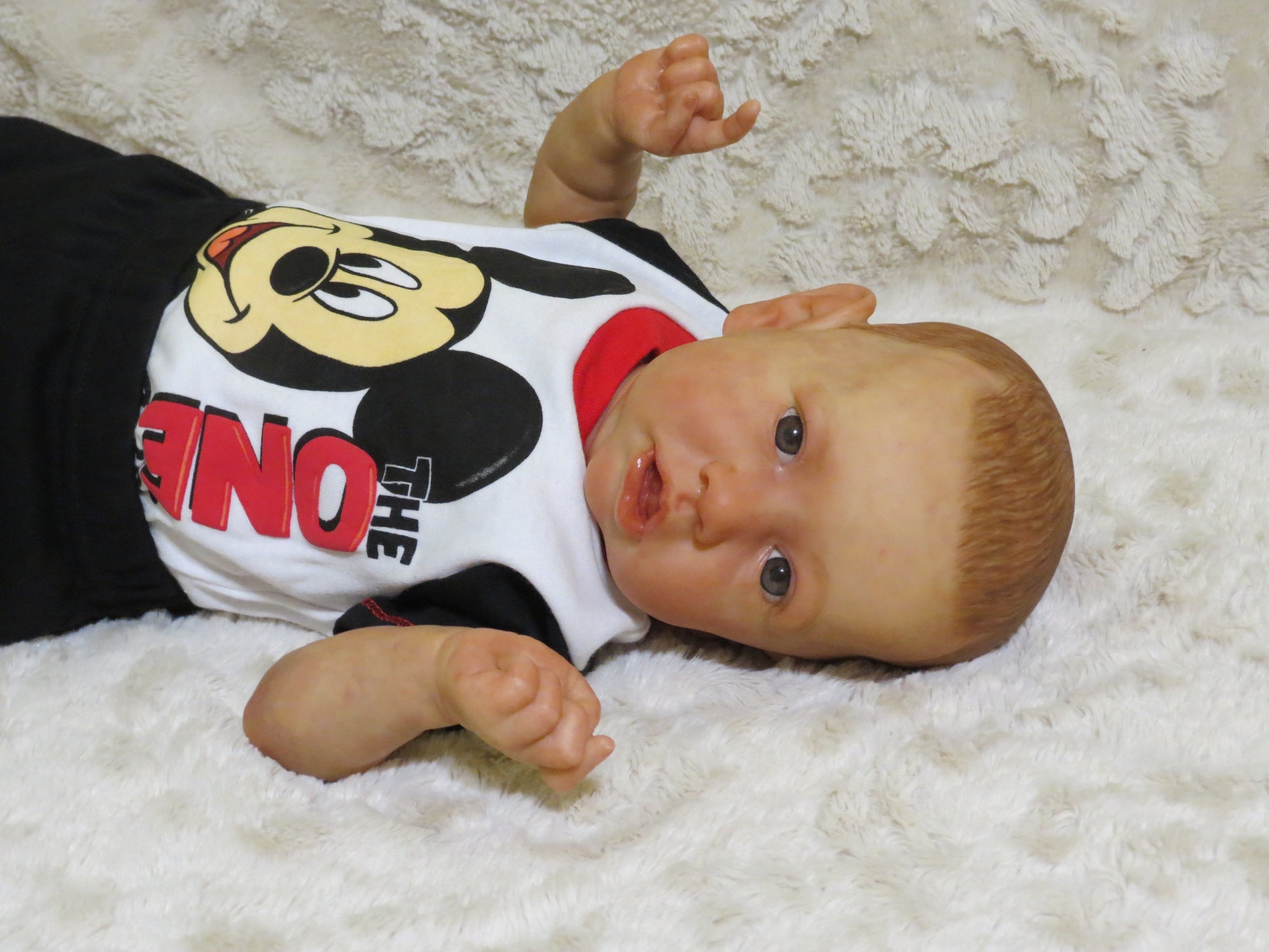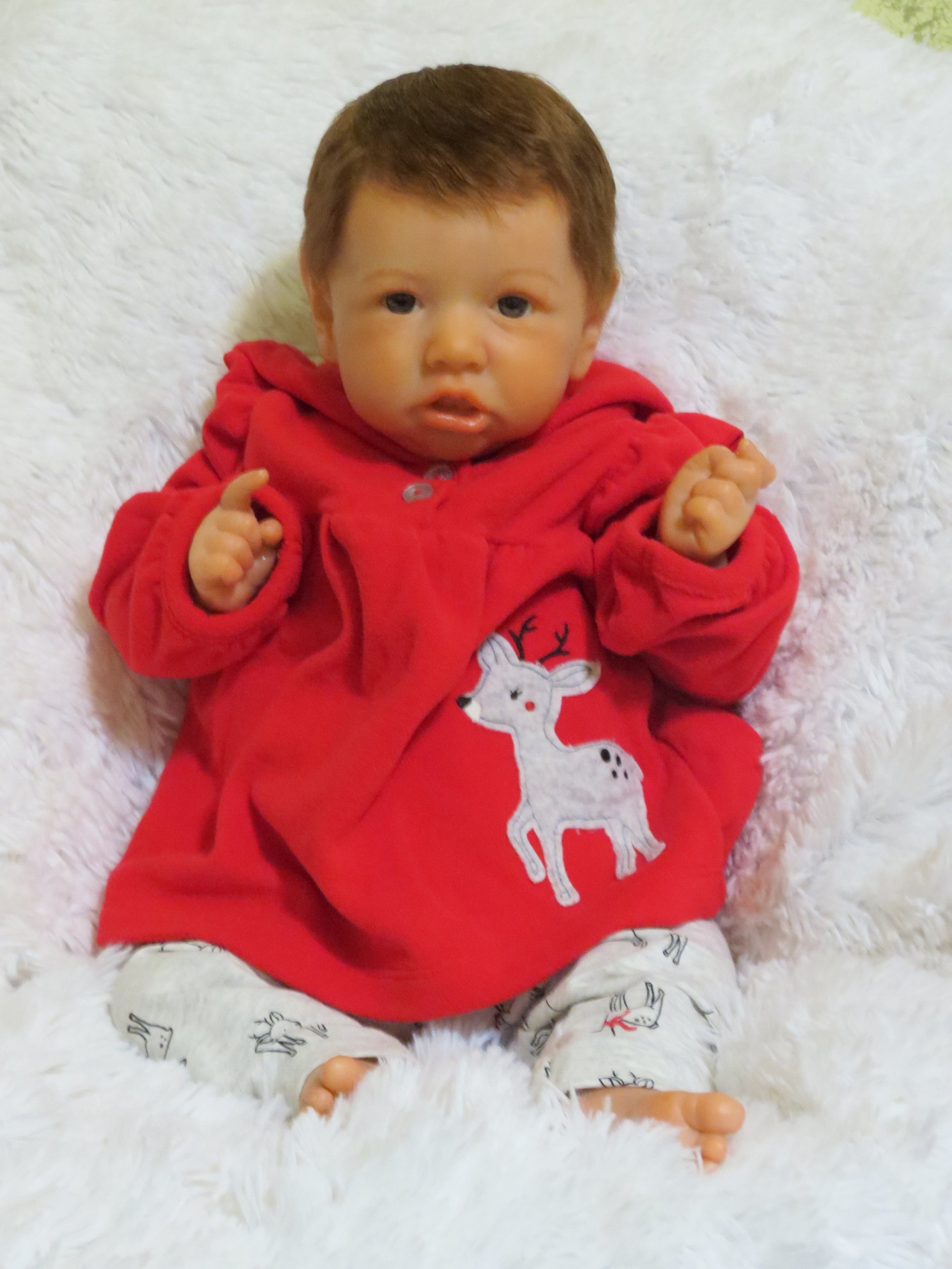Baby will be reborned by me. He/She will have a Caucasian/White skintone similar to to photos above. He/She will have full vinyl arms and legs, and a flesh colored cloth body, making him/her pose-able. His/her eyelashes will be rooted and sealed inside. His/her nails will be manicured and sealed inside. He/she will be hand-painted with many translucent layers of Ultimate Fusion Paint, including subtle veining and soft mottling, to give him/her his/her lifelike features and making him/her one of a kind. He/she will also be weighted with fine glass beads and ultra soft fiberfill giving him/her that cuddly feel of a real baby