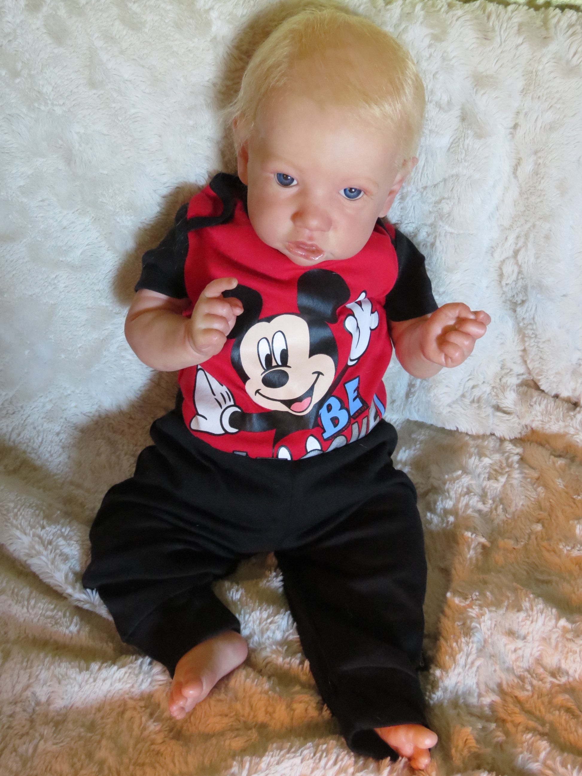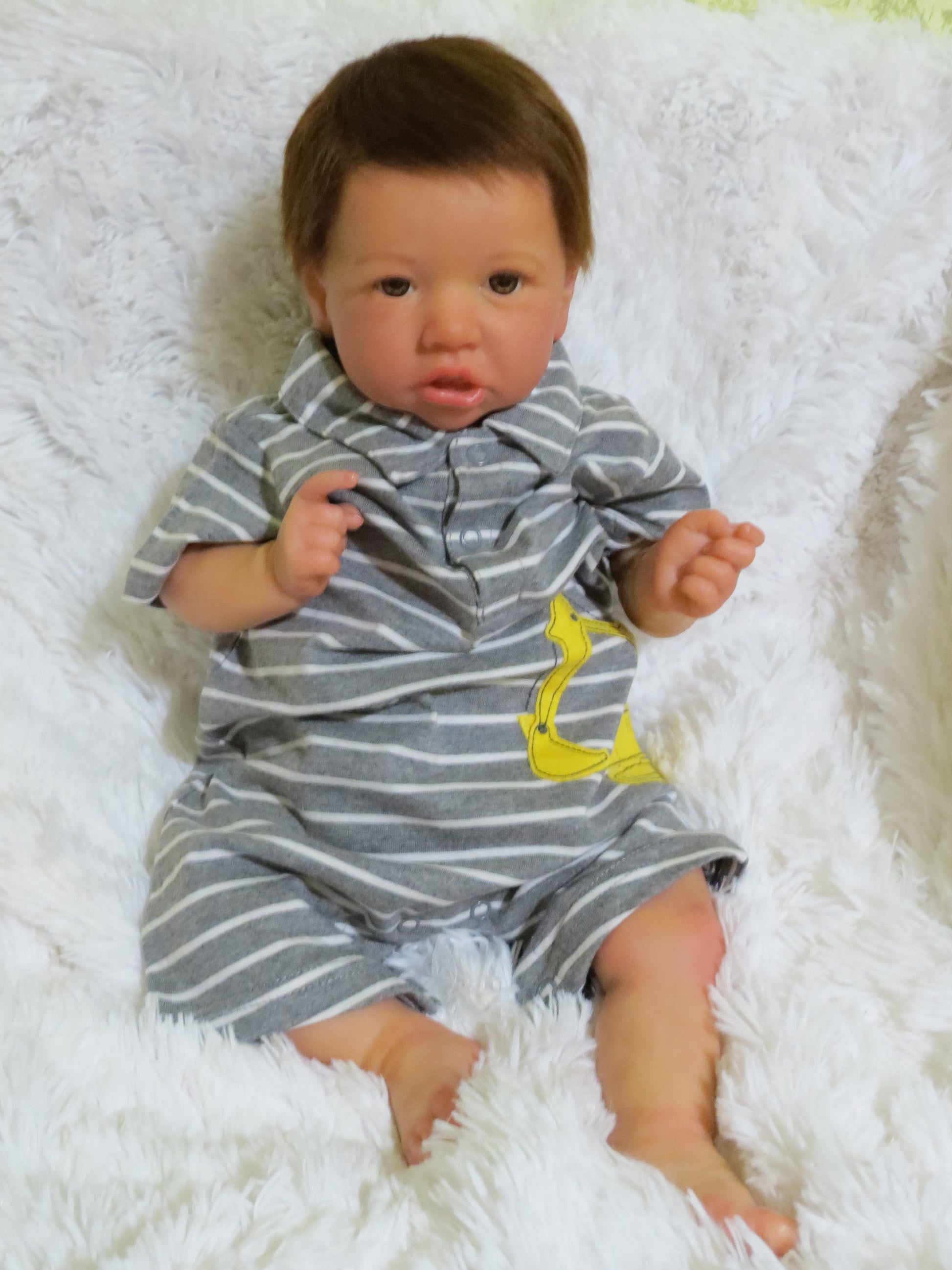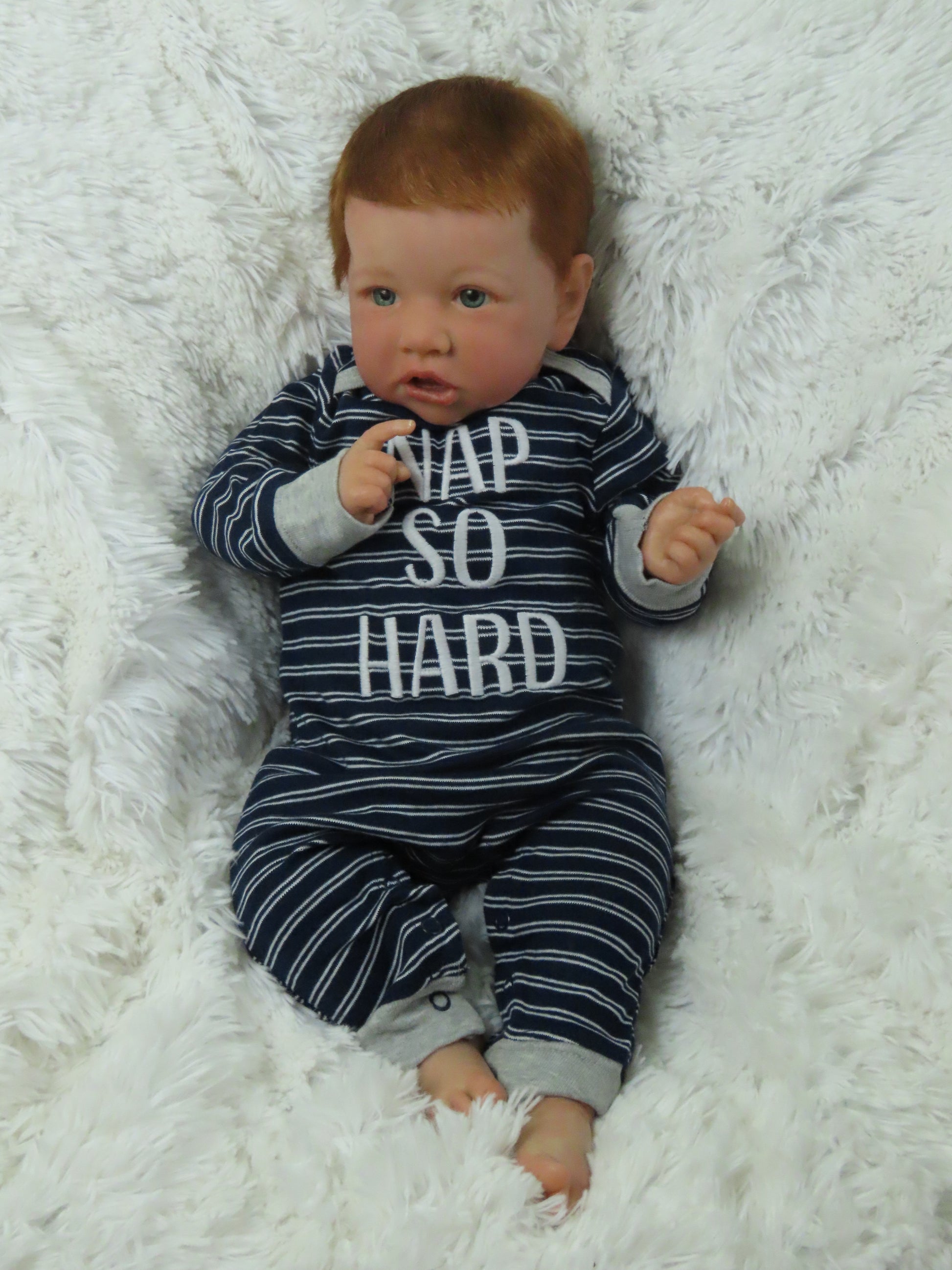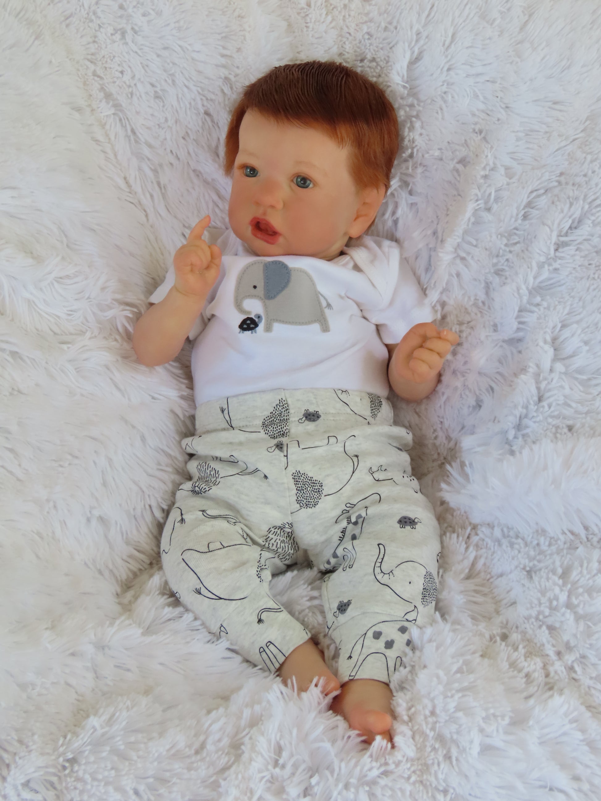 Baby will be reborned by me. He/She will have a Caucasian/White skintone similar to to photos above. He/She will have full vinyl arms and legs, and a flesh colored cloth body, making him/her pose-able. His/her eyelashes will be rooted and sealed inside. His/her nails will be manicured and sealed inside. He/she will be hand-painted with many translucent layers of Ultimate Fusion Paint, including subtle veining and soft mottling, to give him/her his/her lifelike features and making him/her one of a kind. He/she will also be weighted with fine glass beads and ultra soft fiberfill giving him/her that cuddly feel of a real baby