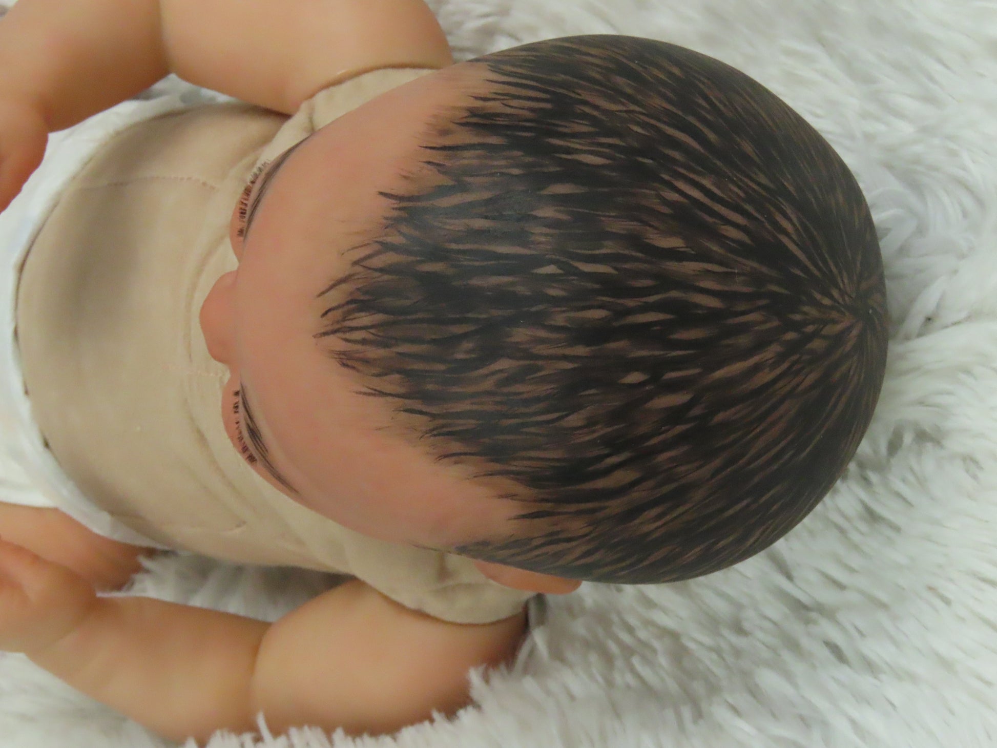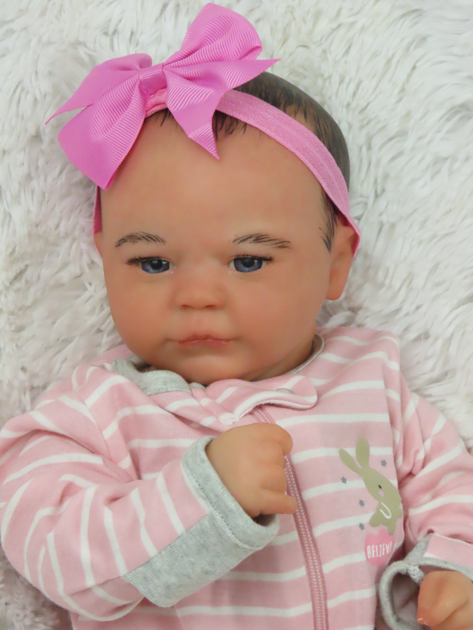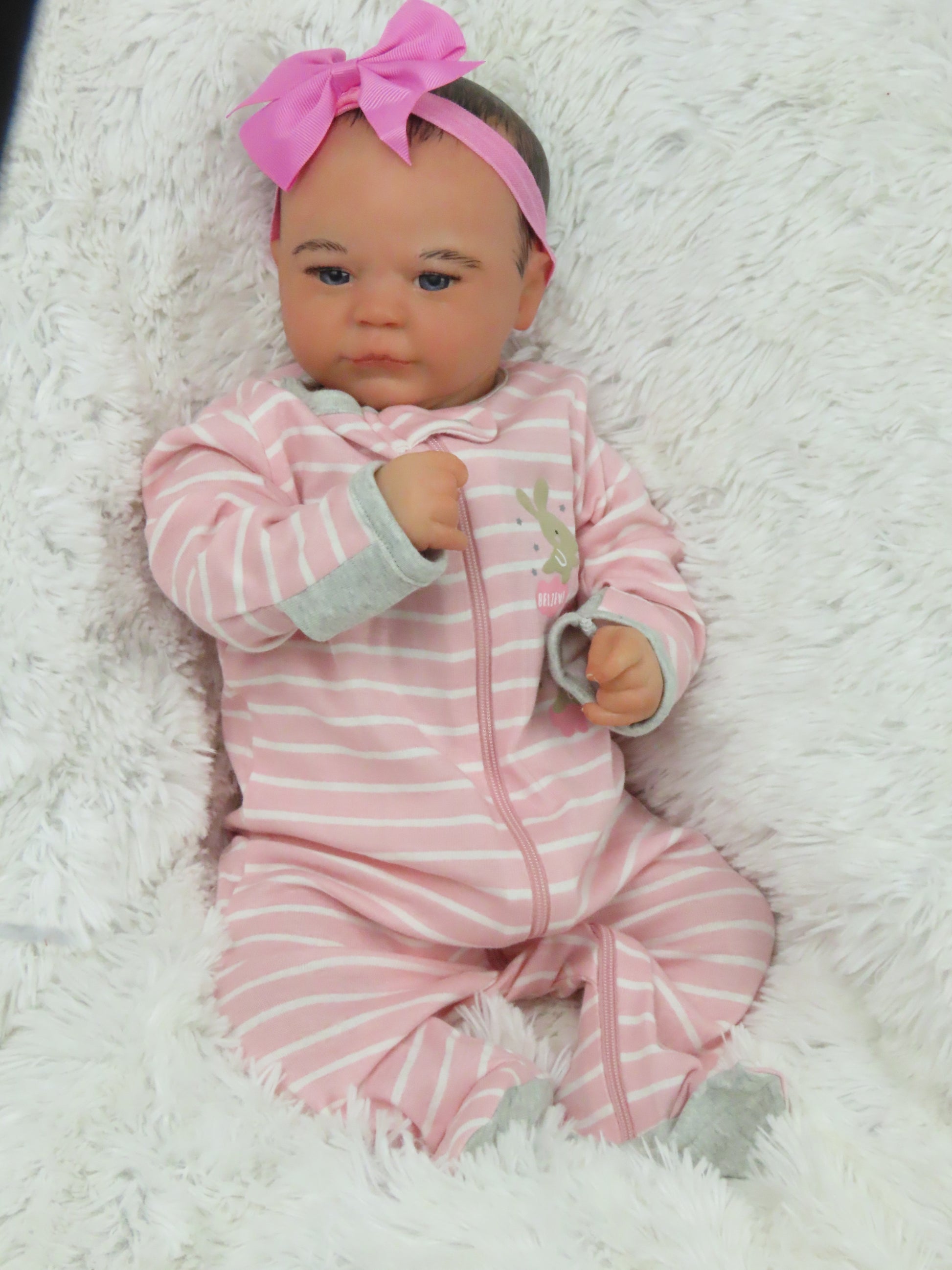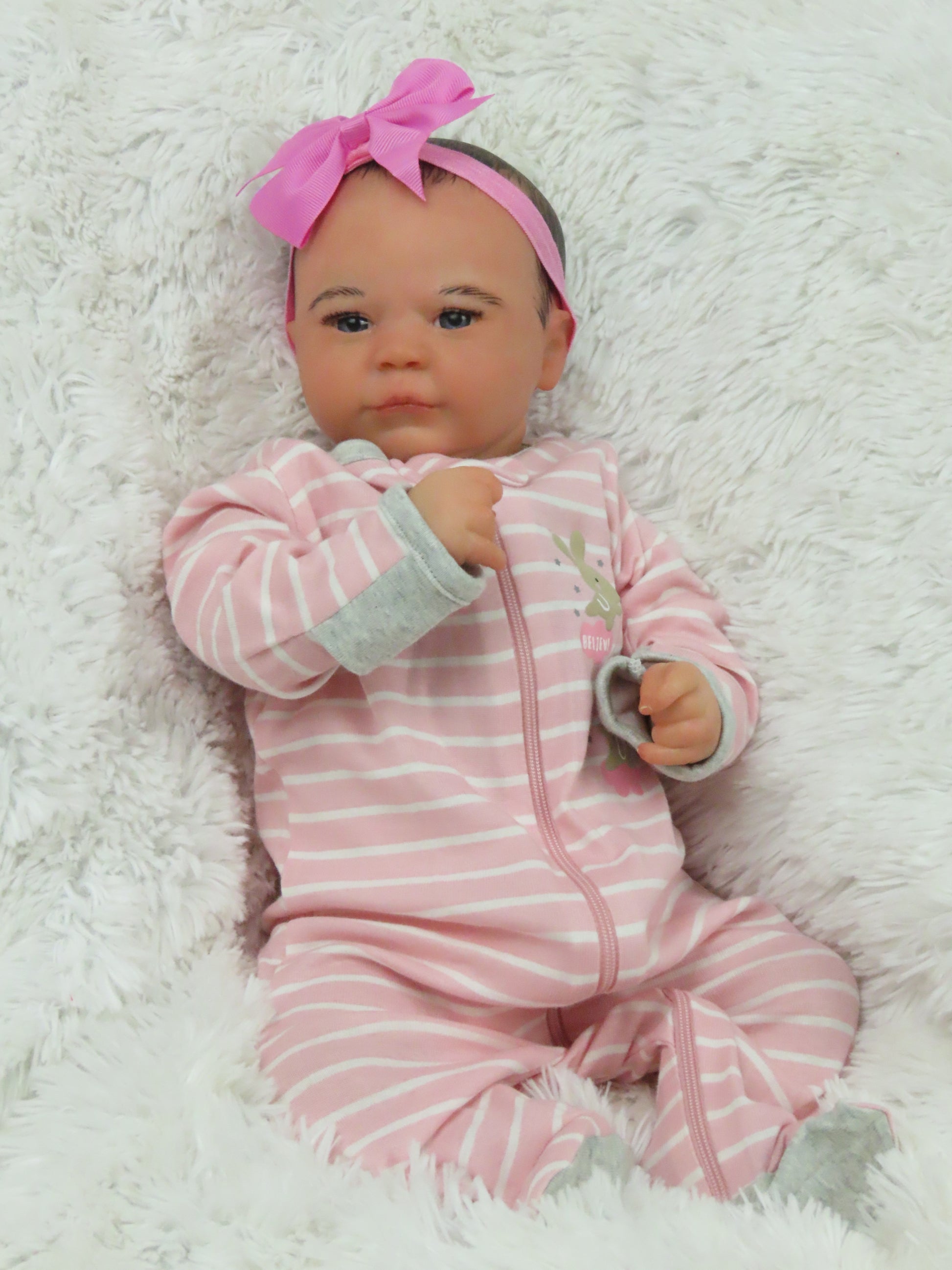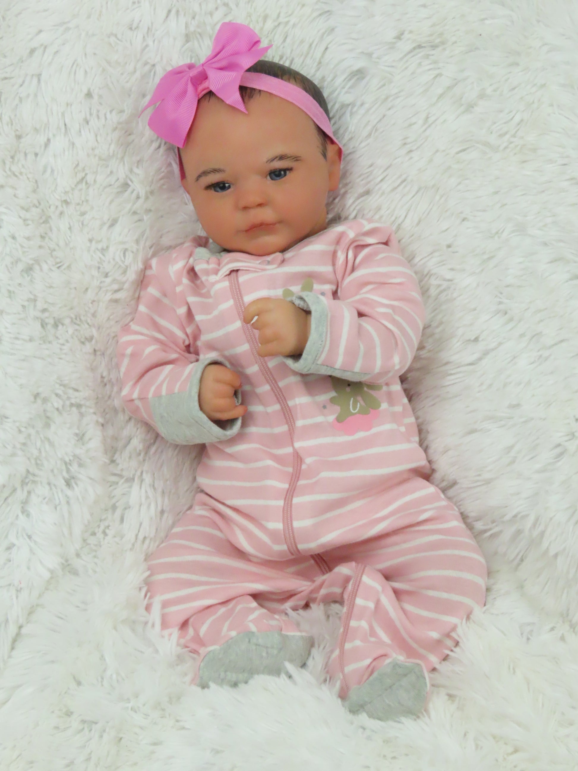 She has full vinyl arms and legs and a flesh colored doe suede cloth body, making her pose-able. Her eyelashes are rooted and sealed inside. Her nails are manicured and sealed. She is hand-painted using many translucent layers of Ultimate Fusion Paint, including subtle veining and mottling, to give her her lifelike appearance and making her one of a kind. She is weighted with fine glass beads and ultra soft fiberfill giving her that cuddly feel of a real baby.
