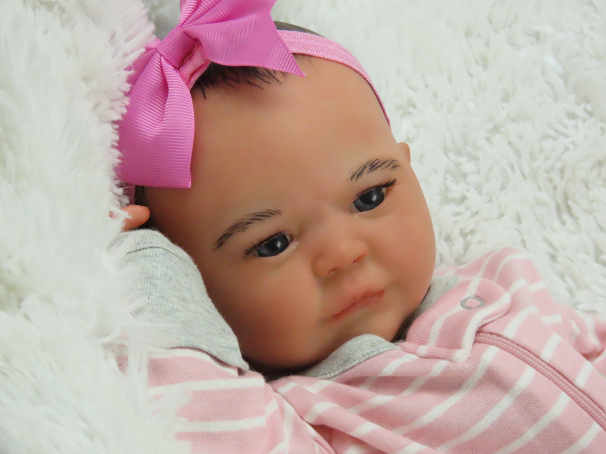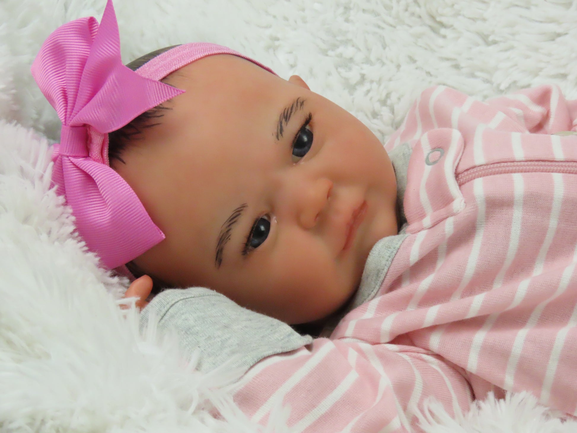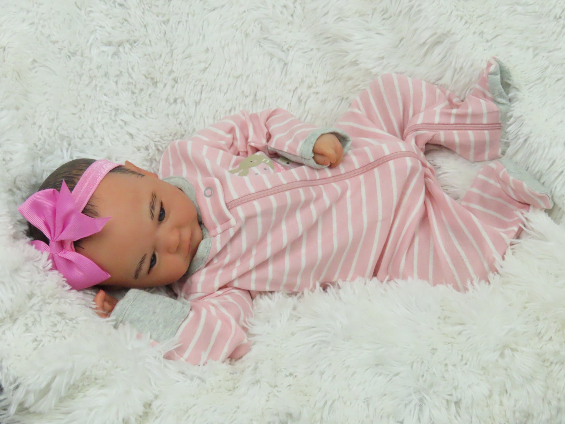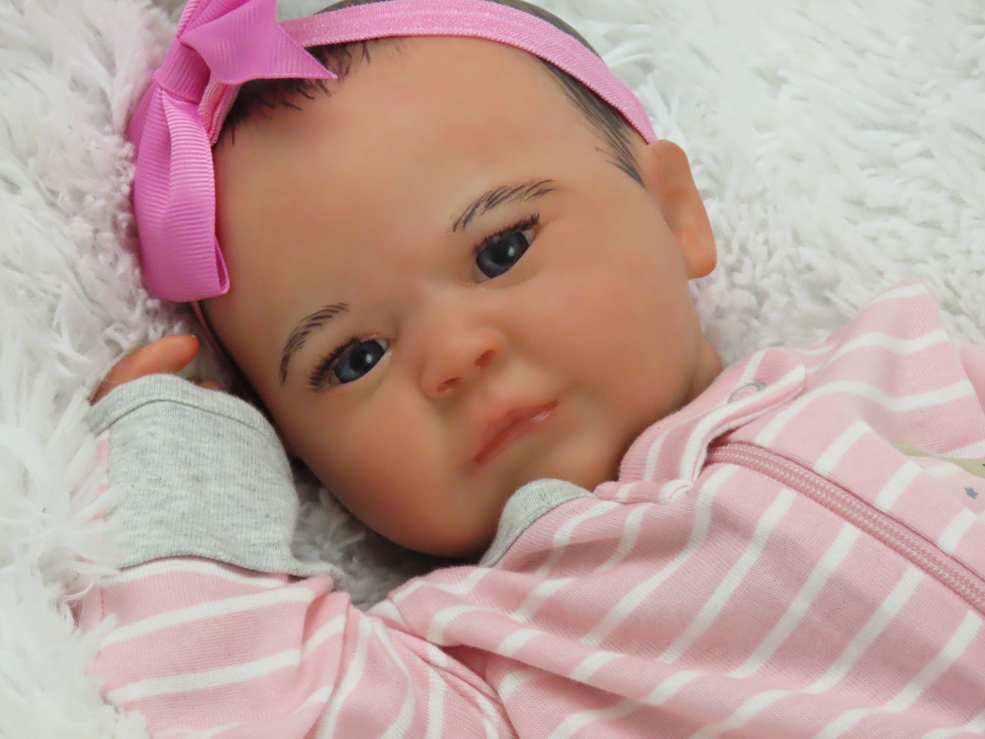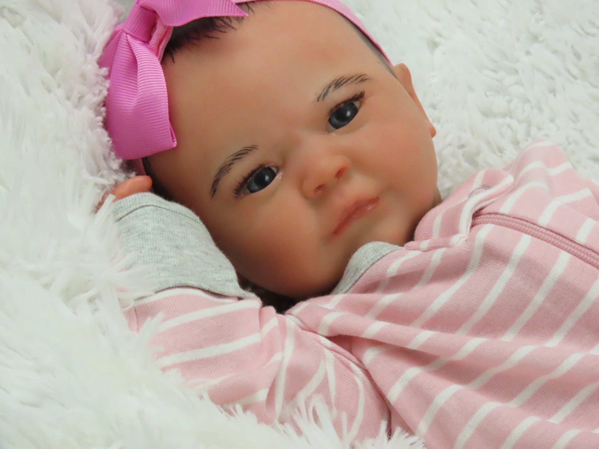 She has full vinyl arms and legs and a flesh colored doe suede cloth body, making her pose-able. Her eyelashes are rooted and sealed inside. Her nails are manicured and sealed. She is hand-painted using many translucent layers of Ultimate Fusion Paint, including subtle veining and mottling, to give her her lifelike appearance and making her one of a kind. She is weighted with fine glass beads and ultra soft fiberfill giving her that cuddly feel of a real baby.