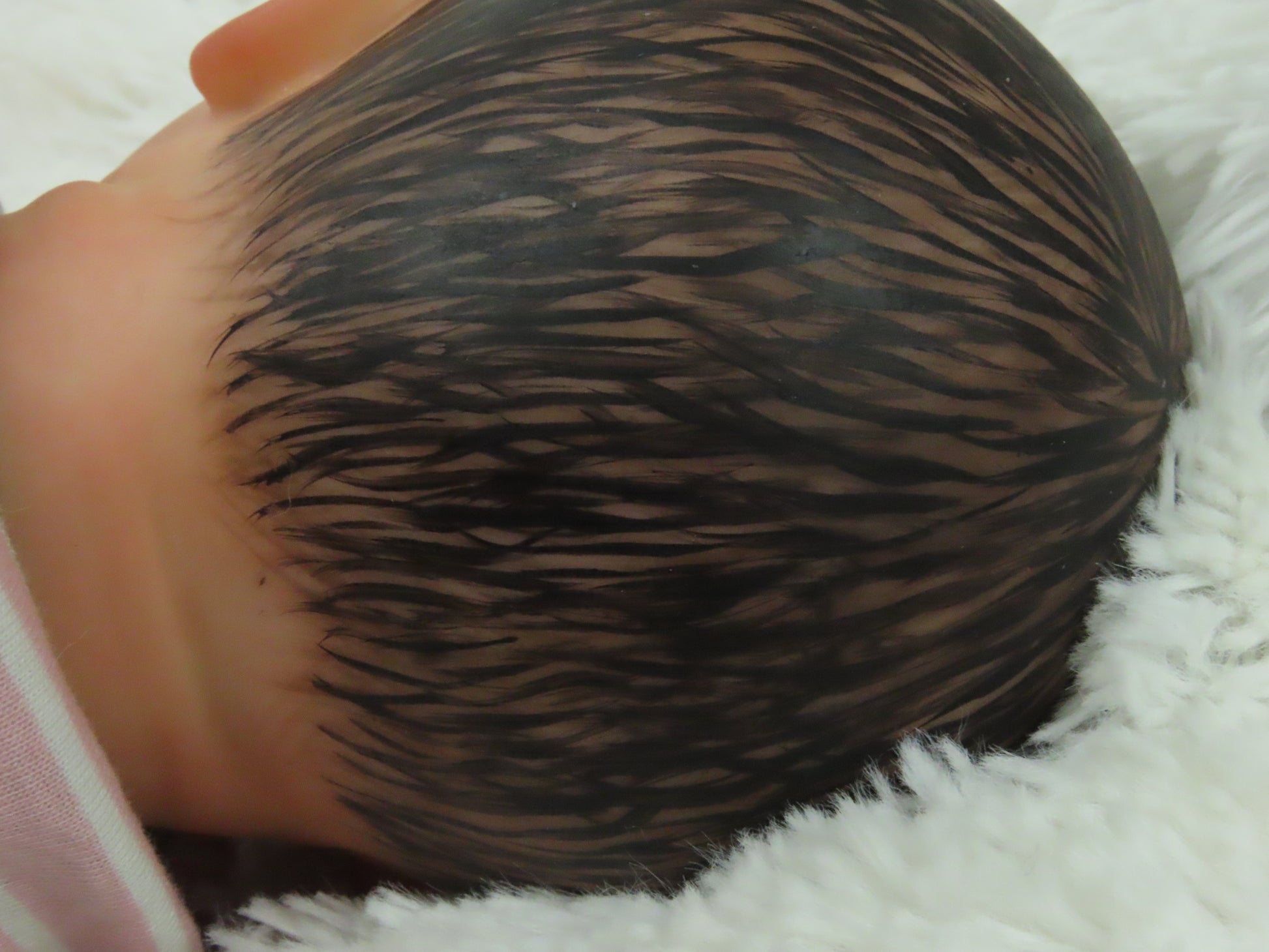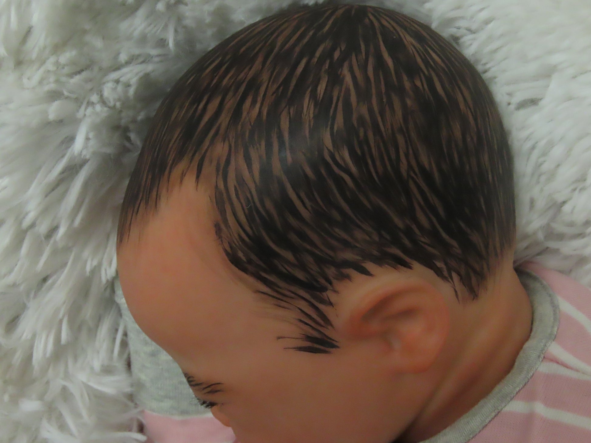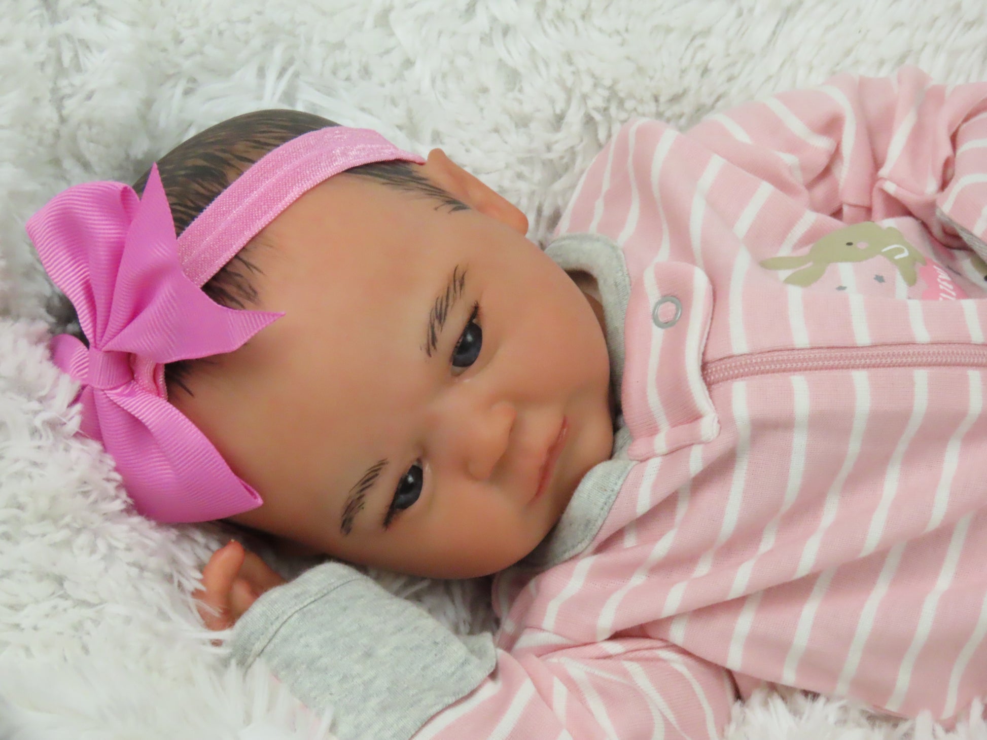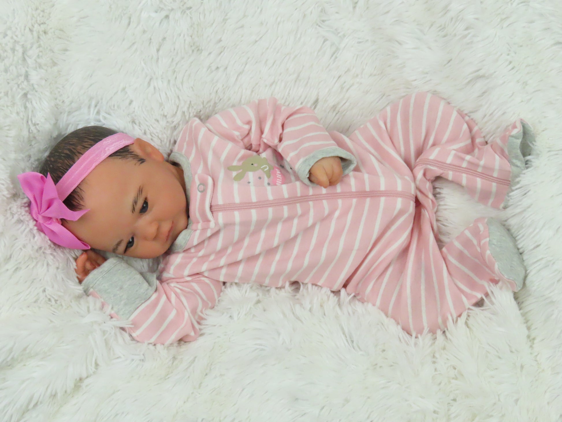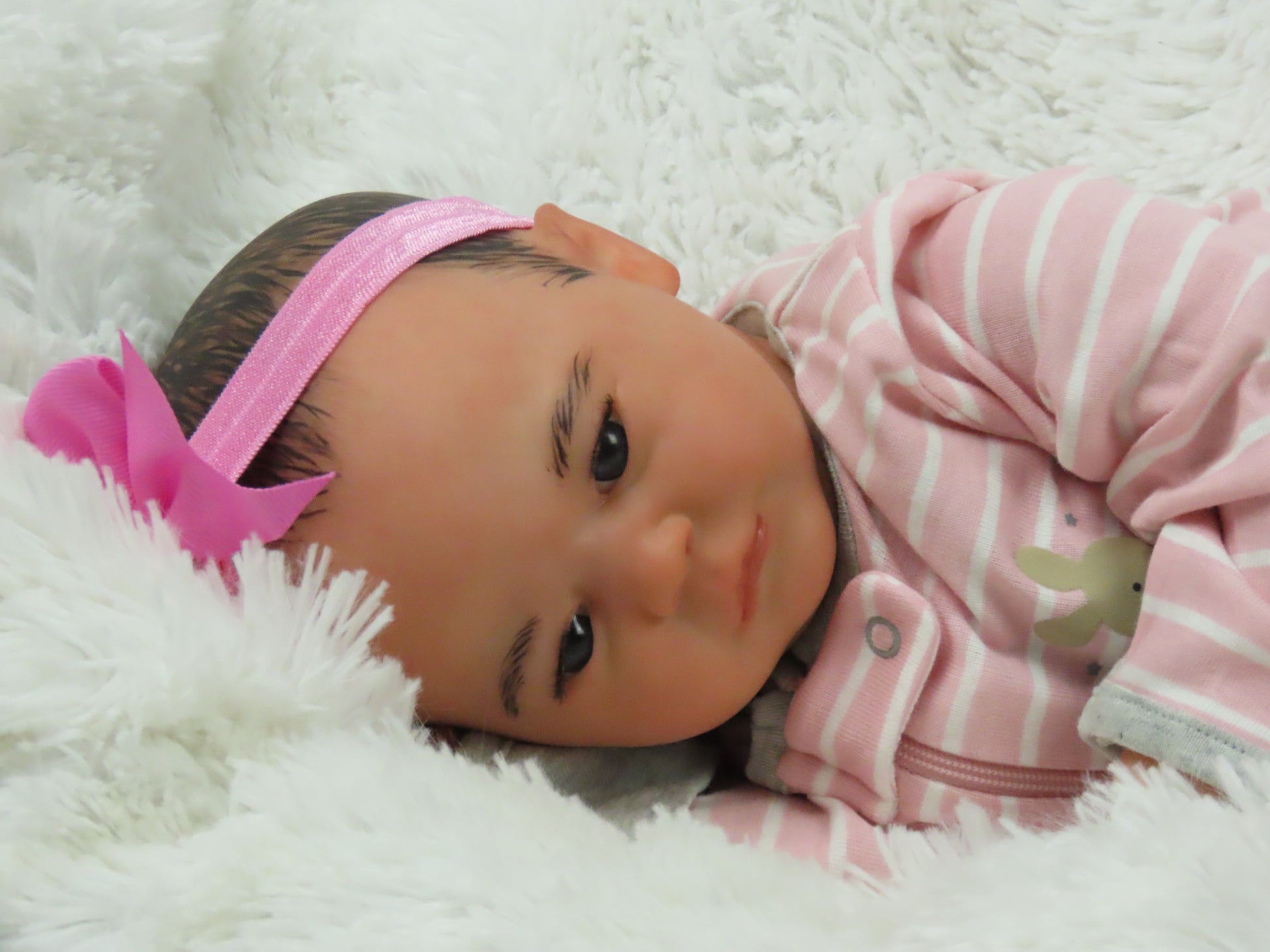 She has full vinyl arms and legs and a flesh colored doe suede cloth body, making her pose-able. Her eyelashes are rooted and sealed inside. Her nails are manicured and sealed. She is hand-painted using many translucent layers of Ultimate Fusion Paint, including subtle veining and mottling, to give her her lifelike appearance and making her one of a kind. She is weighted with fine glass beads and ultra soft fiberfill giving her that cuddly feel of a real baby.