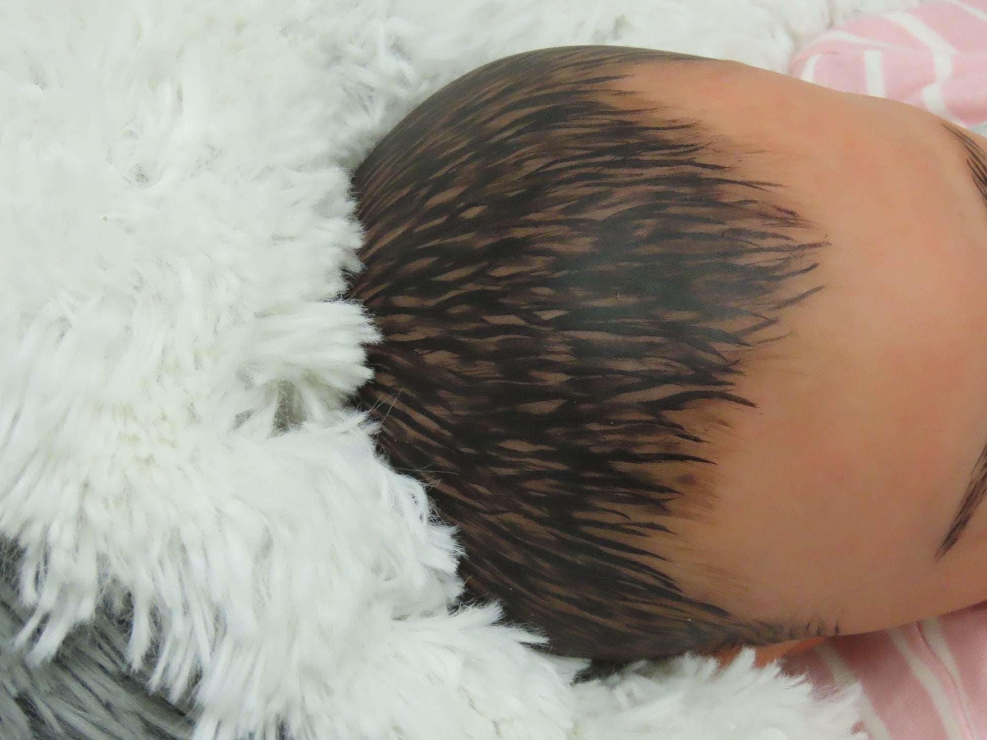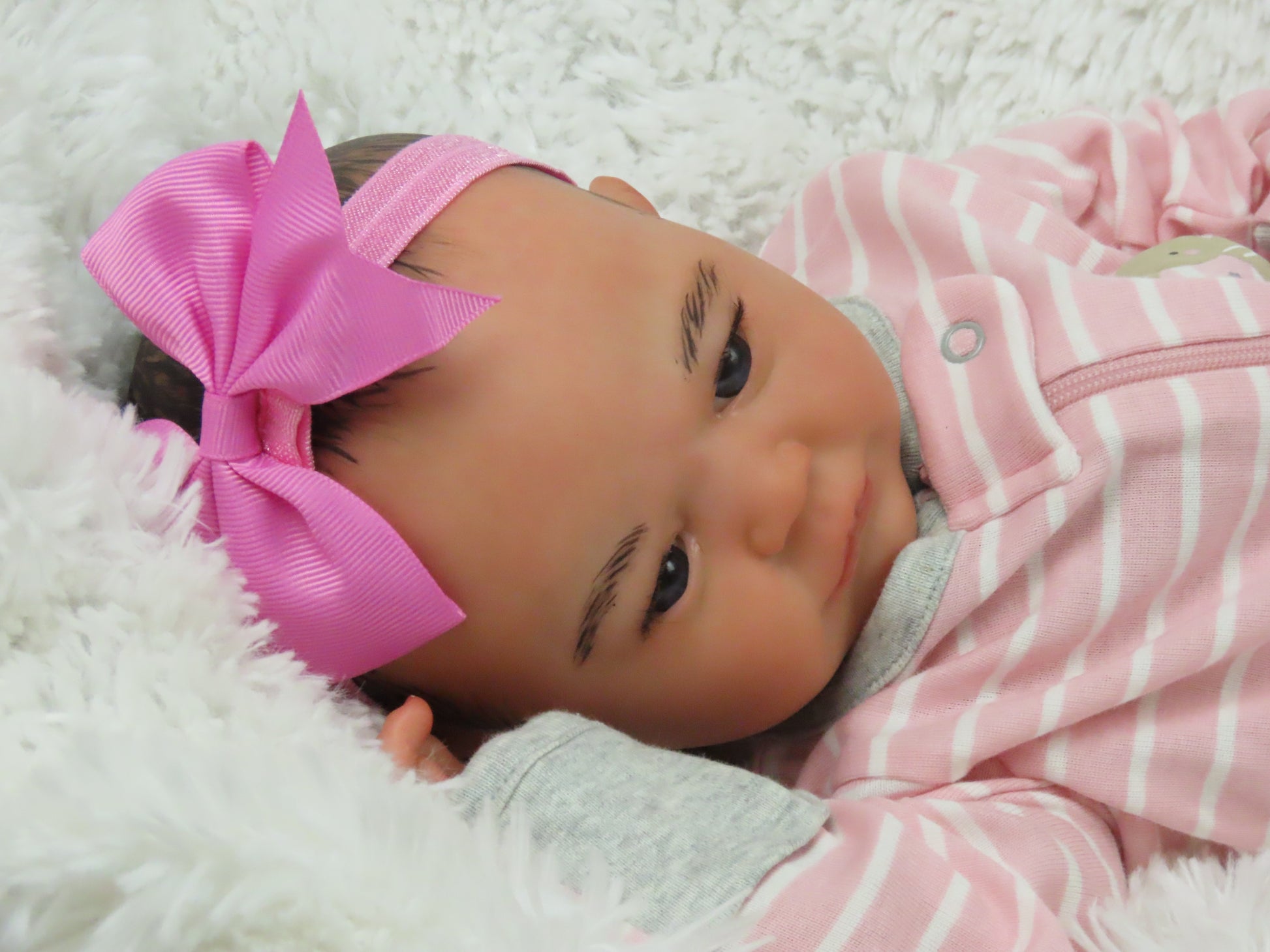 This sweet baby girl was born from the Summer Rain Awake kit, weighs 5 lbs 6 oz, and is 18 inches long. She has painteddark brown hair, rooted eyelashes, and newborn gray eyes. She can wear newborn size clothing.