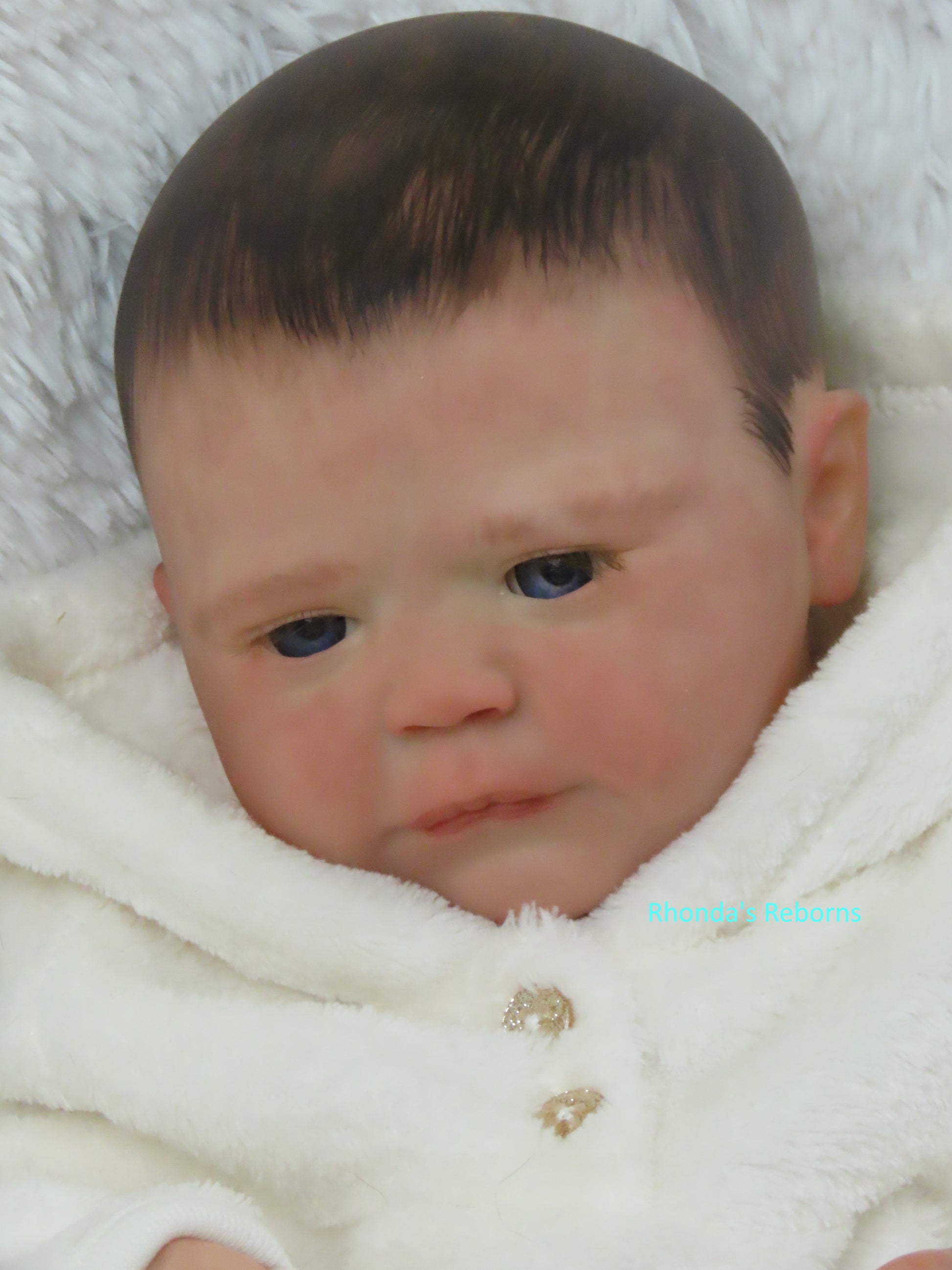 Baby will be reborned by me. He/She will have a Caucasian/White skintone similar to to photos above. He/She will have full vinyl arms and legs, and a flesh colored cloth body, making him/her pose-able. His/her eyelashes will be rooted and sealed inside. His/her nails will be manicured and sealed inside. He/she will be hand-painted with many translucent layers of Ultimate Fusion Paint, including subtle veining and soft mottling, to give him/her his/her lifelike features and making him/her one of a kind. He/she will also be weighted with fine glass beads and ultra soft fiberfill giving him/her that cuddly feel of a real baby