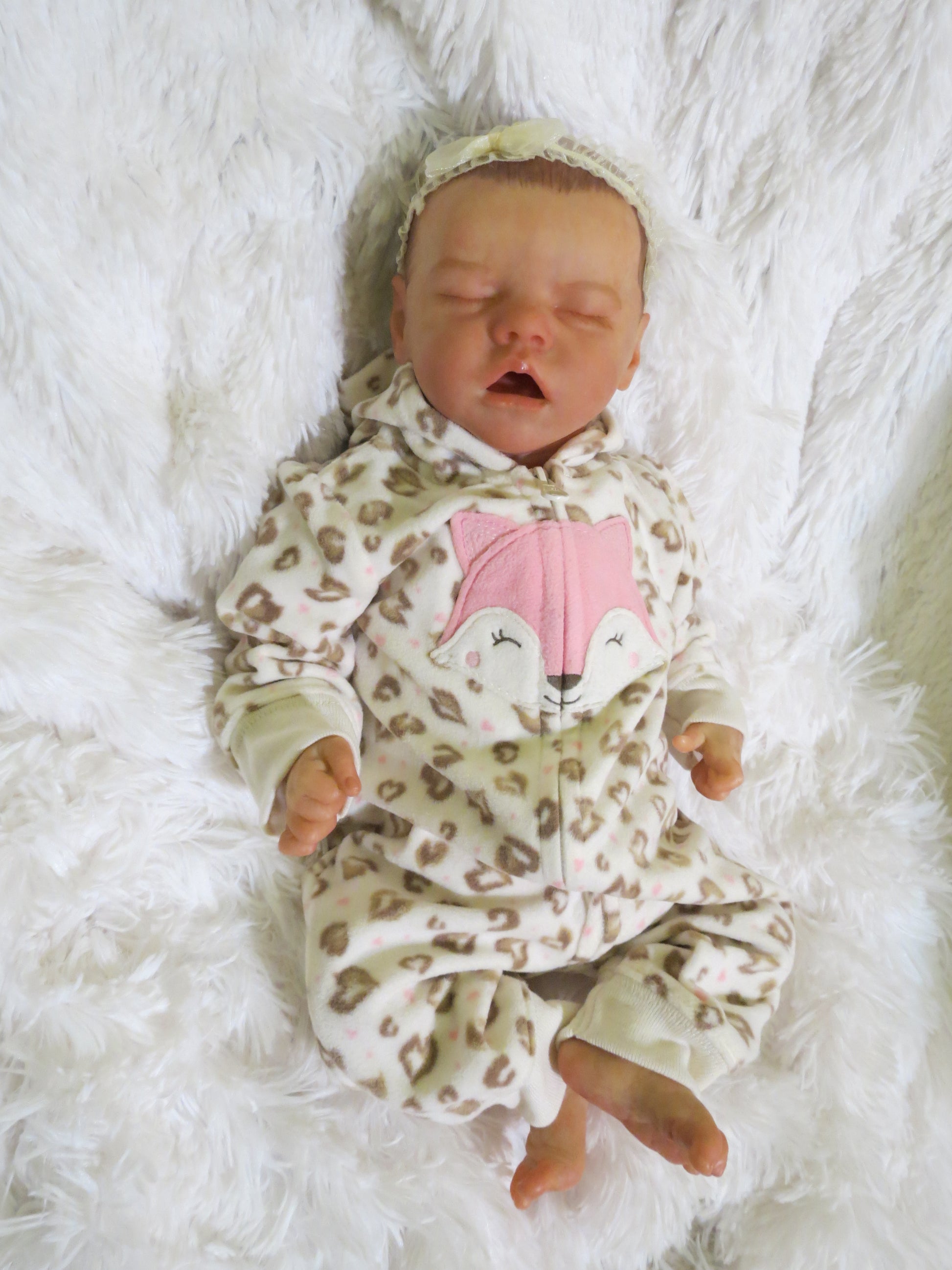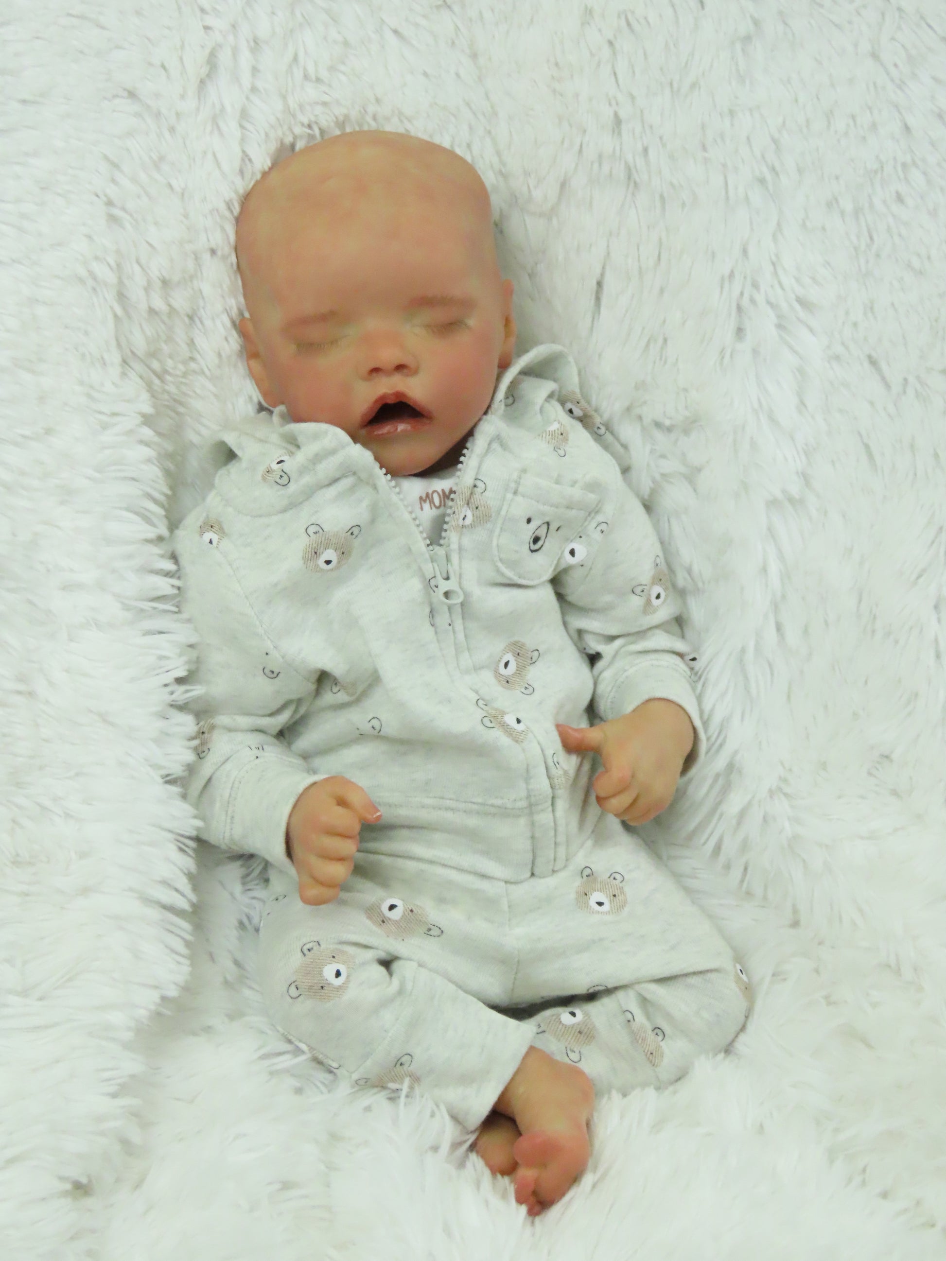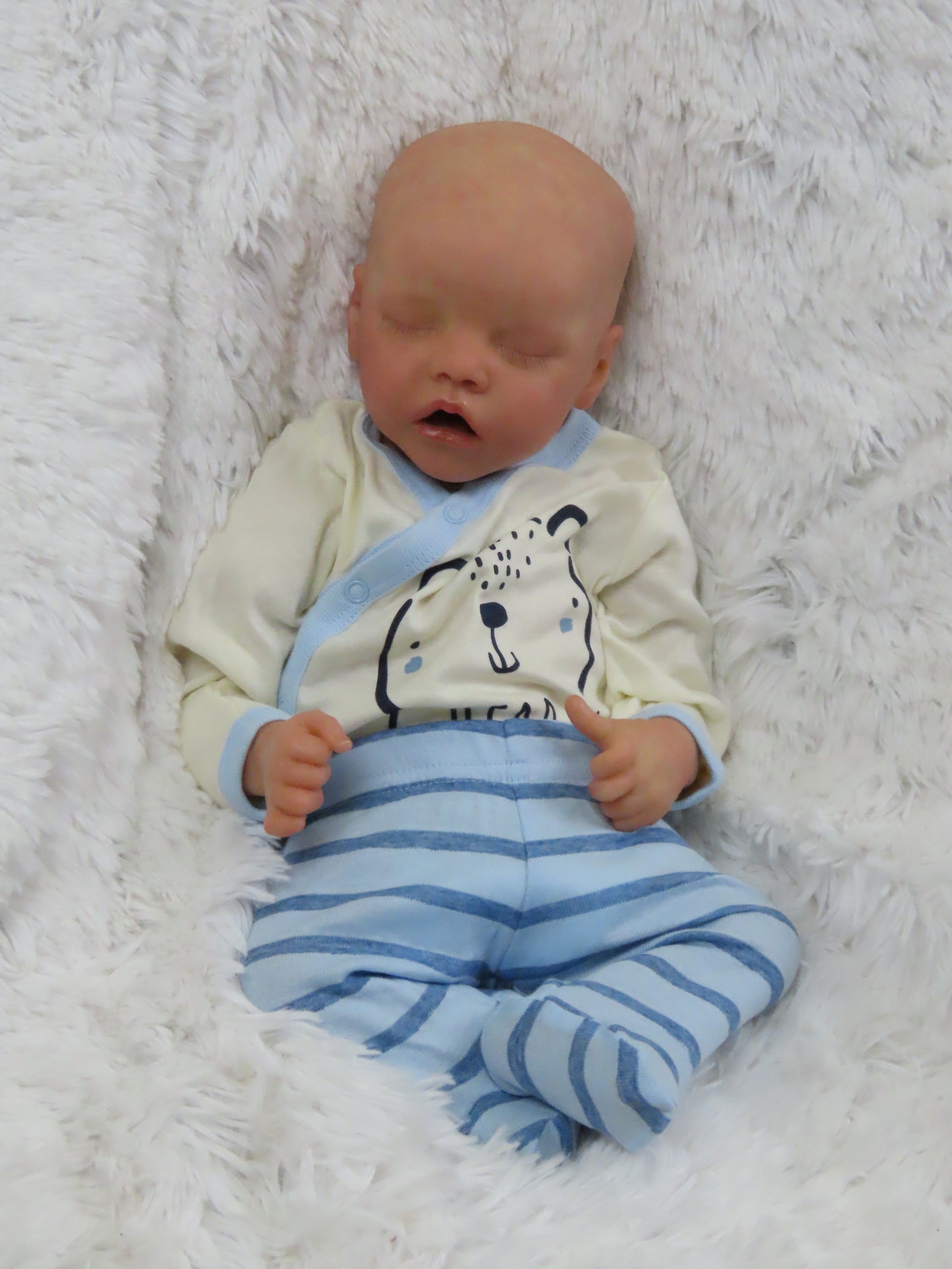 Baby will be reborned by me. He/She will have a Caucasian/White skintone similar to to photos above. He/She will have 3/4 vinyl arms, full vinyl legs, and a flesh colored cloth body, making him/her pose-able. His/her eyelashes will be rooted and sealed inside. His/her nails will be manicured and sealed inside. He/she will be hand-painted with many translucent layers of Ultimate Fusion Paint, including subtle veining and soft mottling, to give him/her his/her lifelike features and making him/her one of a kind. He/she will also be weighted with fine glass beads and ultra soft fiberfill giving him/her that cuddly feel of a real baby