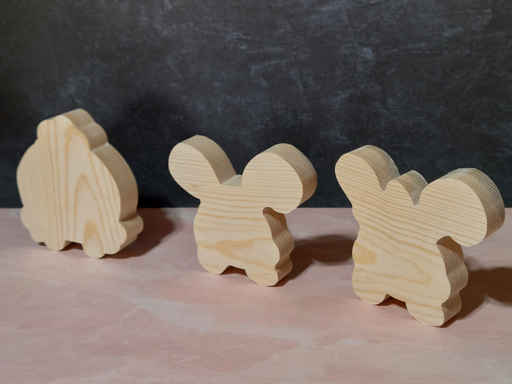 Each shape has been fine sanded on both sides. Edges are not rounded so there will be a crisp edge for painting. All pieces are ready to paint or play with. Shapes are made of solid 3/4" select pine. Each piece of wood is unique and will have a different grain pattern and color.